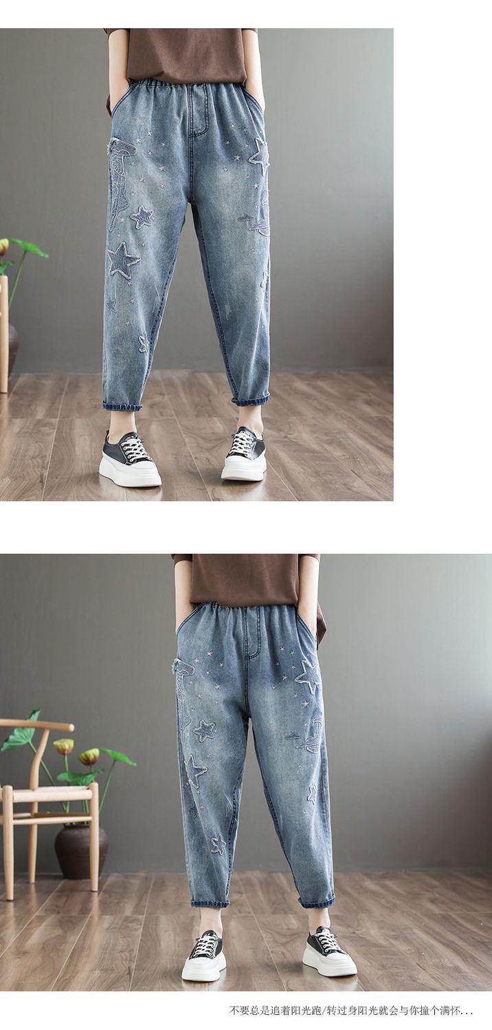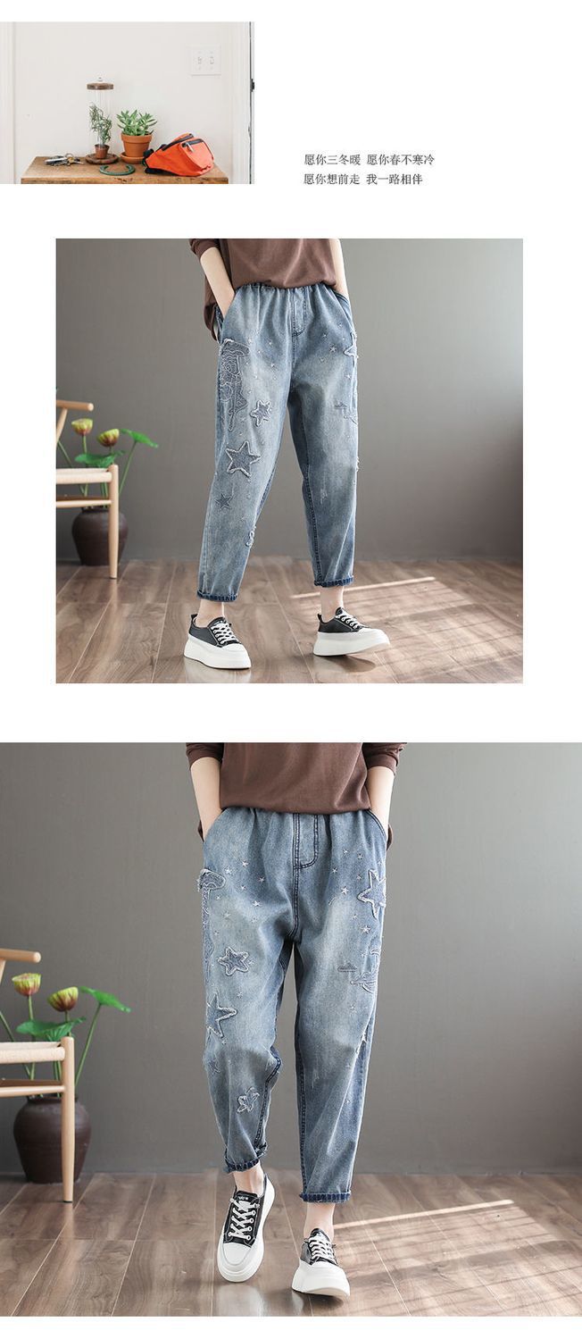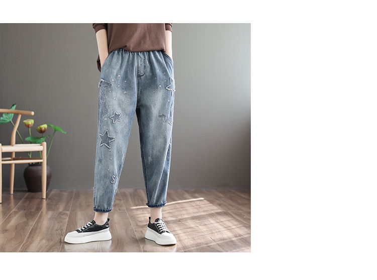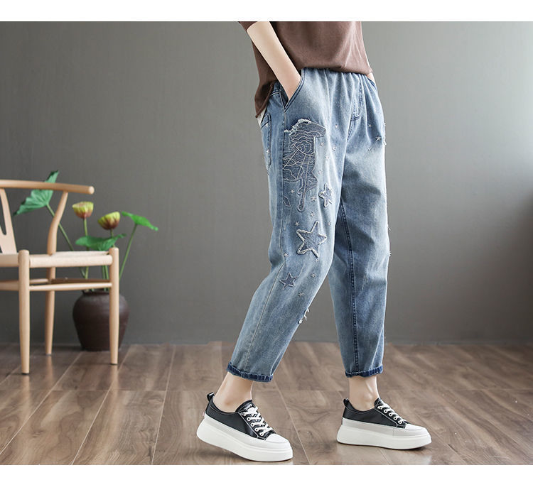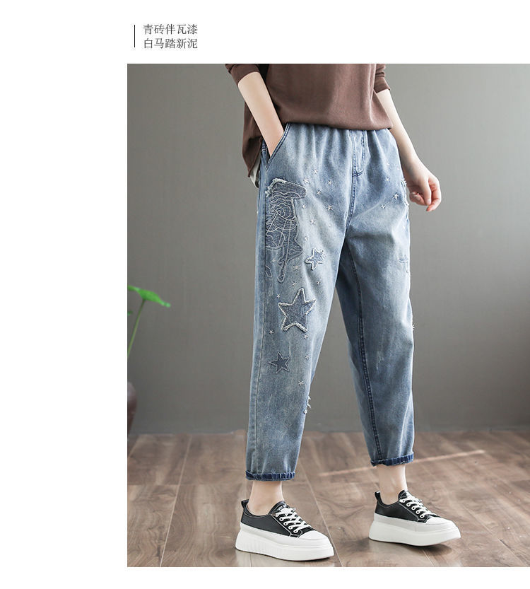 여성용 자수 데님 하렘 팬츠 2025 봄 가을 루즈한 대형 신축성 있는 허리 레트로 디스트레스드 캐주얼 9부 팬츠스토어 가기