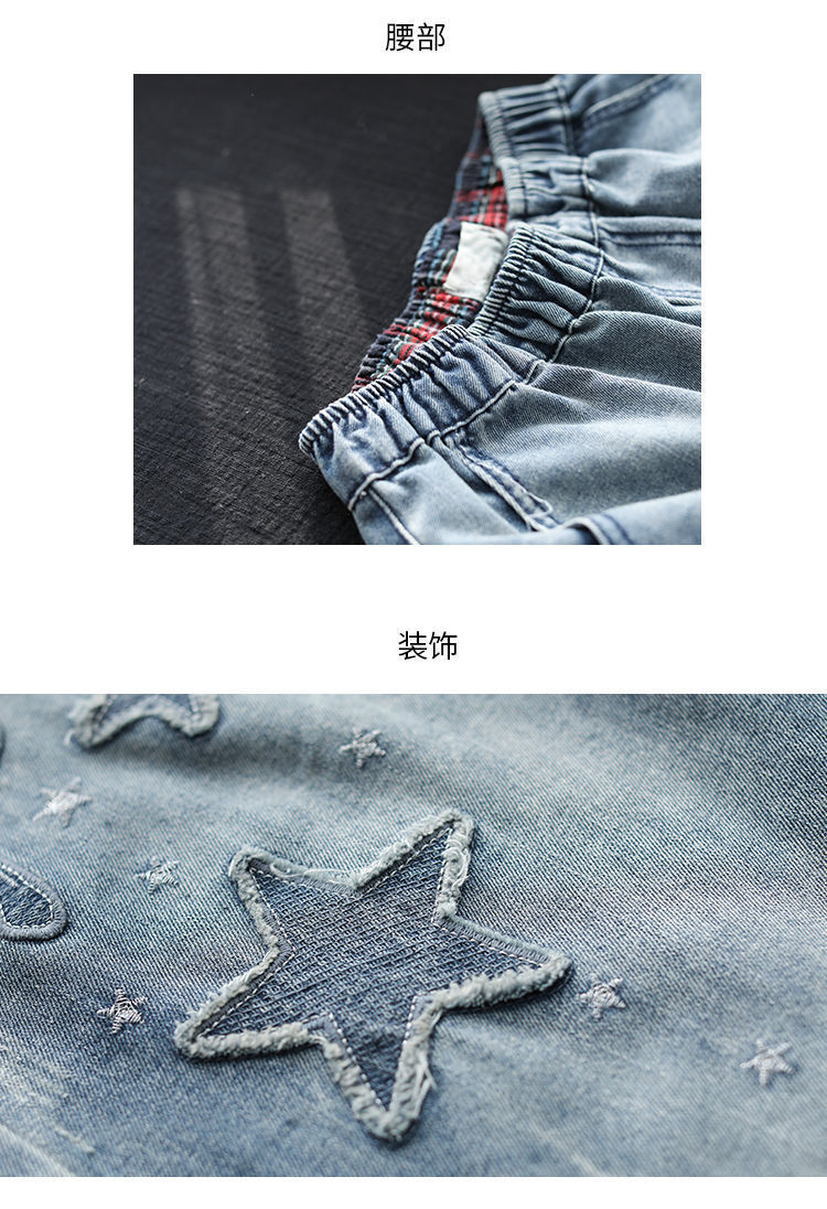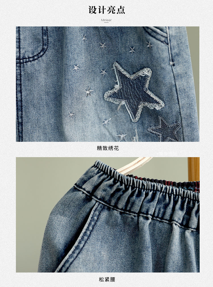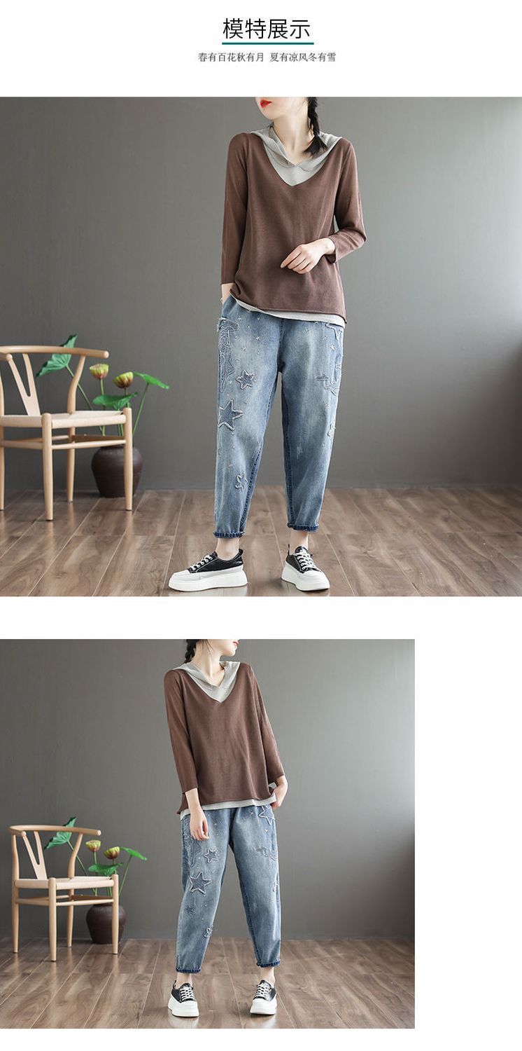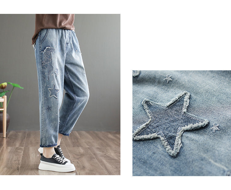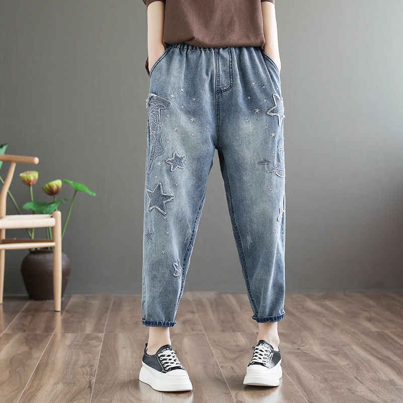 여성용 자수 데님 하렘 팬츠 2025 봄 가을 루즈한 대형 신축성 있는 허리 레트로 디스트레스드 캐주얼 9부 팬츠스토어 가기