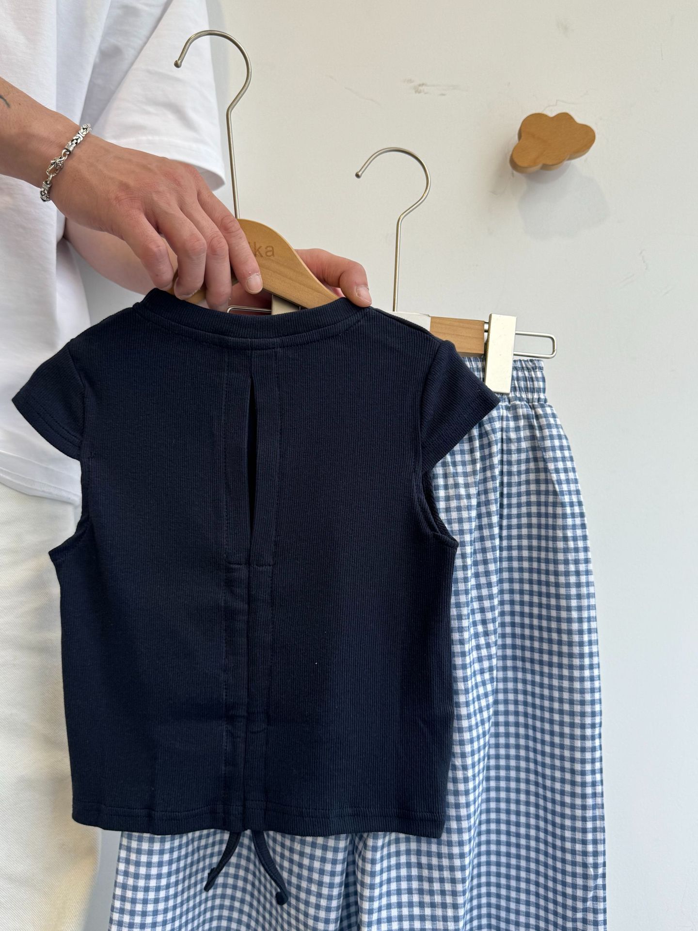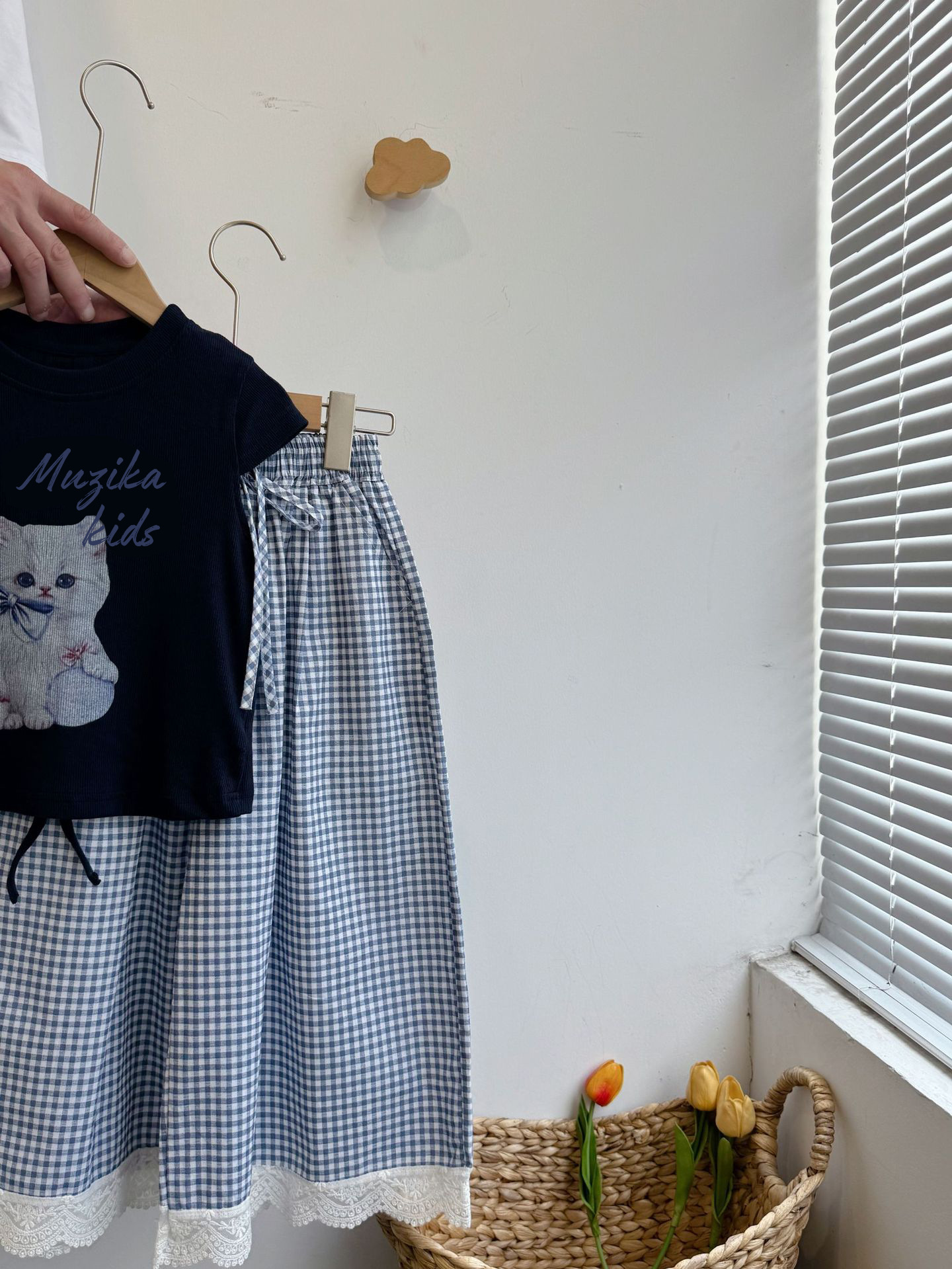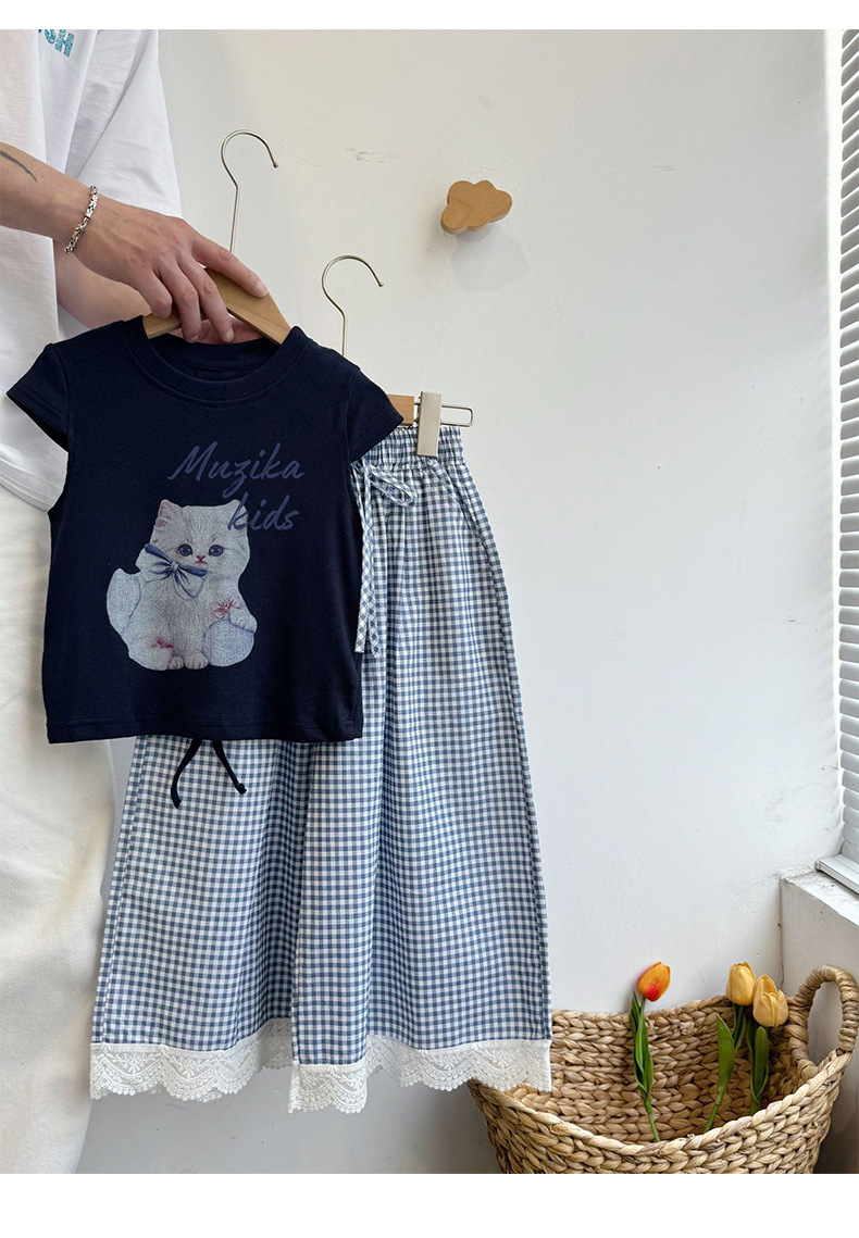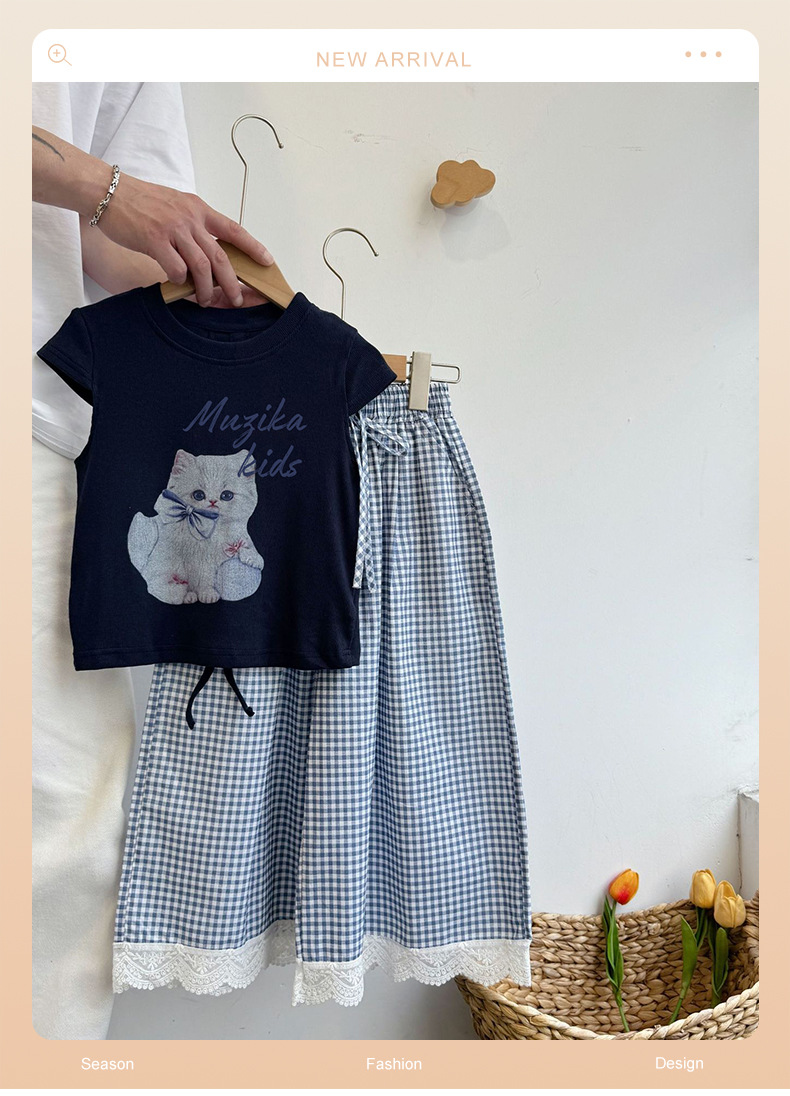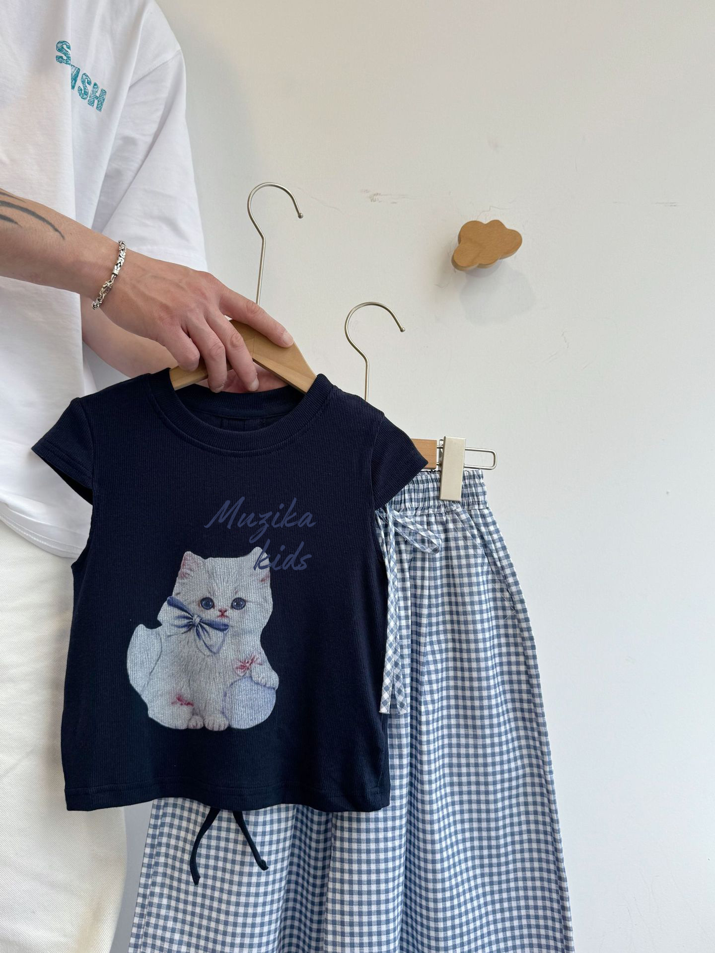 2025년 여름 신상 여아 리본 고양이 프린트 반팔 여아 체크 무늬 와이드 팬츠 투피스 세트