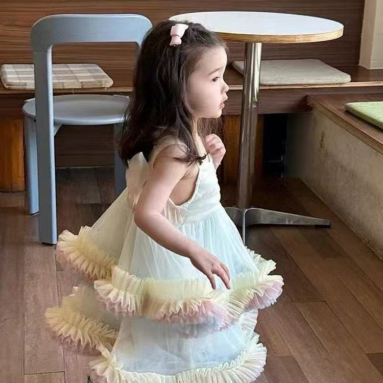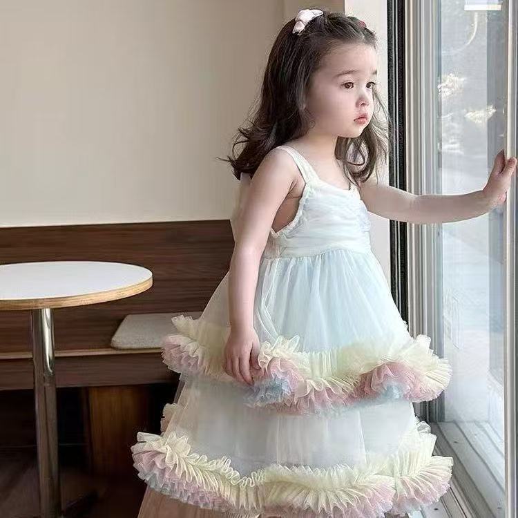 25년 여름 여아용 레인보우 슬립 드레스, 중소 어린이 공주 드레스, 민소매 드레스, 퍼프 메쉬 드레스