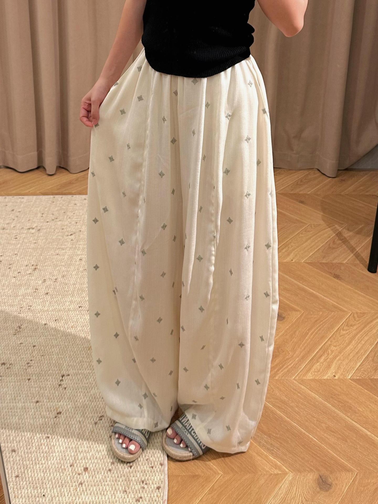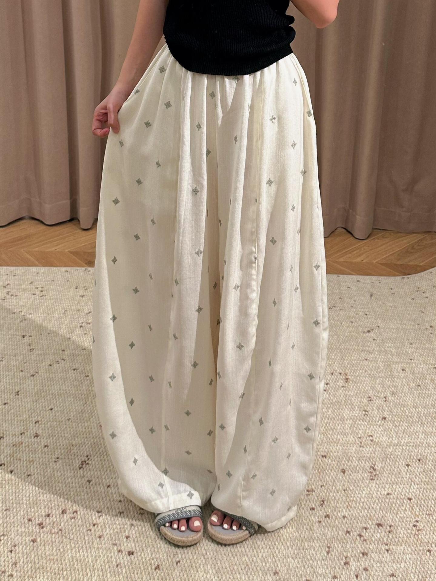 얼음 실크 느낌! 고급 자수 린넨 넓은 다리 바지 여성용 여름 새 스타일 작은 캐주얼 느슨한 얇은 바지스토어 가기