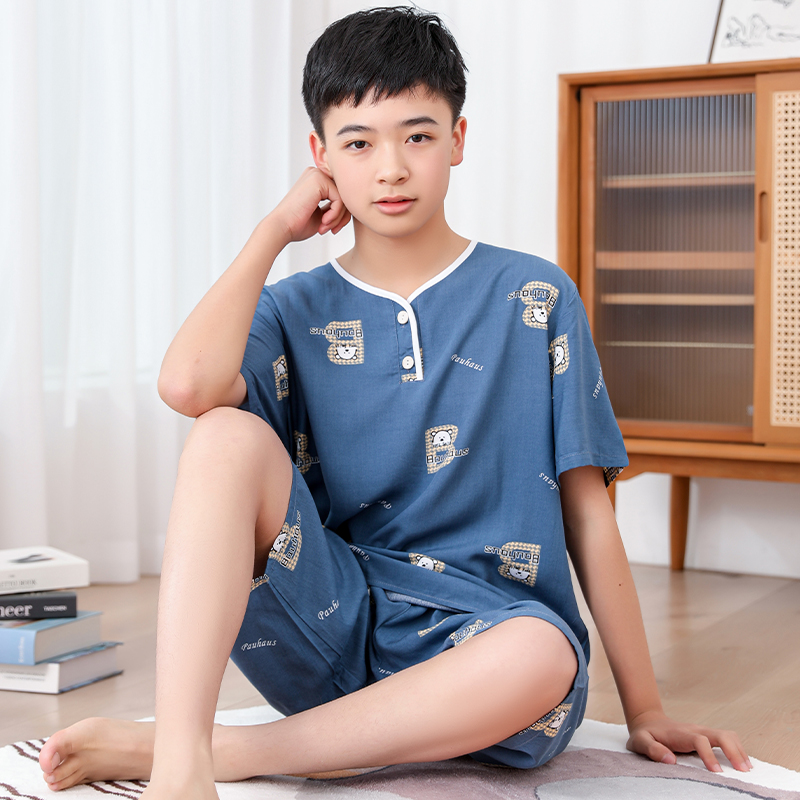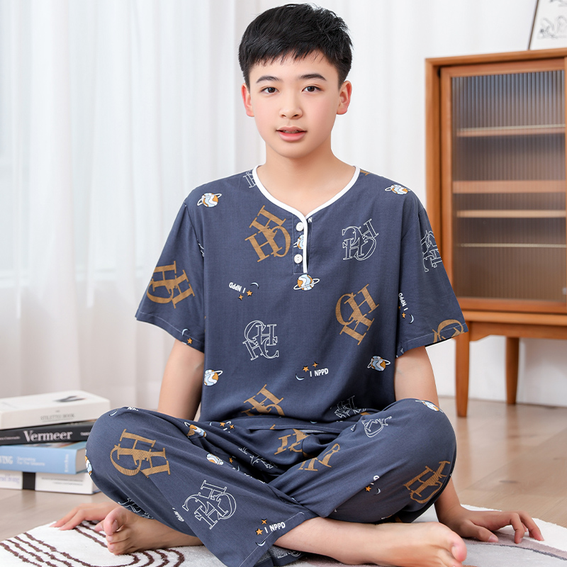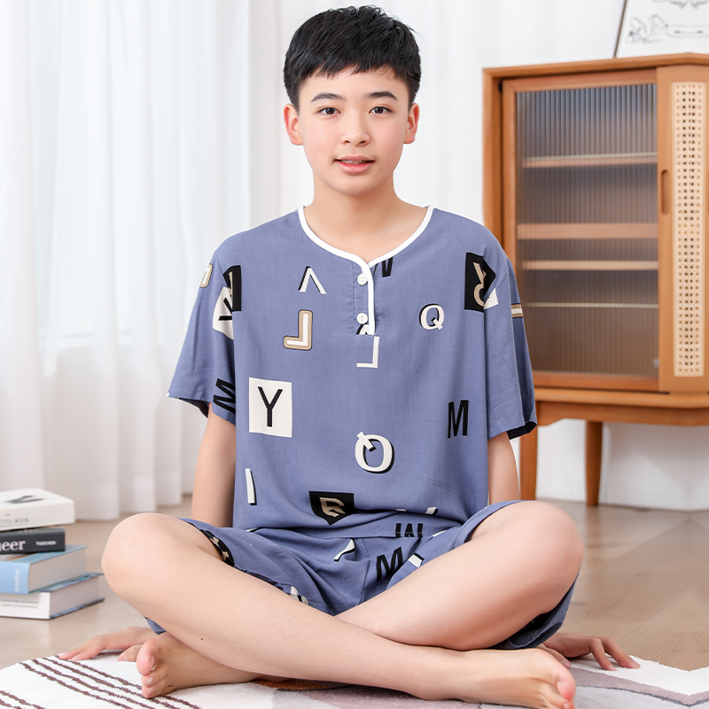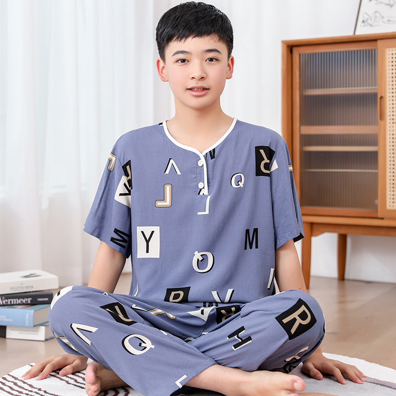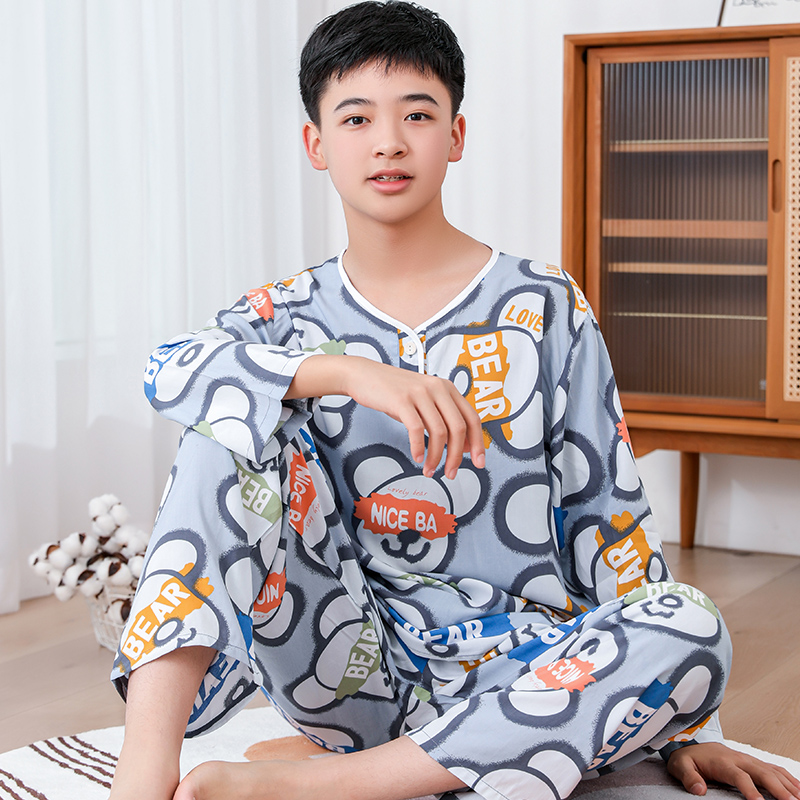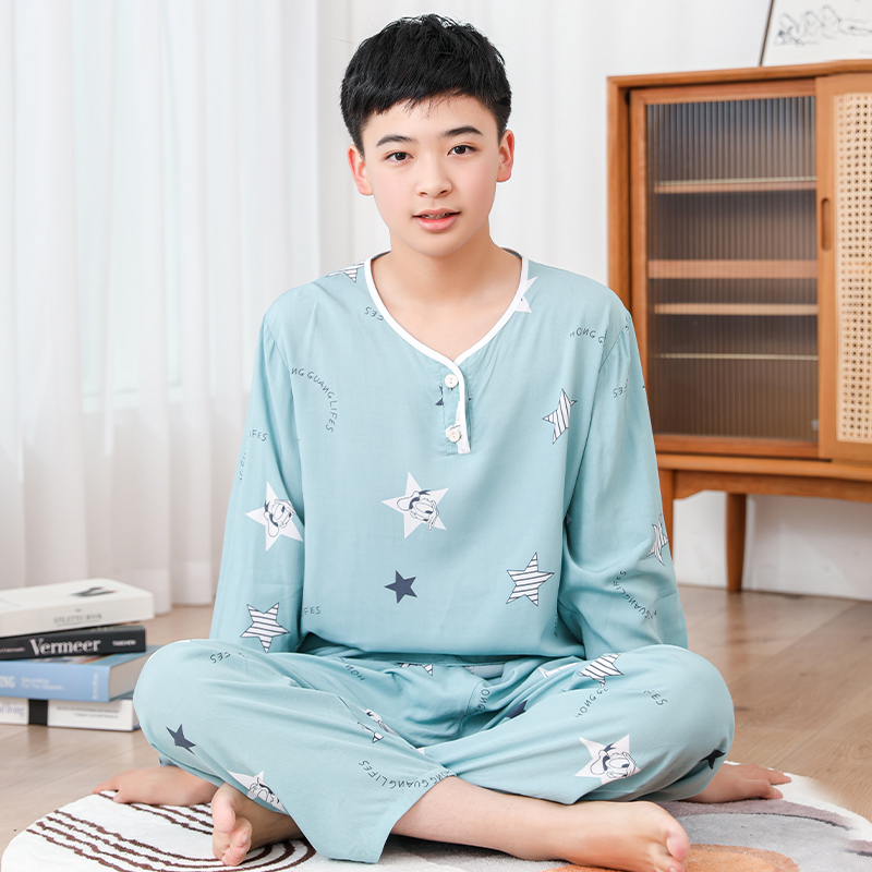 청소년 면 실크 잠옷 소년 여름 긴팔 중학생 가정복 학생 큰 어린이 인공 면 양복