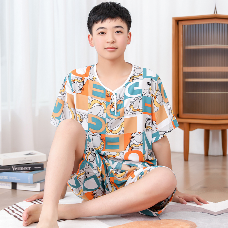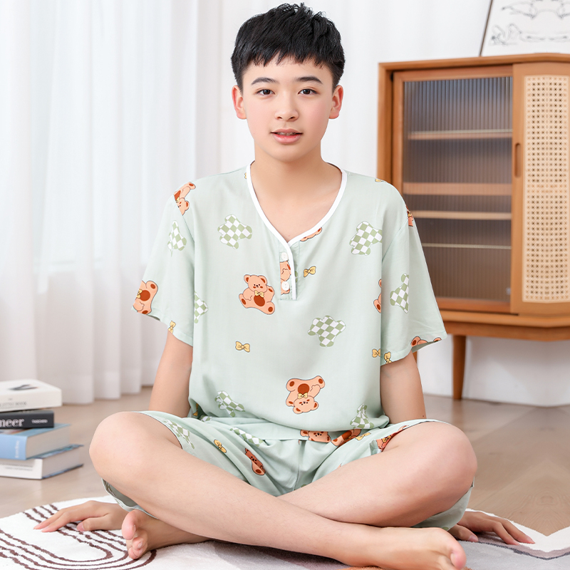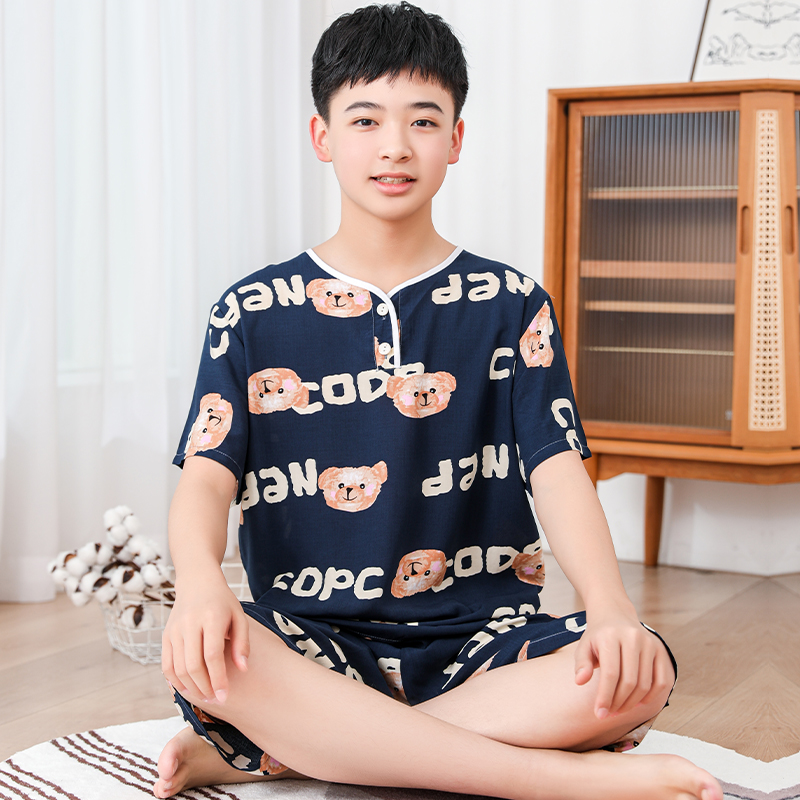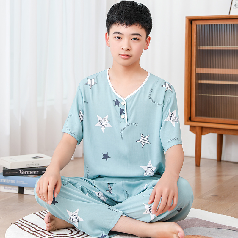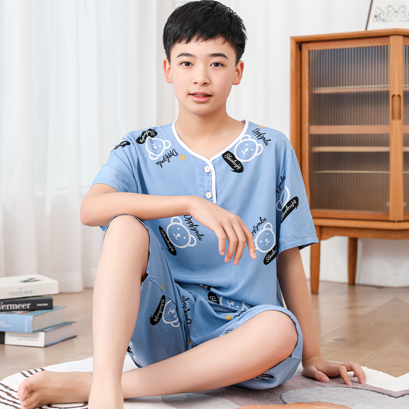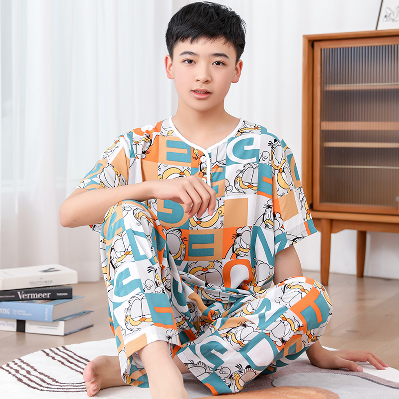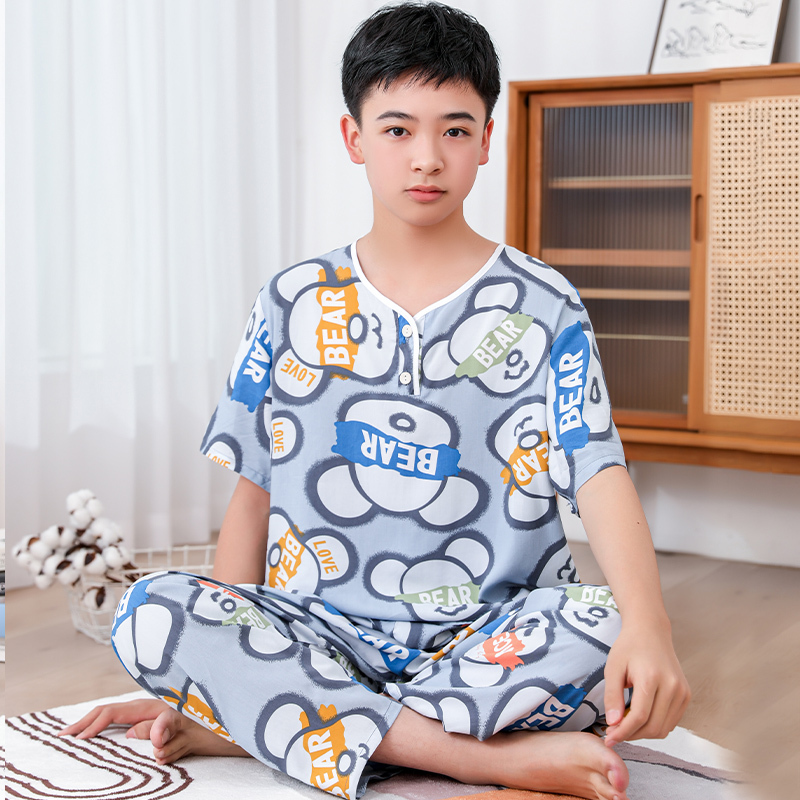청소년 면 실크 잠옷 소년 여름 긴팔 중학생 가정복 학생 큰 어린이 인공 면 양복