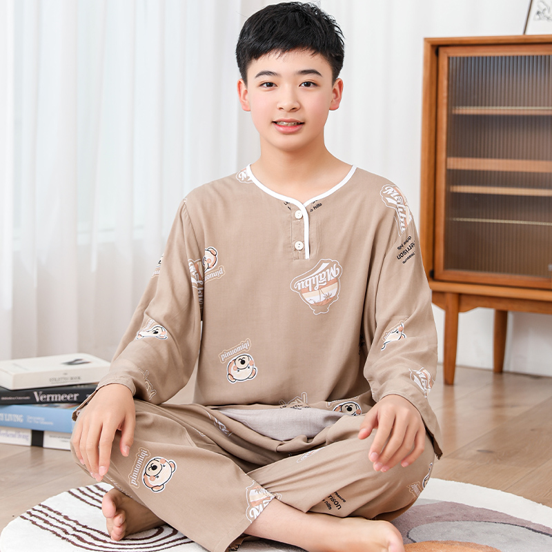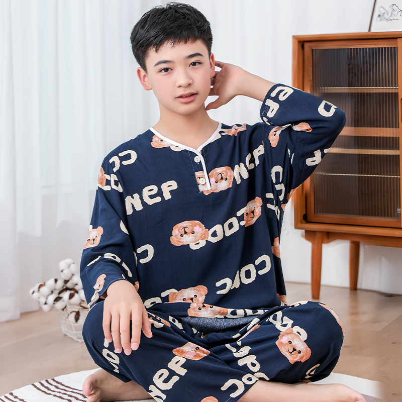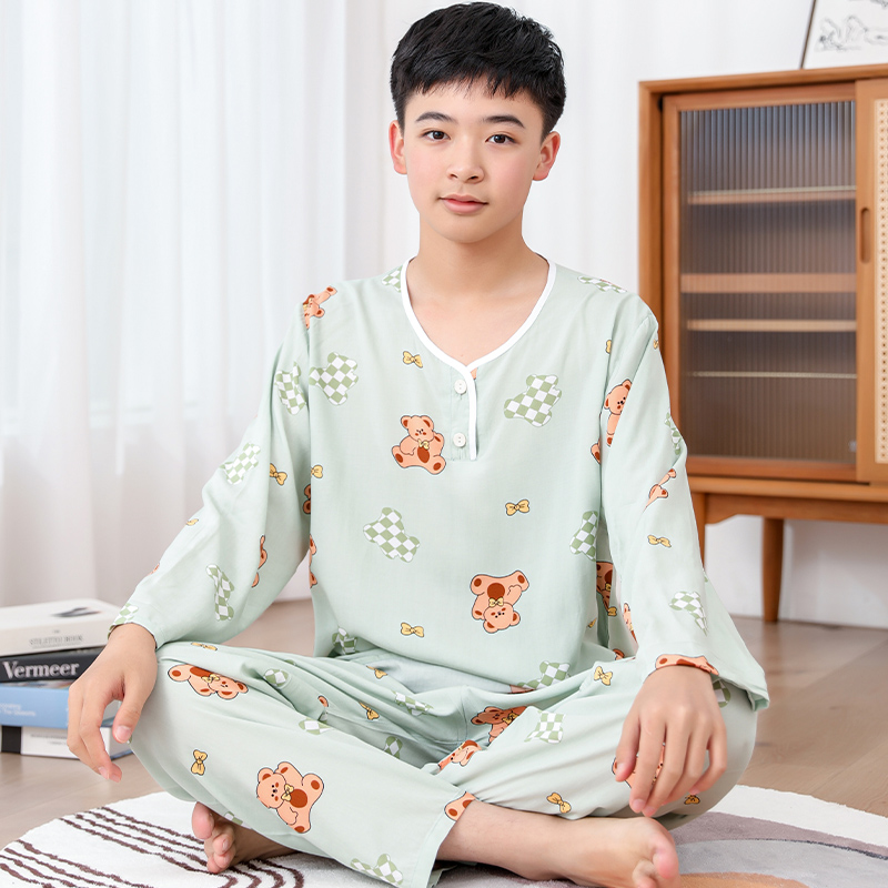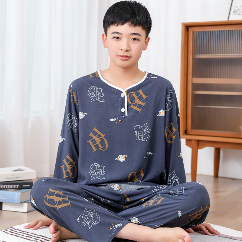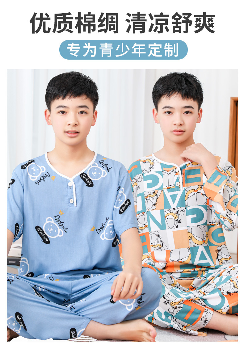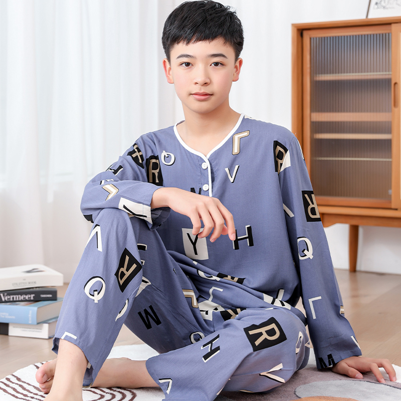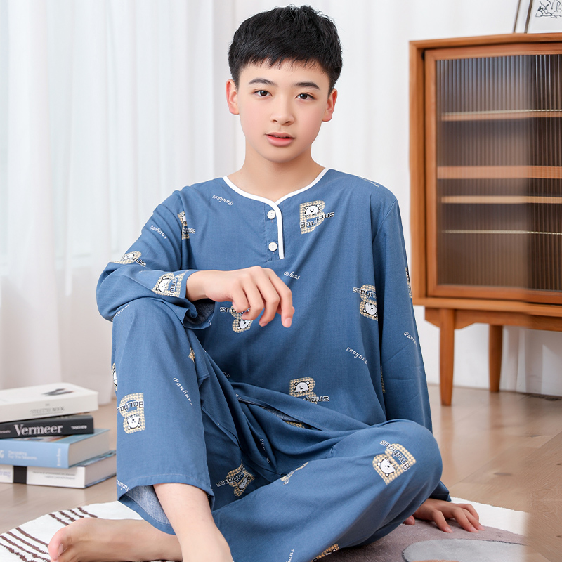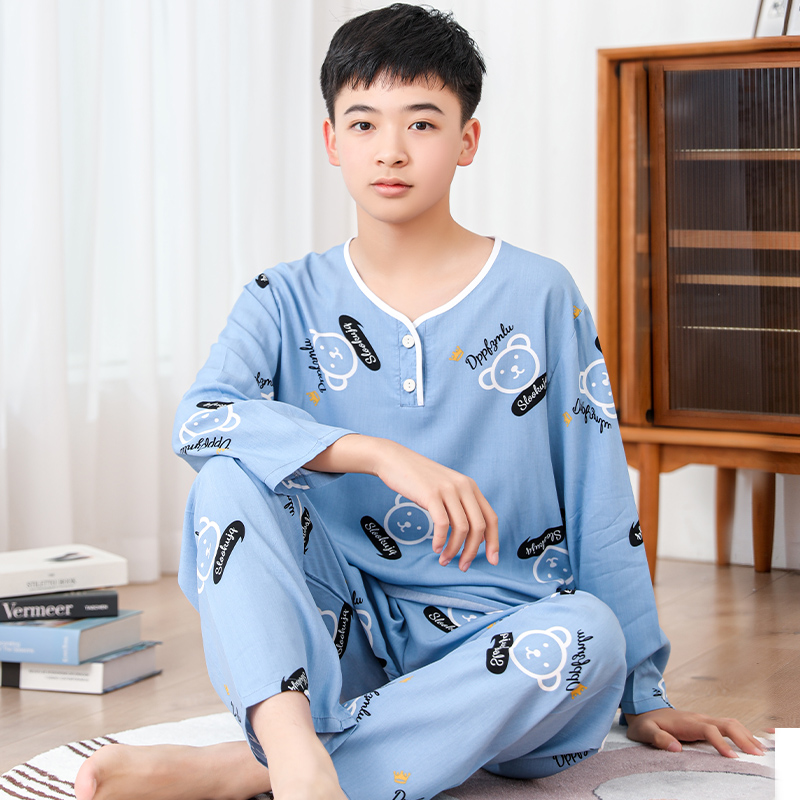 청소년 면 실크 잠옷 소년 여름 긴팔 중학생 가정복 학생 큰 어린이 인공 면 양복스토어 가기