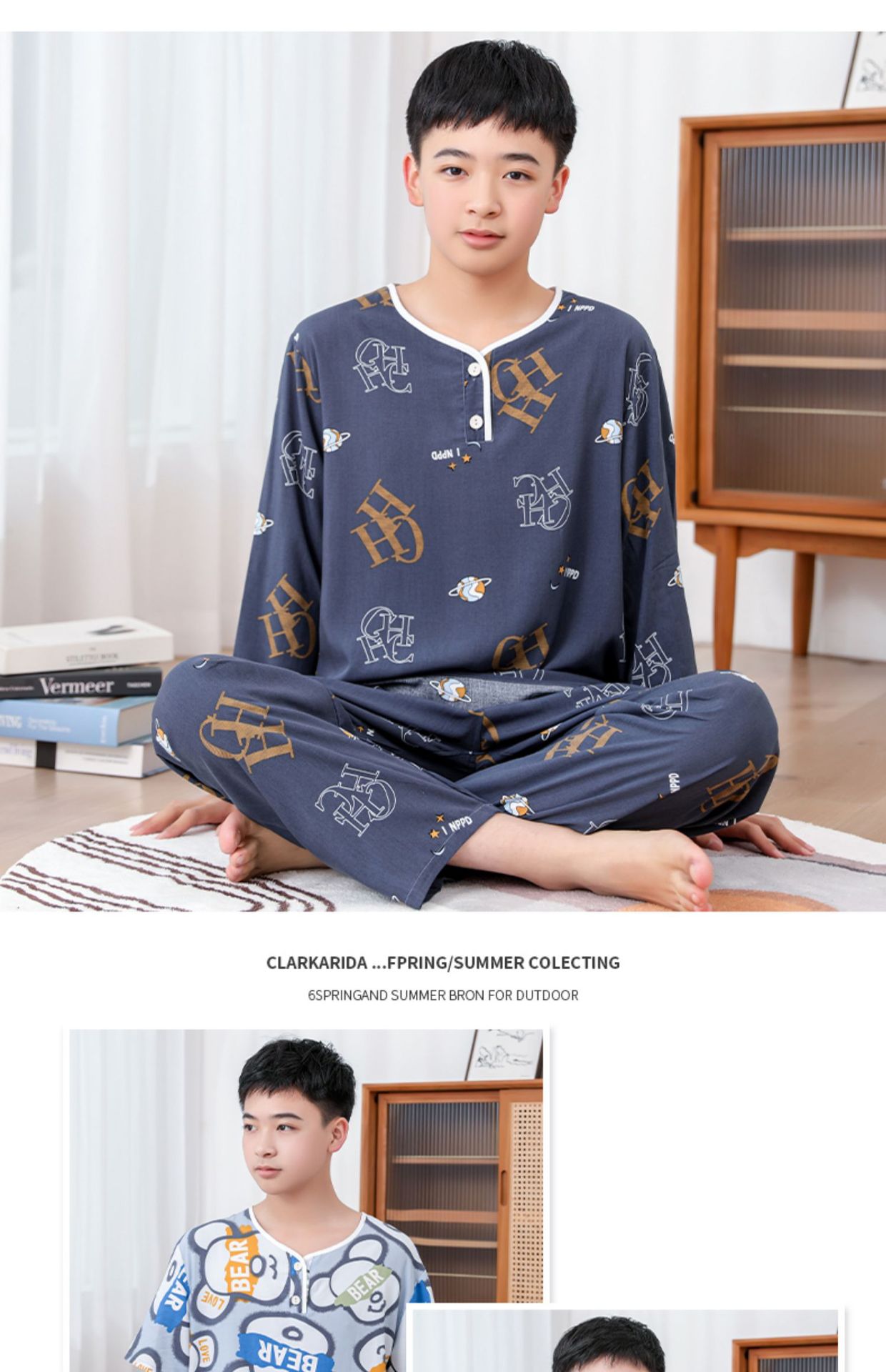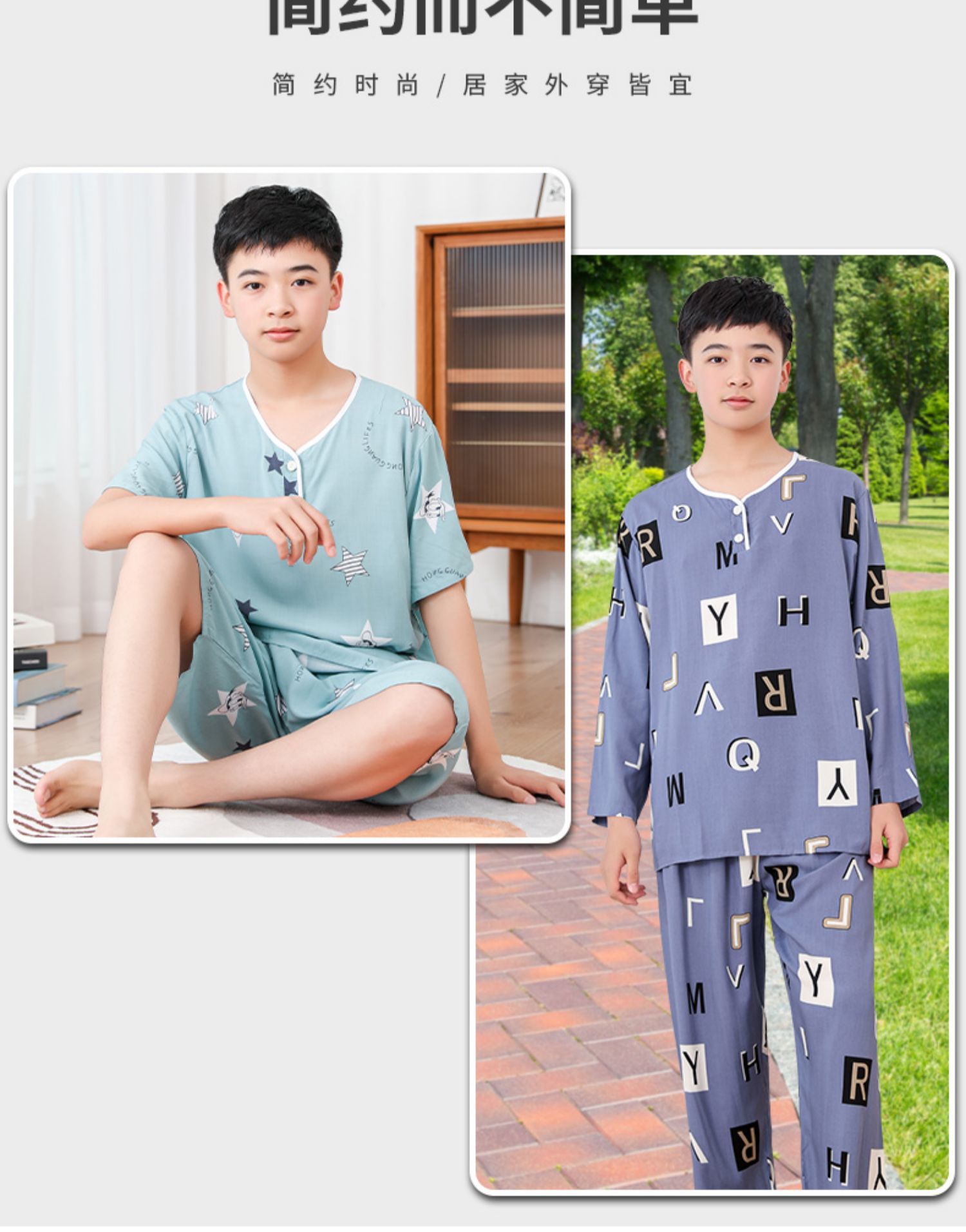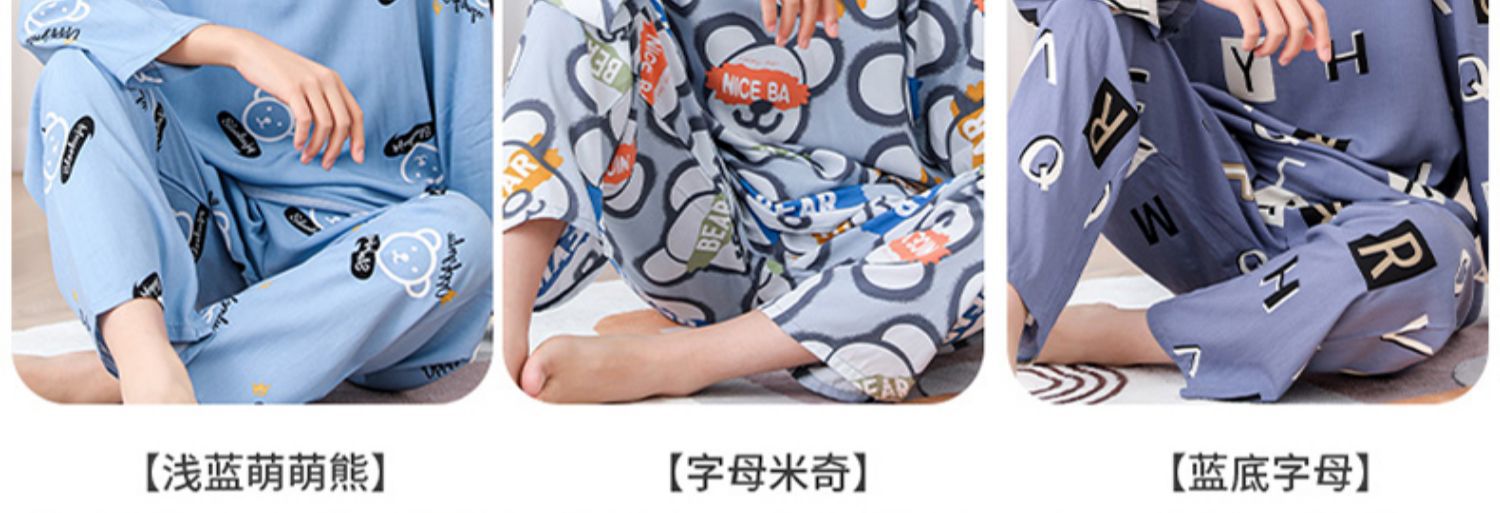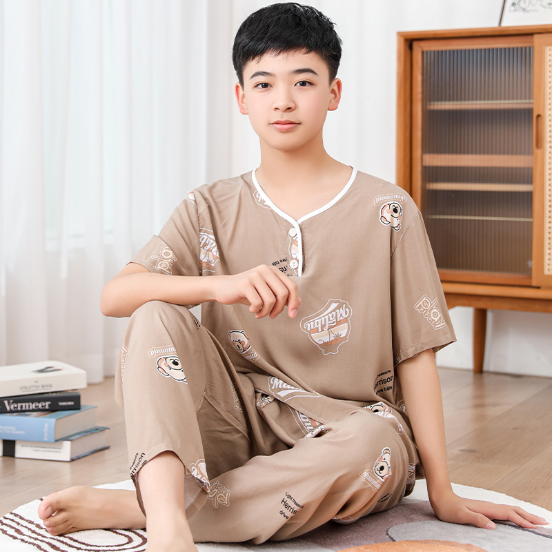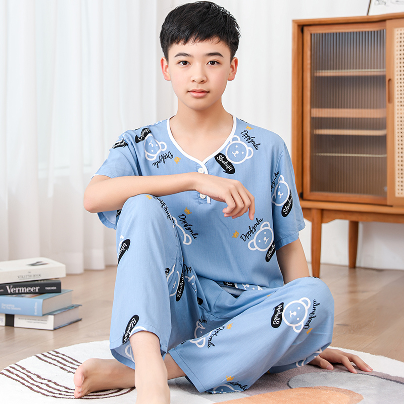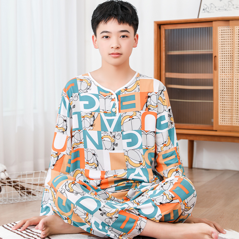 청소년 면 실크 잠옷 소년 여름 긴팔 중학생 가정복 학생 큰 어린이 인공 면 양복스토어 가기