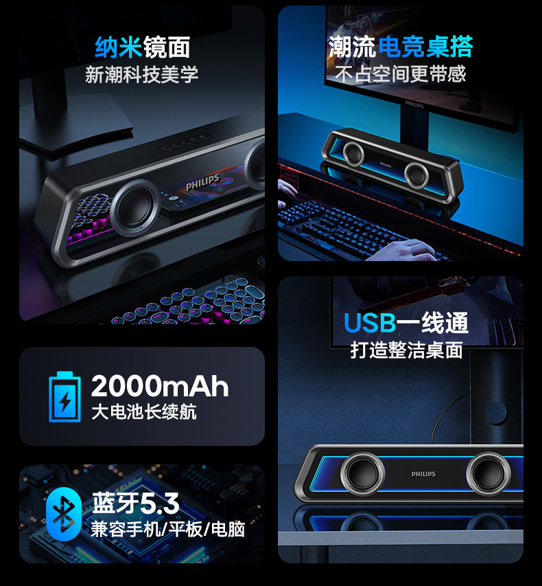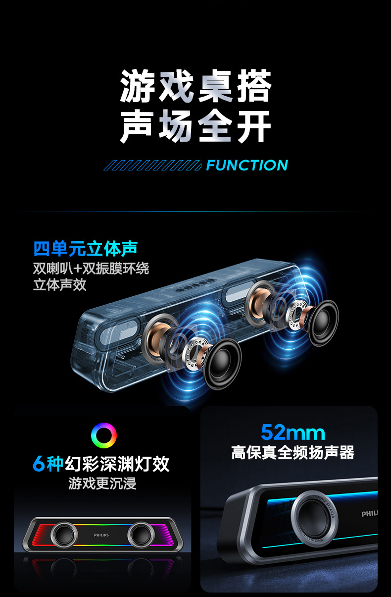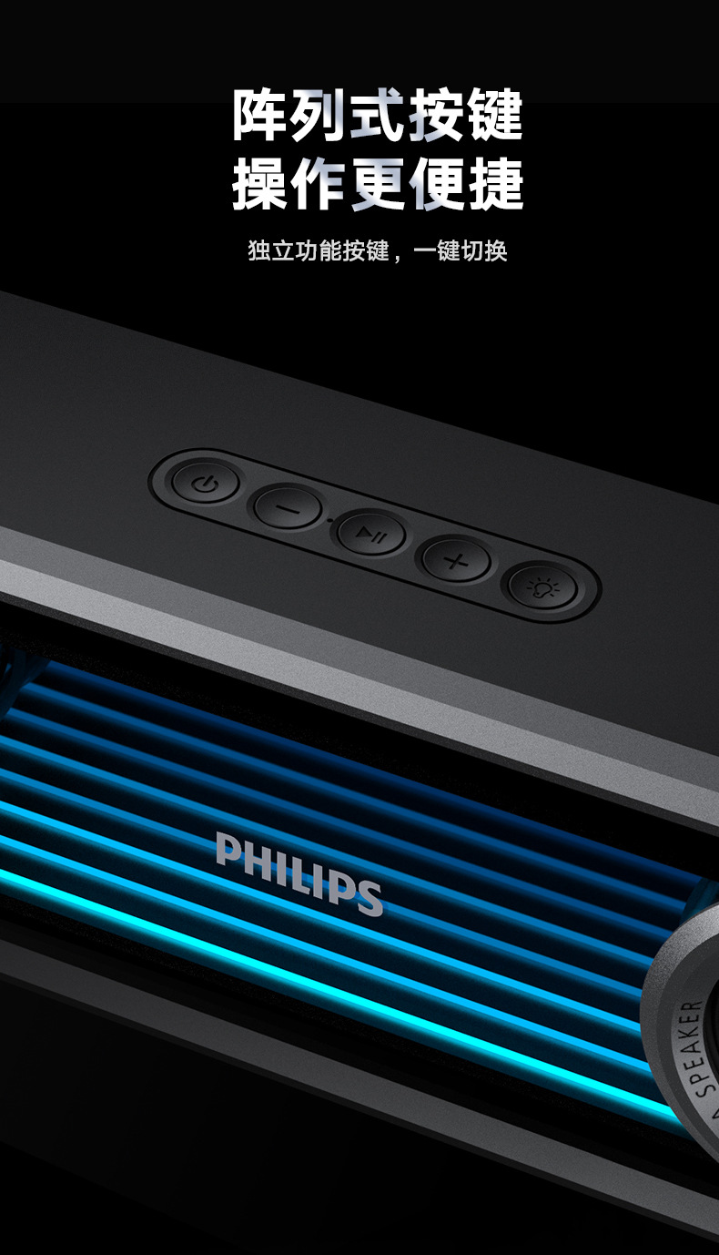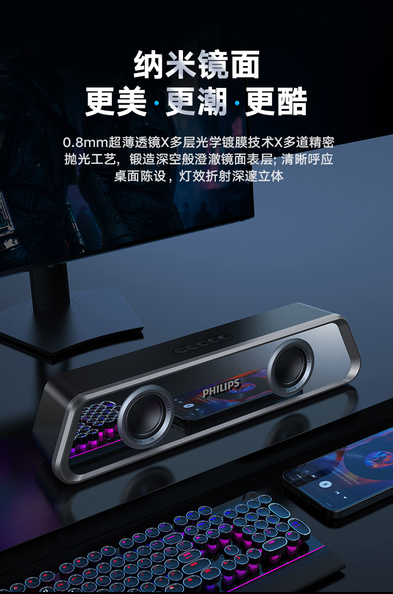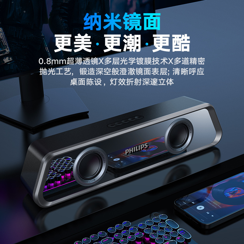 필립스 미러 블루투스 스피커 RGB 조명 효과 긴 스트립 고음역 홈 e-스포츠 게임 오픈 블랙 스피커
