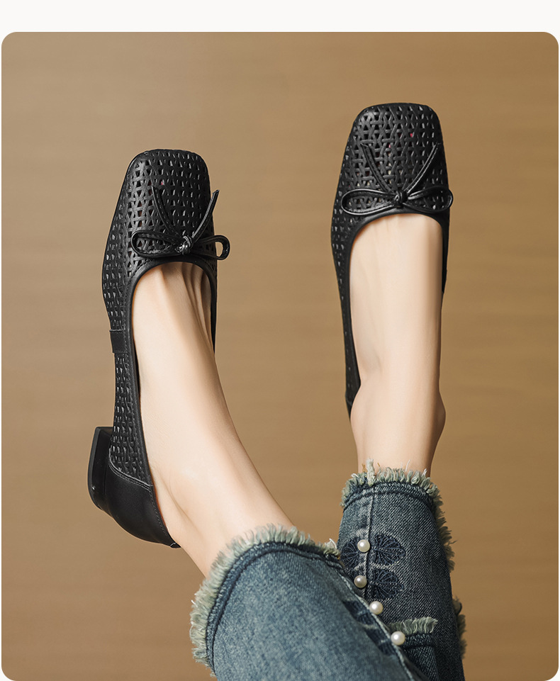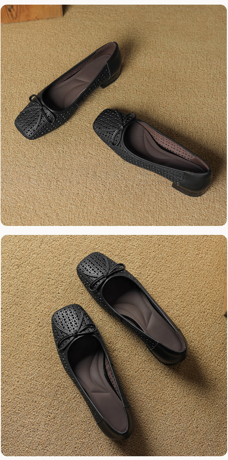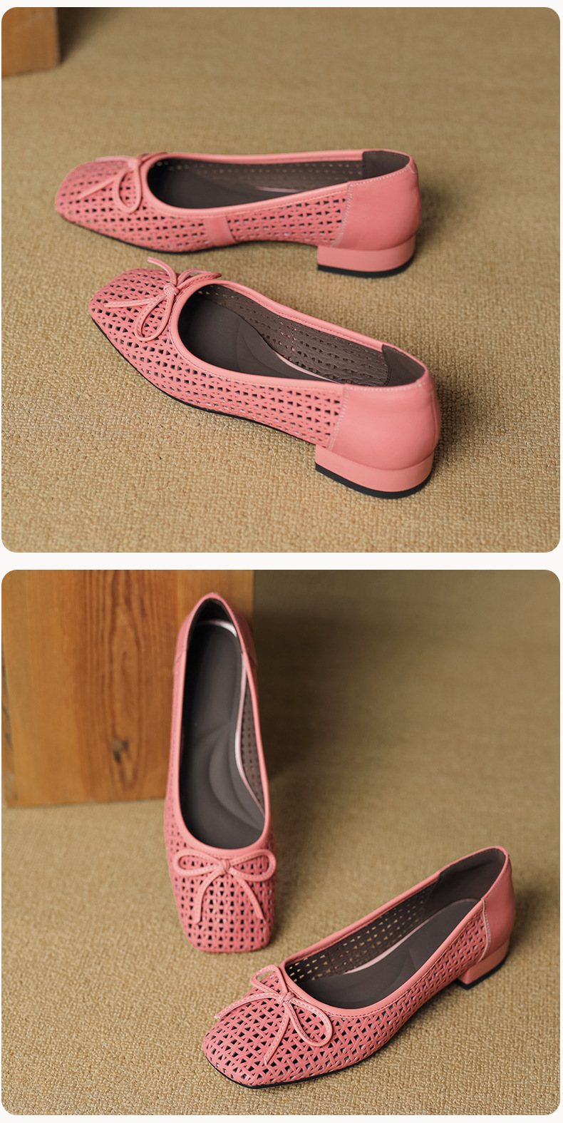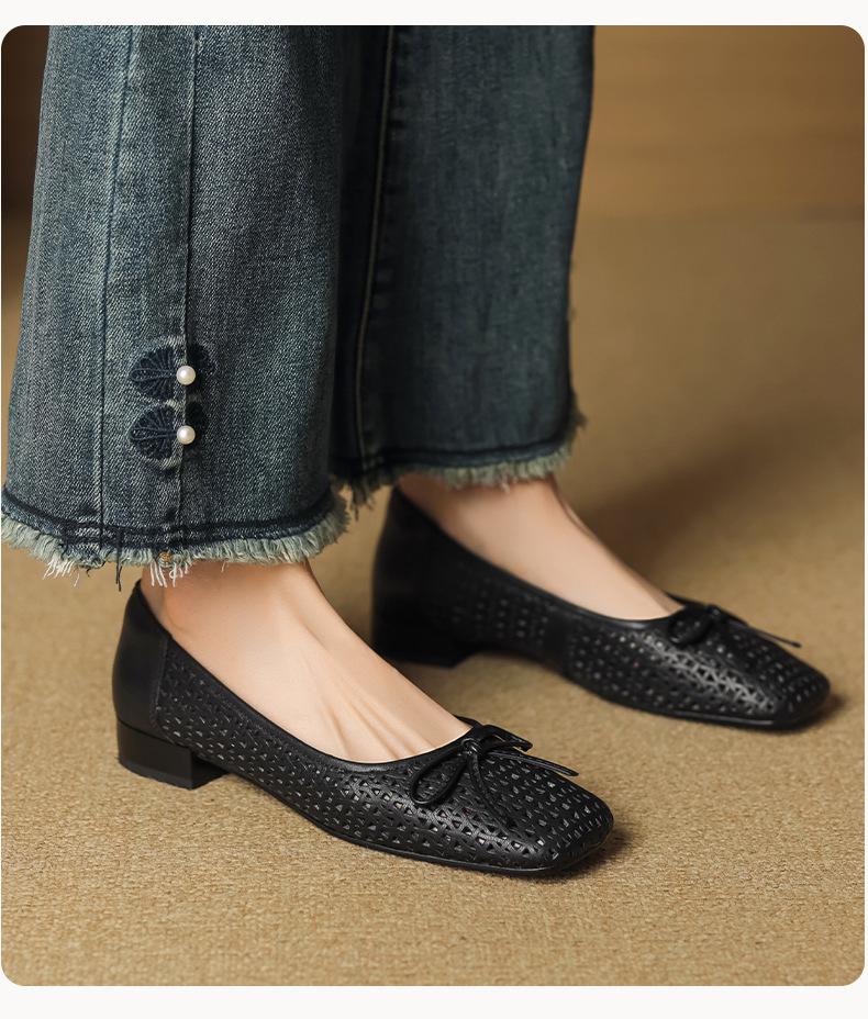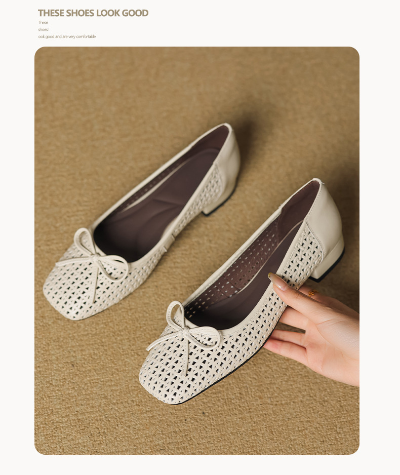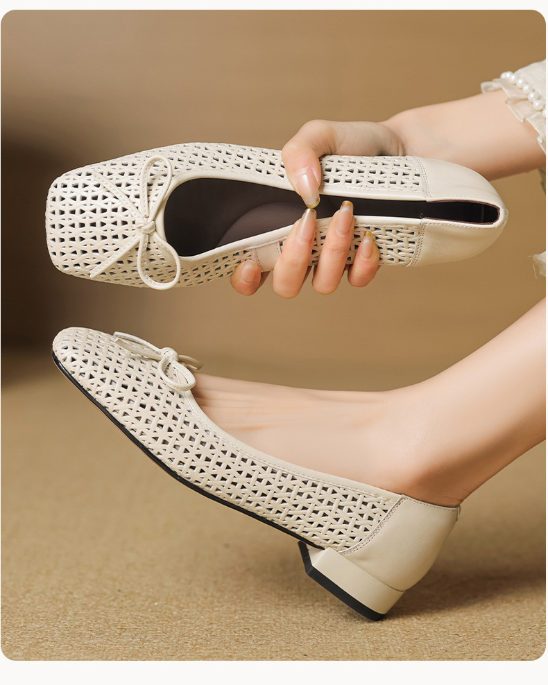 소 가죽 프랑스 활 사각형 발가락 신발의 첫 번째 레이어 여성용 속이 빈 낮은 발 뒤꿈치 비니 신발 두꺼운 힐 Mary Jane 신발 플랫 슈즈