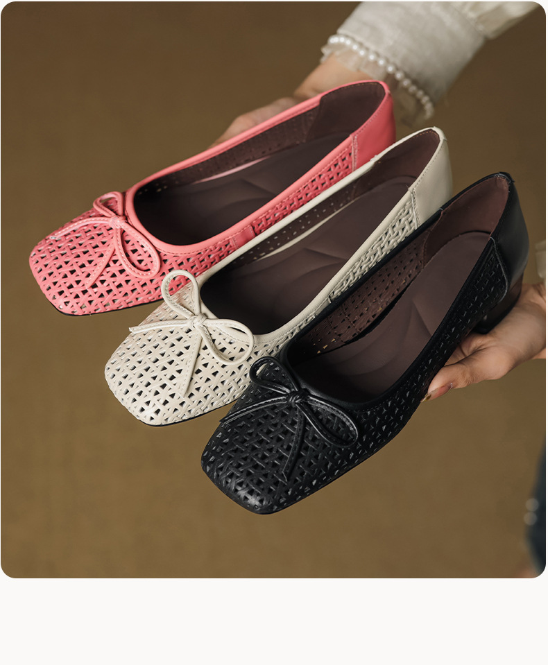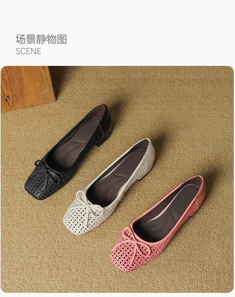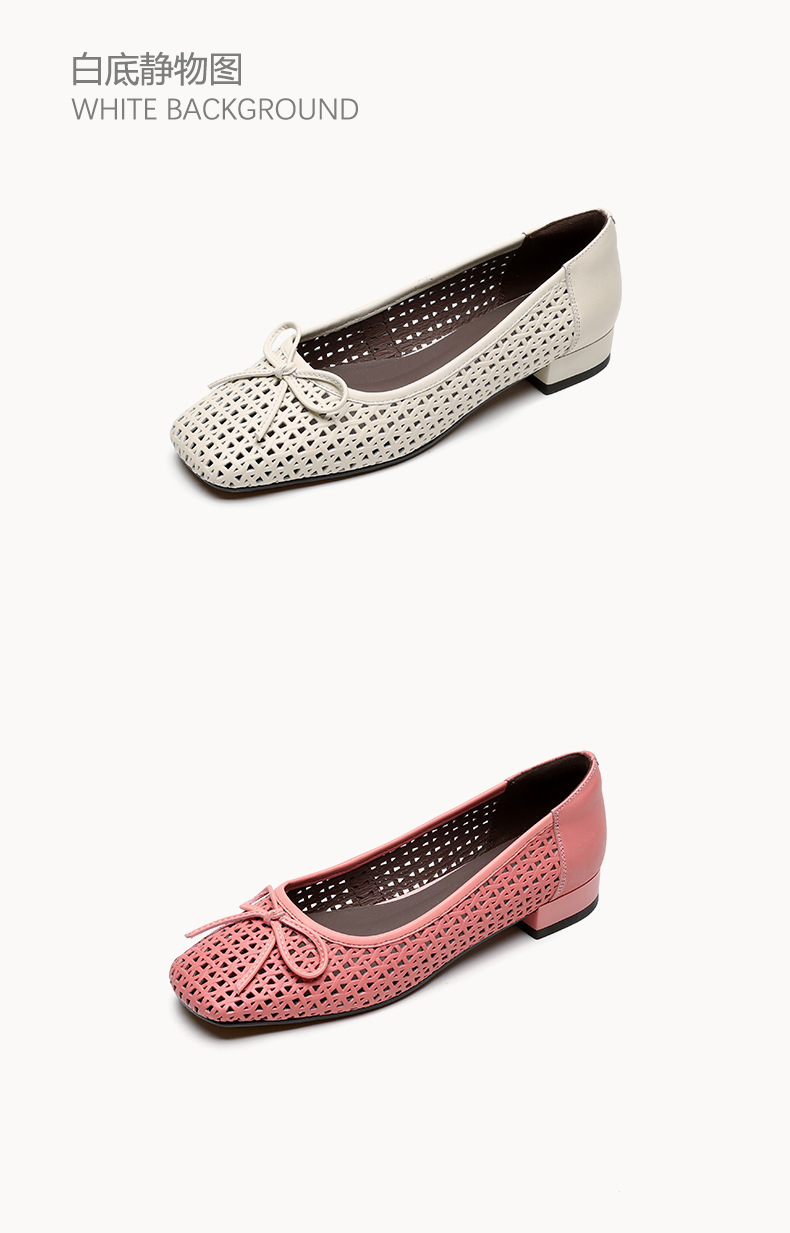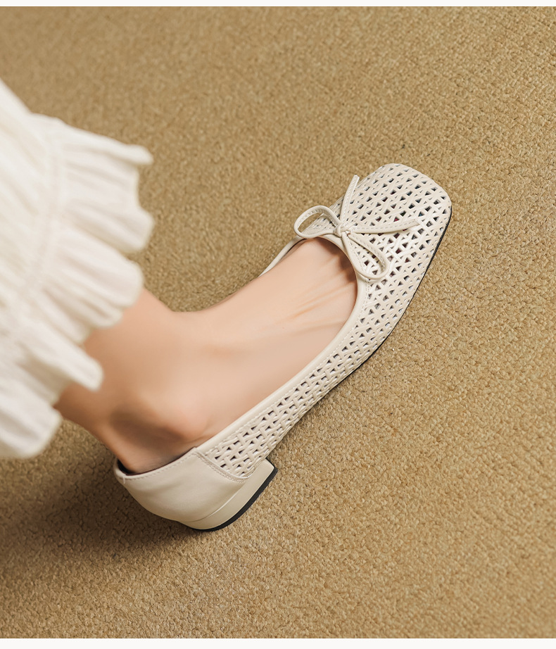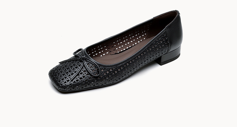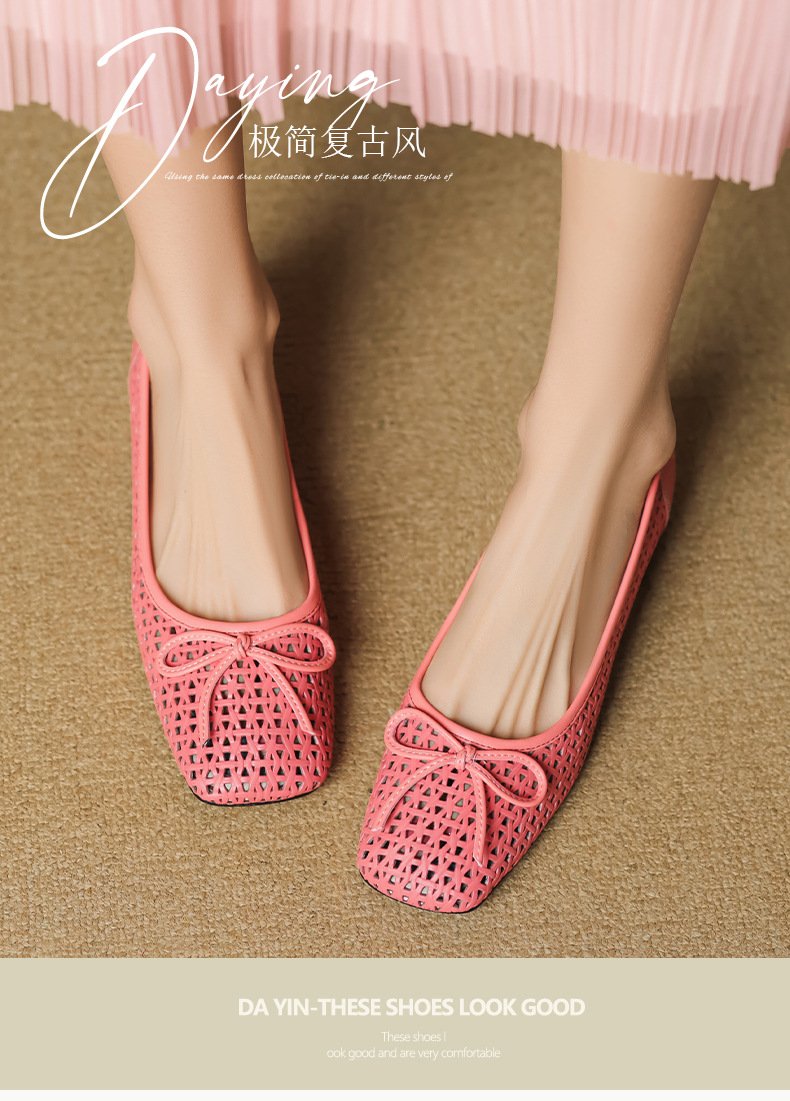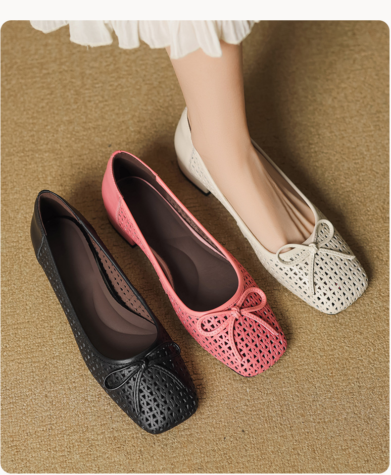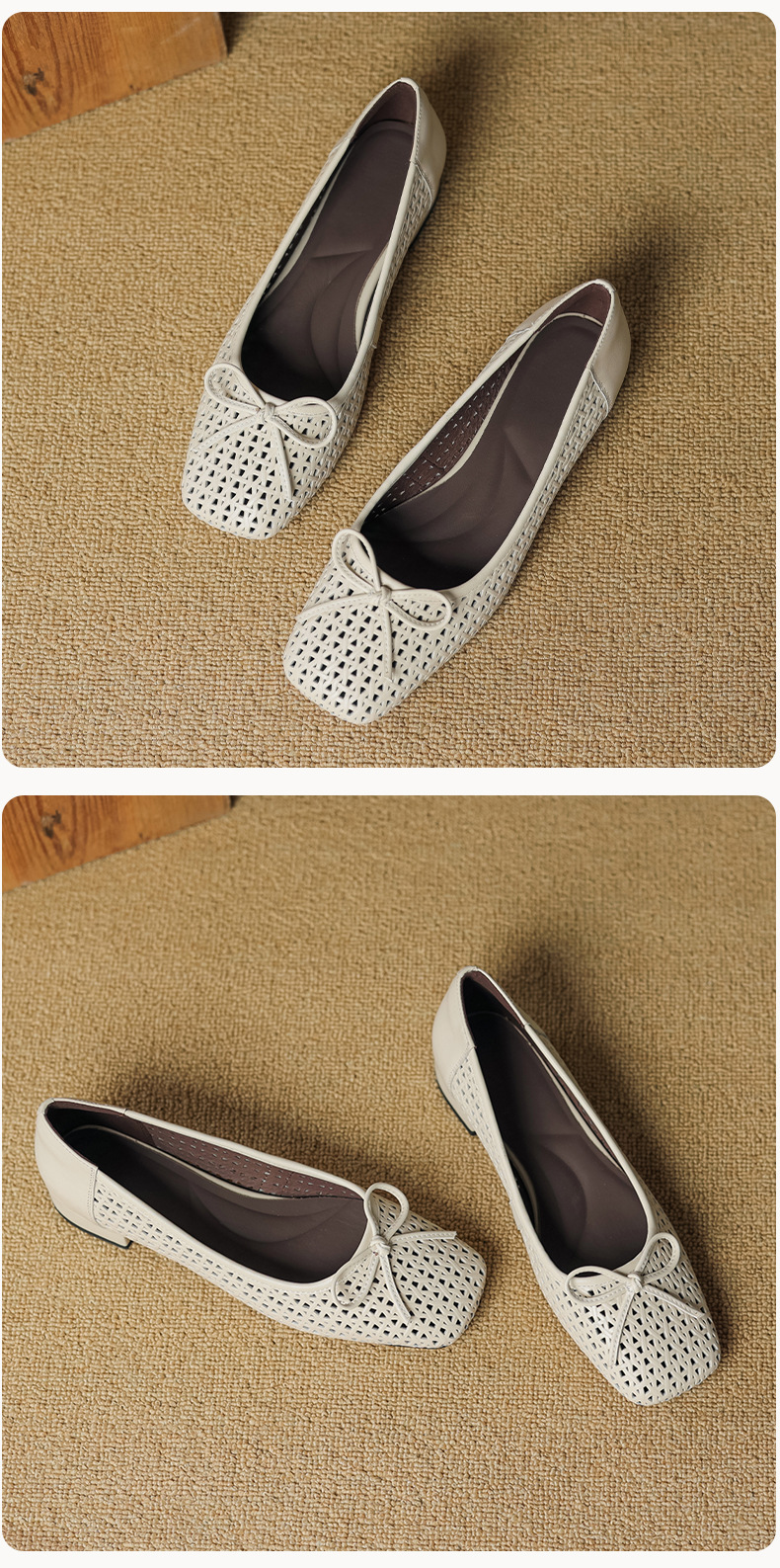 소 가죽 프랑스 활 사각형 발가락 신발의 첫 번째 레이어 여성용 속이 빈 낮은 발 뒤꿈치 비니 신발 두꺼운 힐 Mary Jane 신발 플랫 슈즈