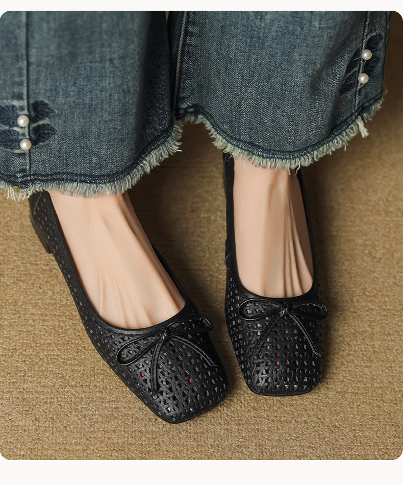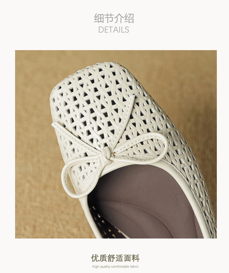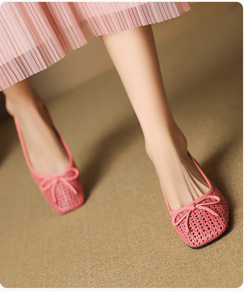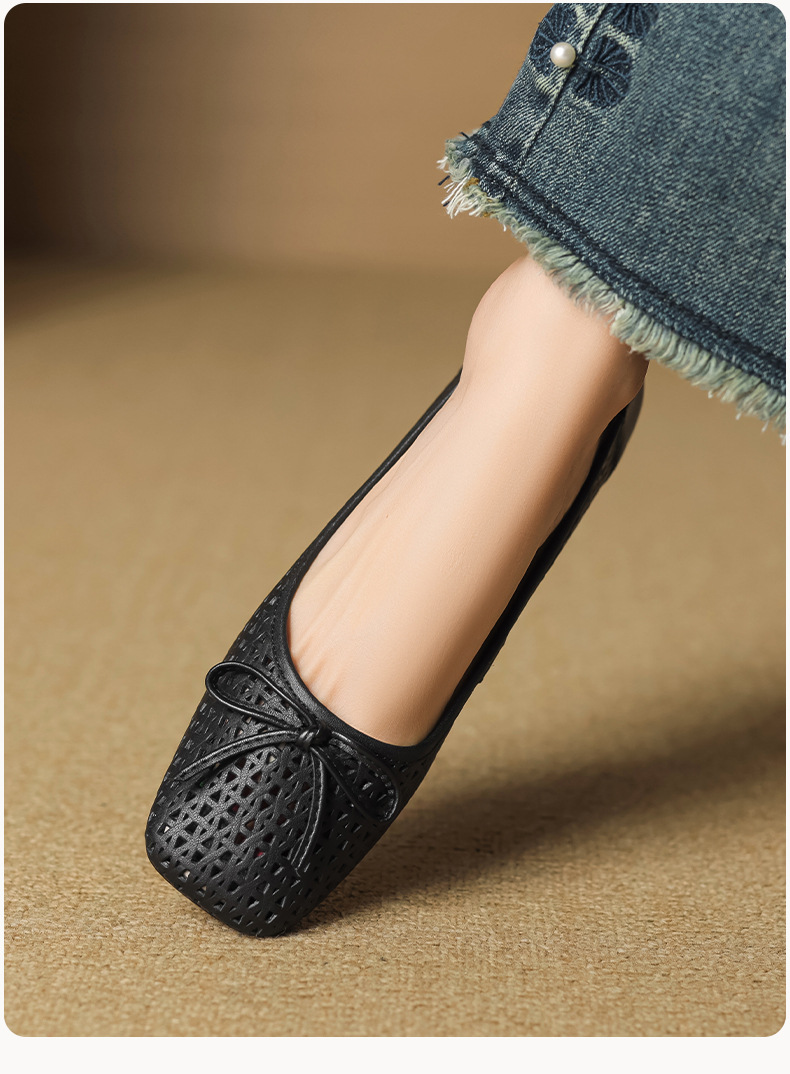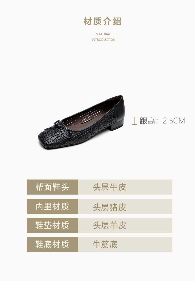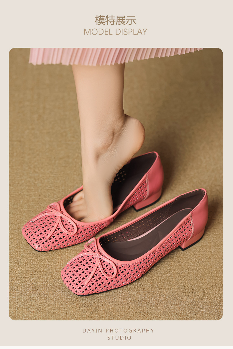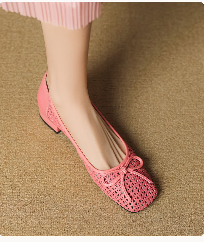 소 가죽 프랑스 활 사각형 발가락 신발의 첫 번째 레이어 여성용 속이 빈 낮은 발 뒤꿈치 비니 신발 두꺼운 힐 Mary Jane 신발 플랫 슈즈
