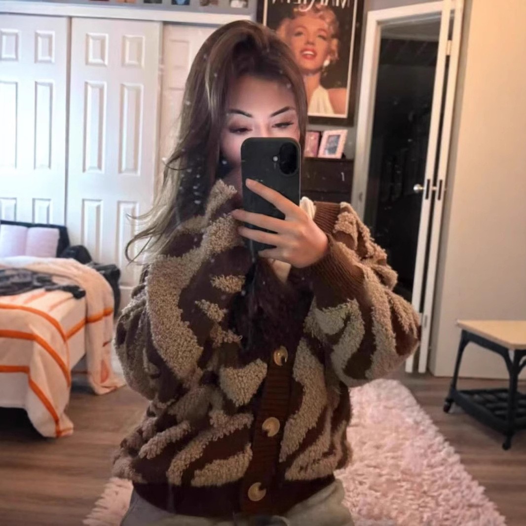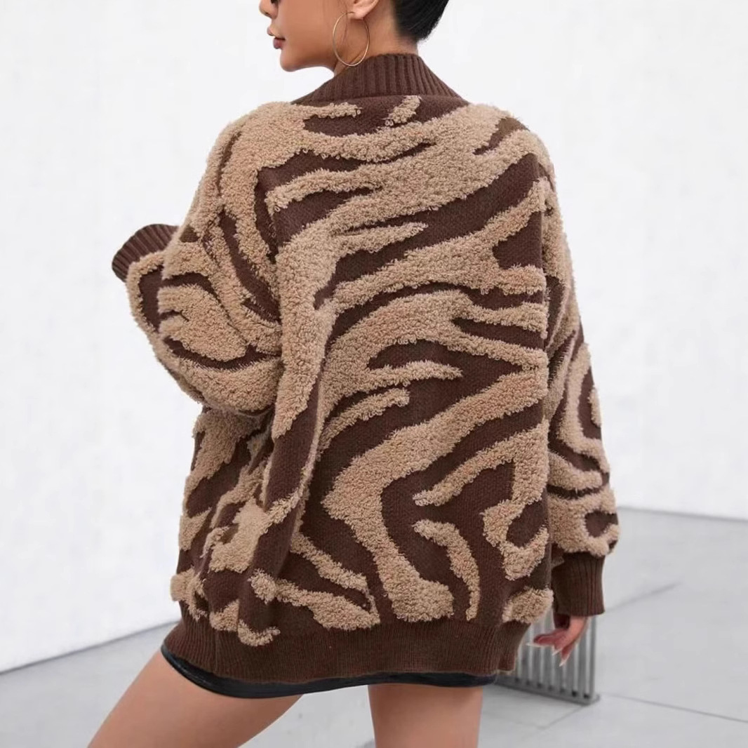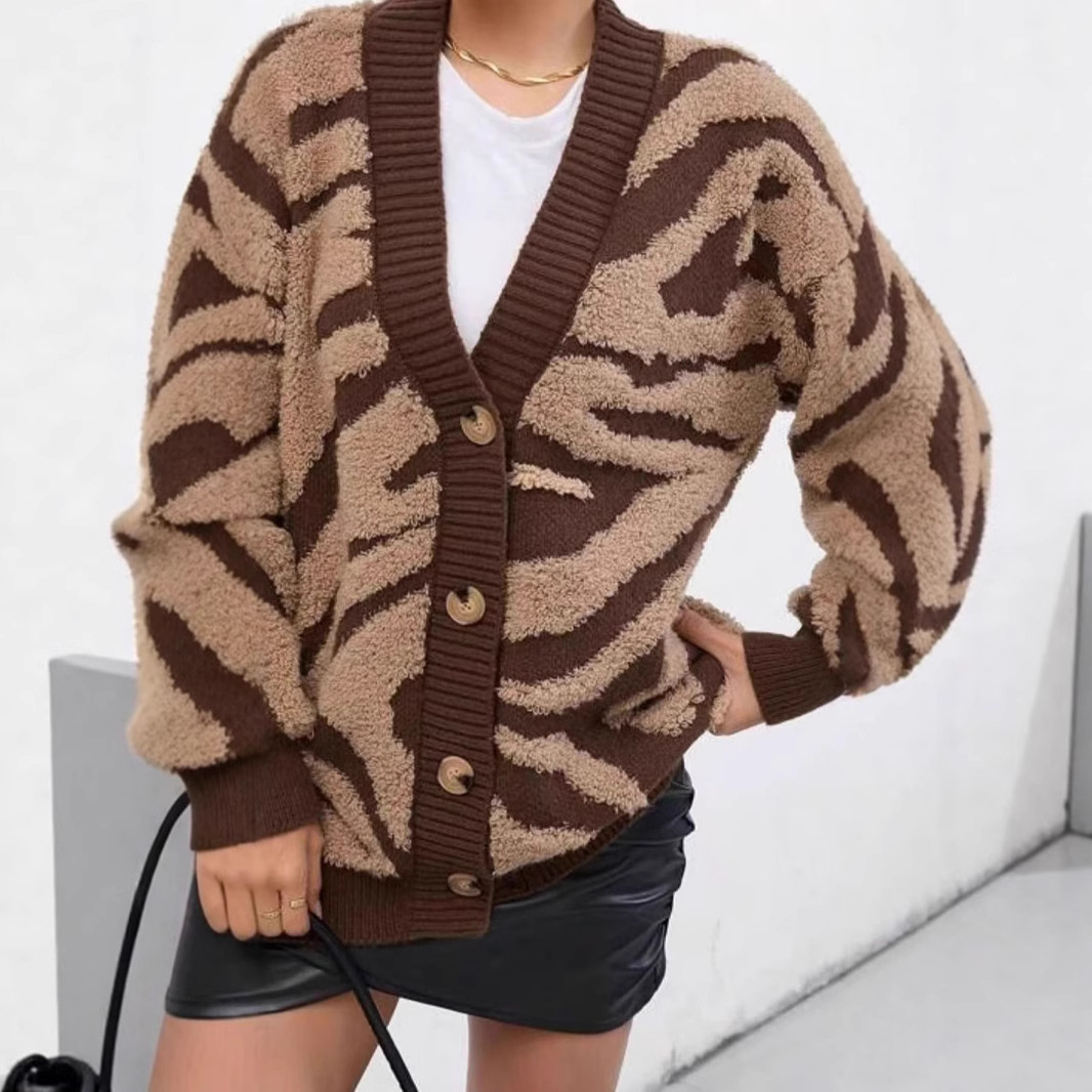 2025 새로운 유럽과 미국의 대외 무역 크로스 보더 스웨터 여성을위한 게으른 느슨한 대형 레오파드 프린트 카디건 스웨터 재킷
