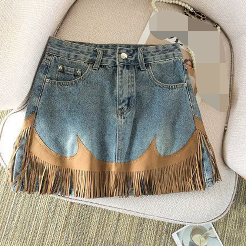 여성을위한 미국 복고풍 태슬 스플 라이스 데님 스커트 2025 여름 새로운 스타일 핫 소녀 하이 웨이스트 힙 커버 a 라인 스커트