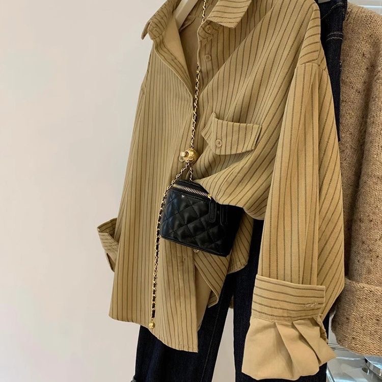 홍콩 스타일 세련된 긴팔 줄무늬 여성 셔츠 봄과 가을 틈새 디자인 느슨한 게으른 일본 스타일 빈티지 재킷