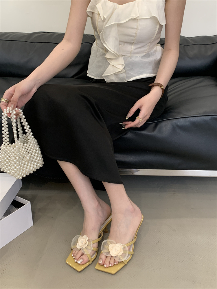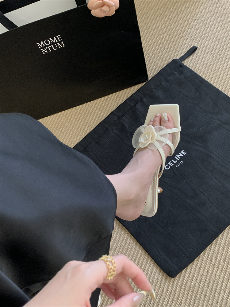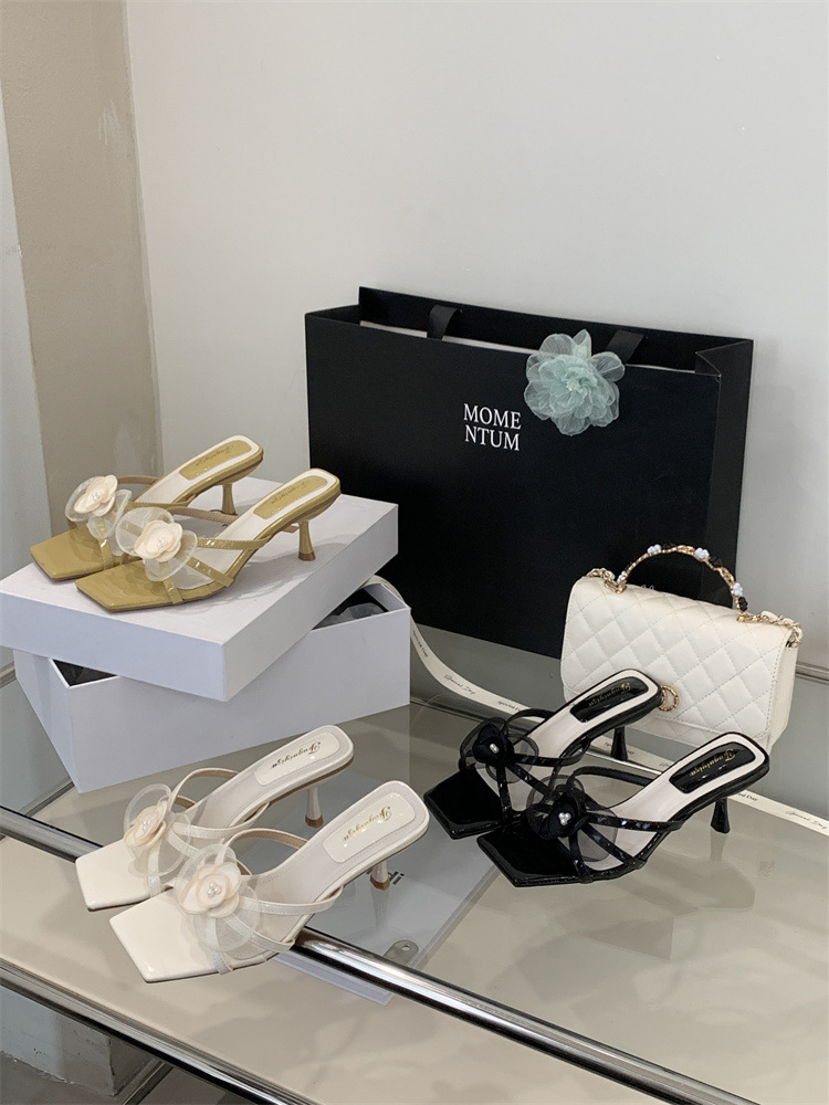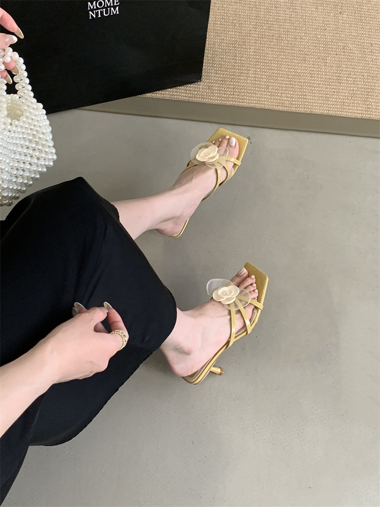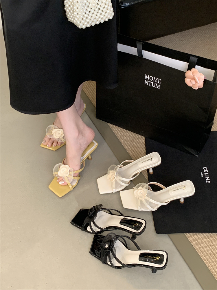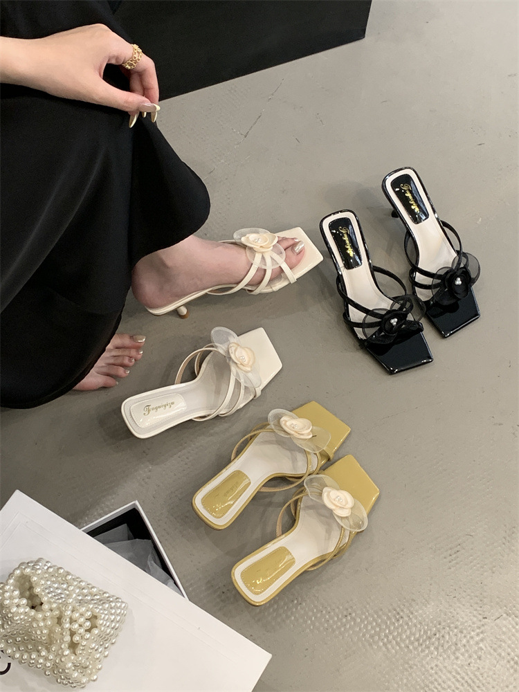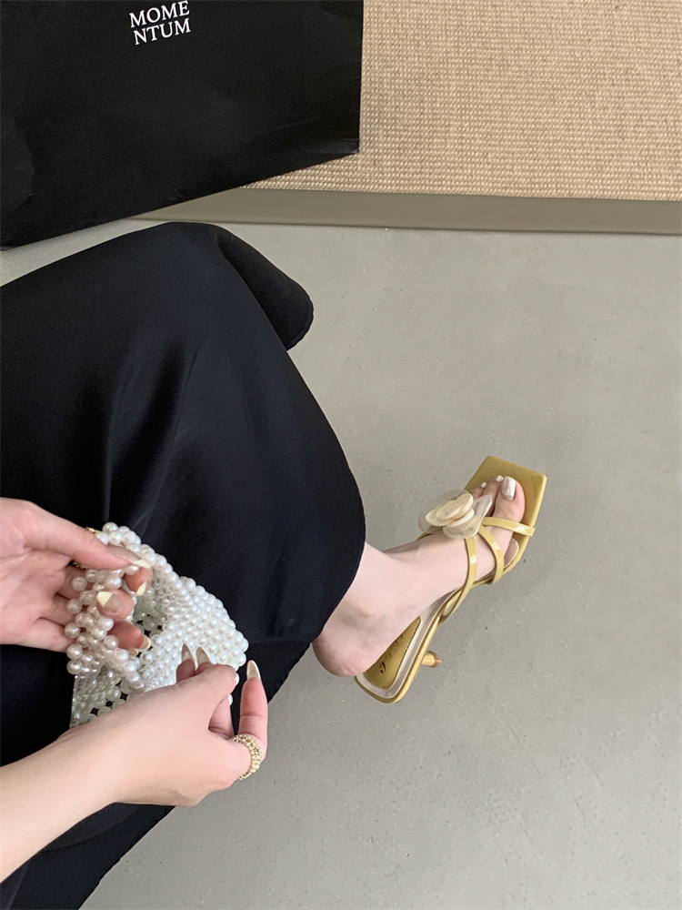 여성을 위한 사각 발가락 오픈 토 샌들, 얇은 굽 하이힐, 요정 스타일 2025 여름 새 꽃스토어 가기