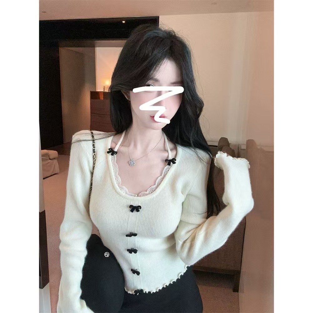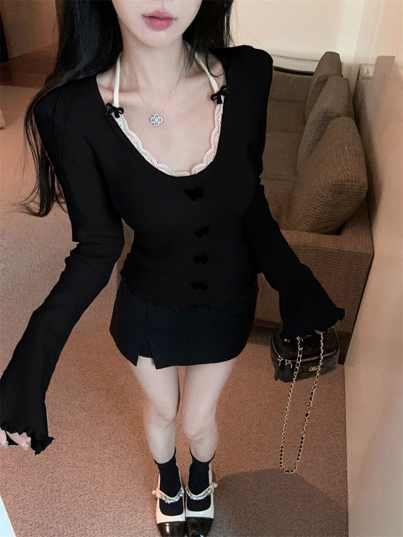 가짜 투피스 레이스 넥 살구색 베이스 셔츠 여성의 2024 초가을 세련된 달콤한 스파이스 활 짧은 최고 트렌디스토어 가기