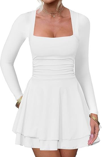 유럽과 미국의 Amazon 2025 여성 스퀘어 넥 주름 밑단 드레스 허리 긴 소매 꽉 짧은 파티 드레스스토어 가기