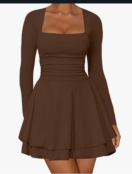 유럽과 미국의 Amazon 2025 여성 스퀘어 넥 주름 밑단 드레스 허리 긴 소매 꽉 짧은 파티 드레스
