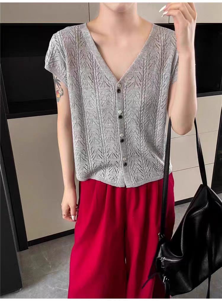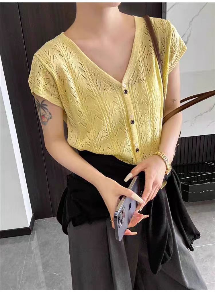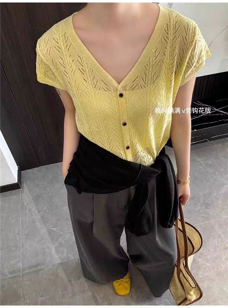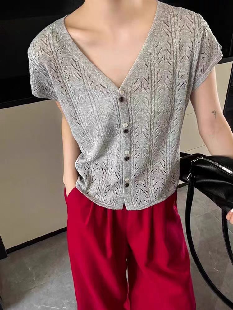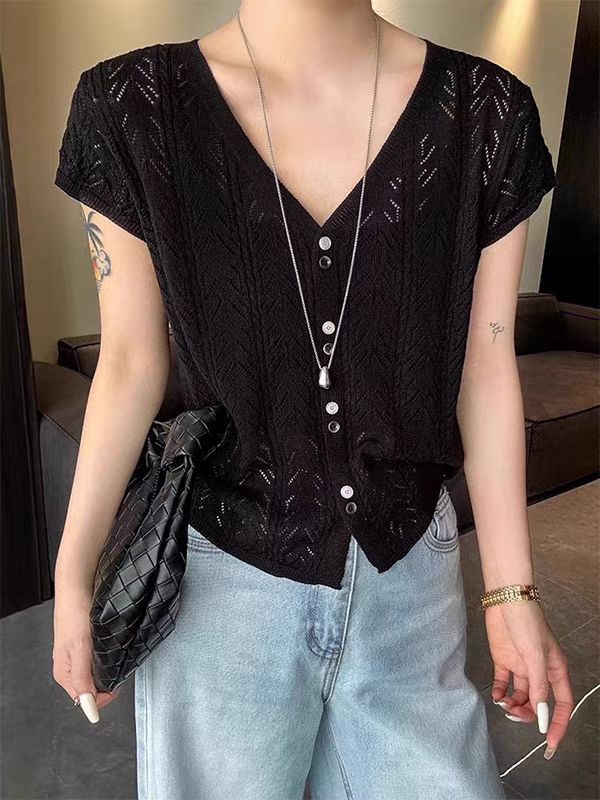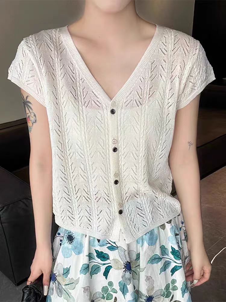 한국 스타일 우아한 할로우 아웃 V 넥 솔리드 컬러 니트 카디건 2025 여름 새로운 하이 엔드 센스 얇은 반팔 티셔츠 탑스토어 가기