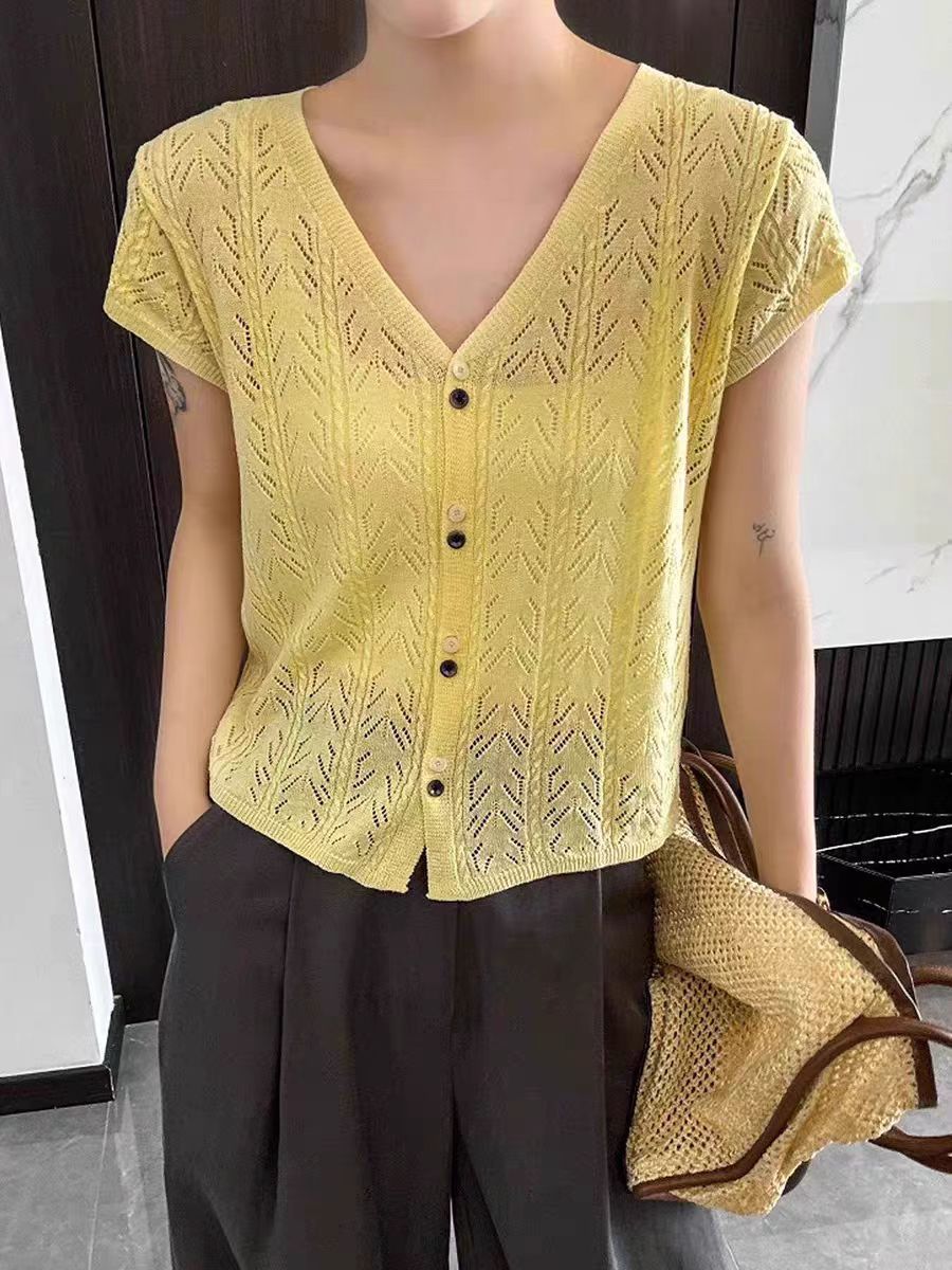 한국 스타일 우아한 할로우 아웃 V 넥 솔리드 컬러 니트 카디건 2025 여름 새로운 하이 엔드 센스 얇은 반팔 티셔츠 탑
