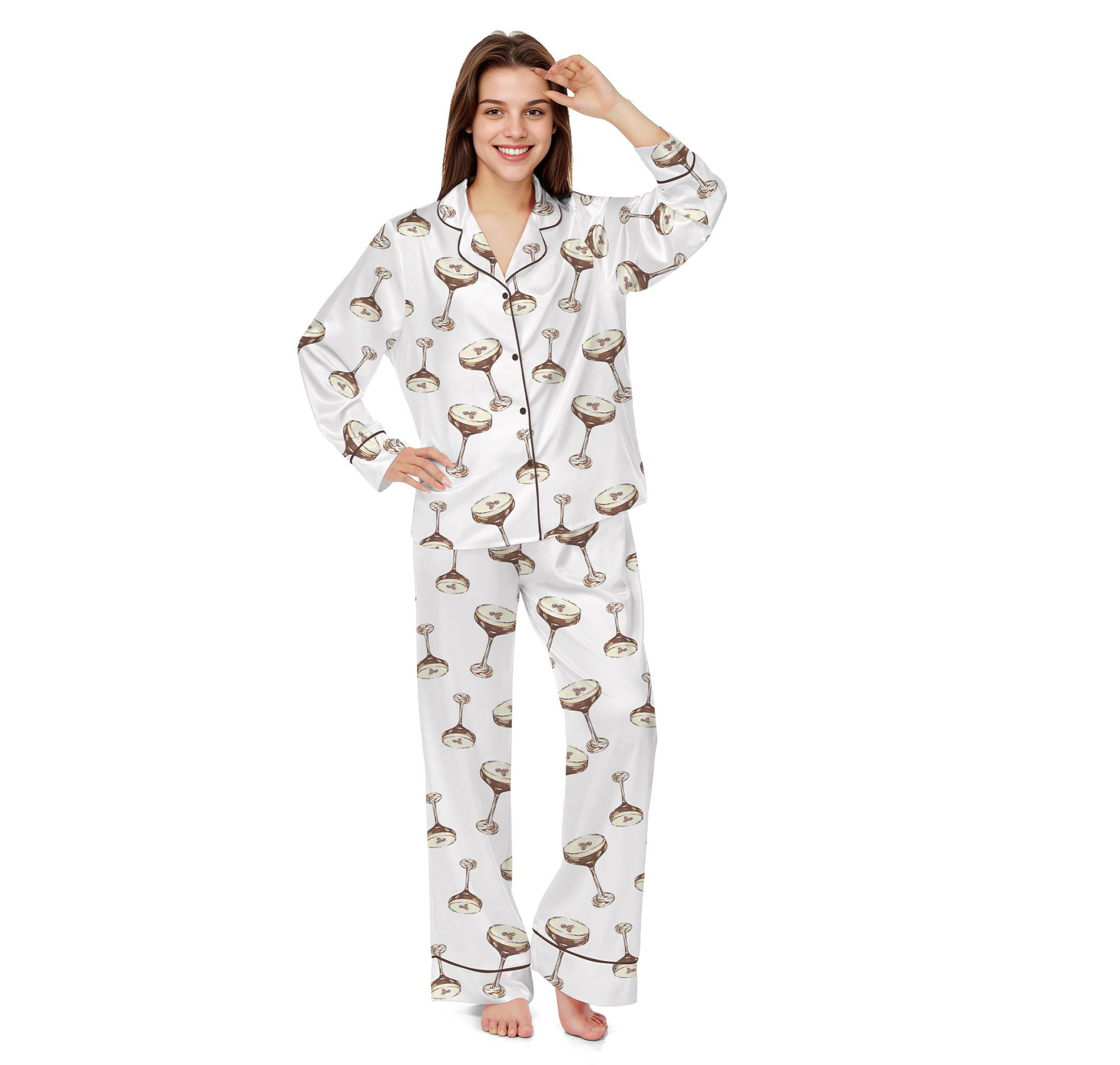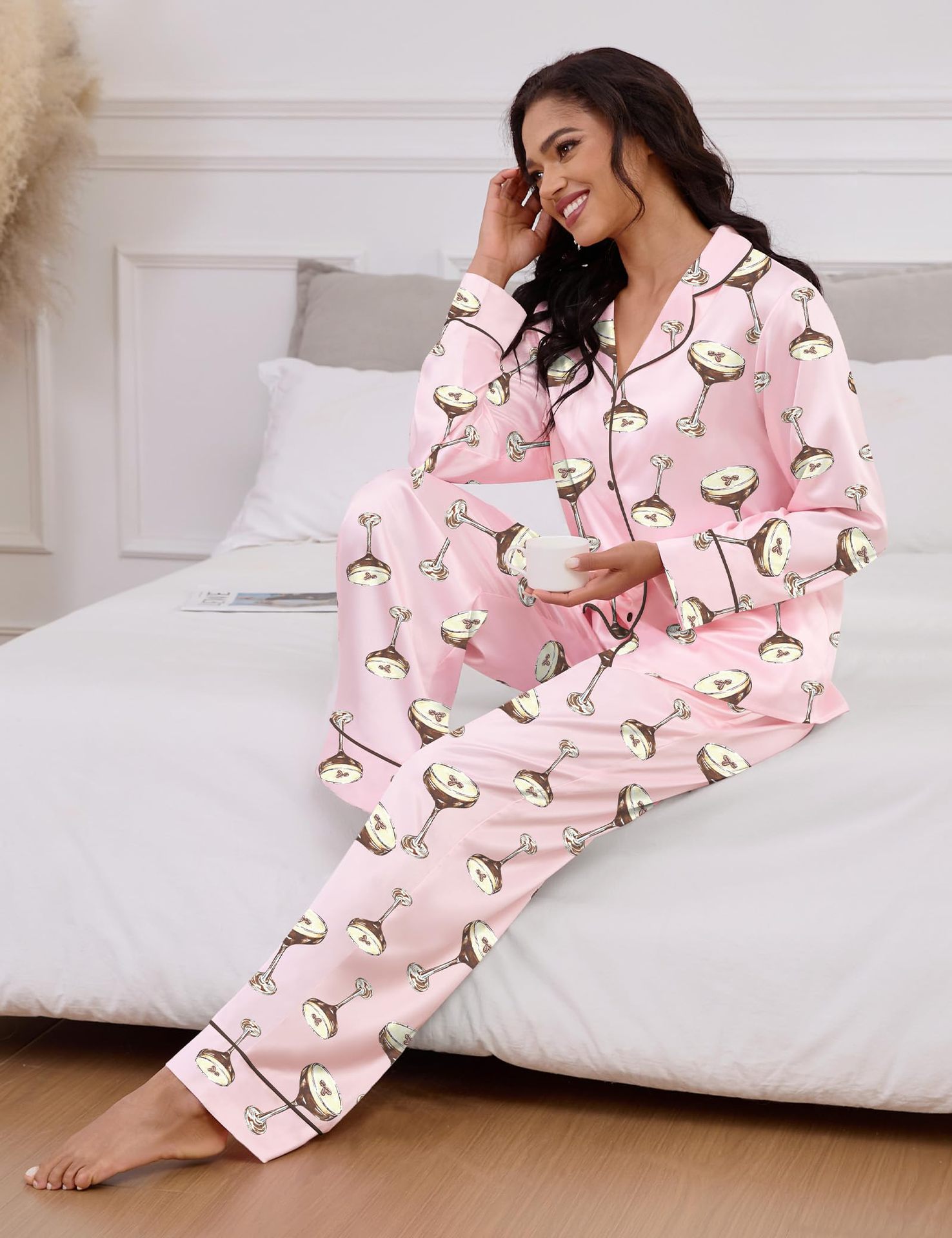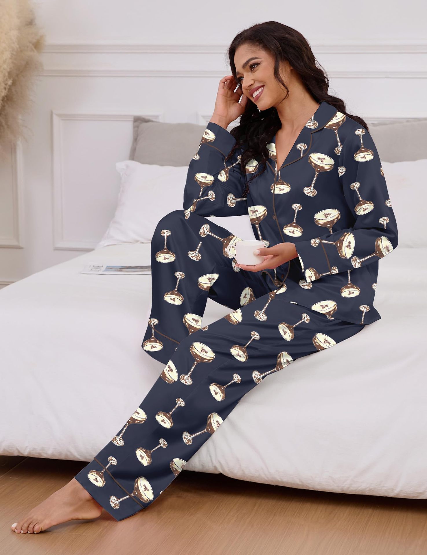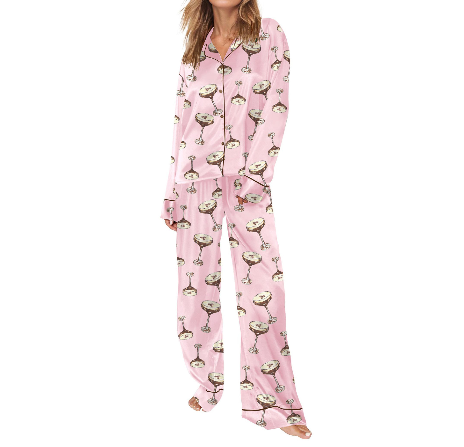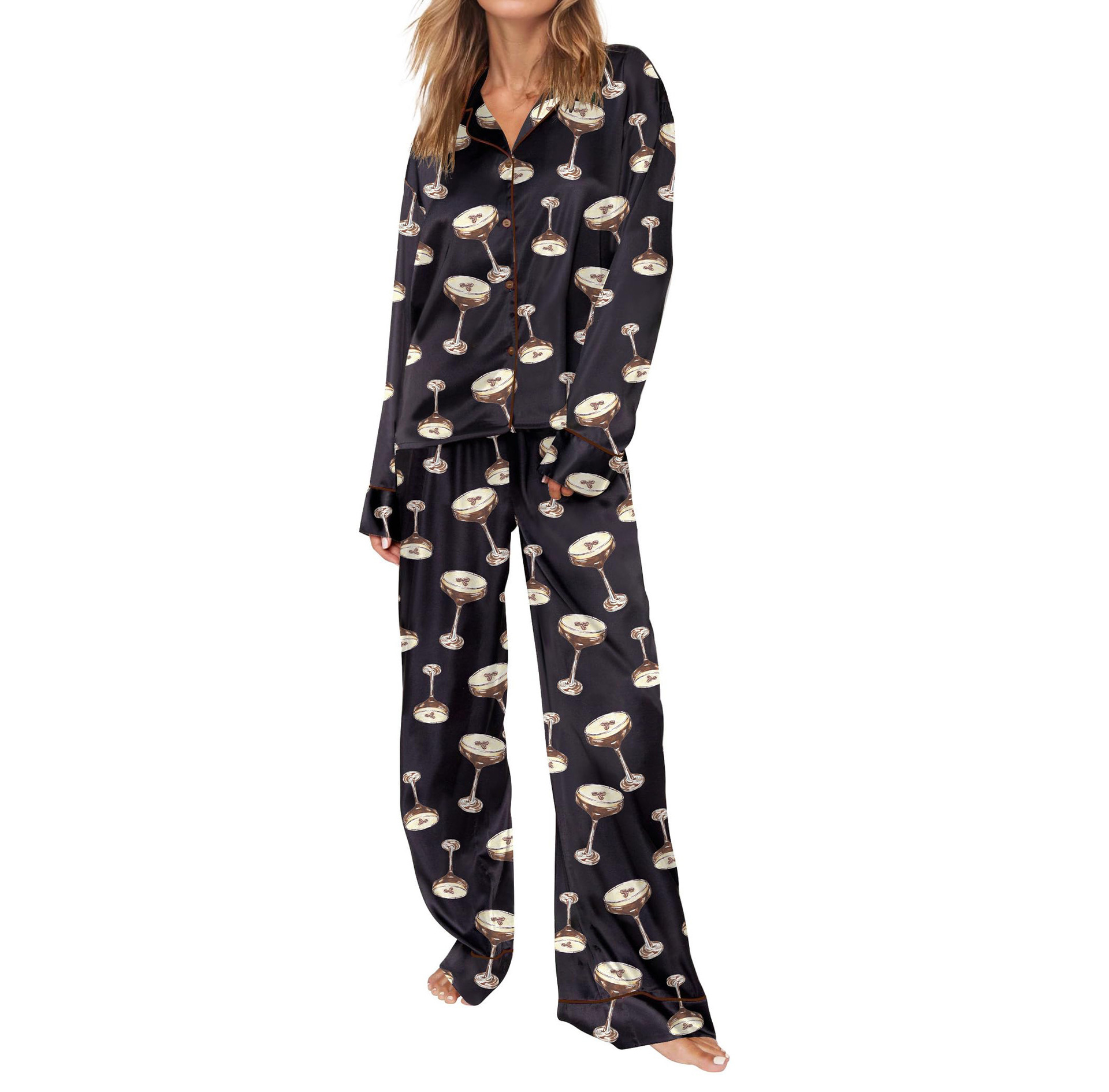 Pijama 재미 있은 여성 그래픽 잠옷 세트 얼음 실크 긴 소매 바지 2 조각 세트 홈웨어