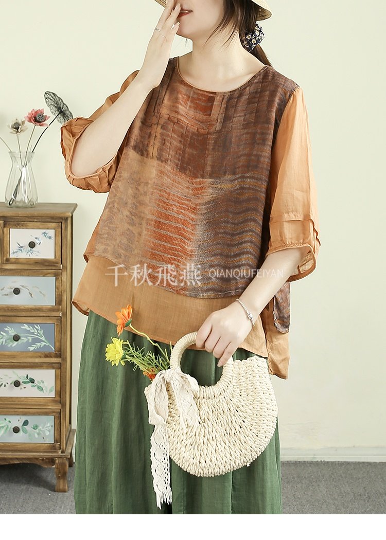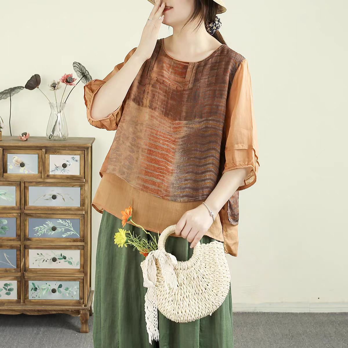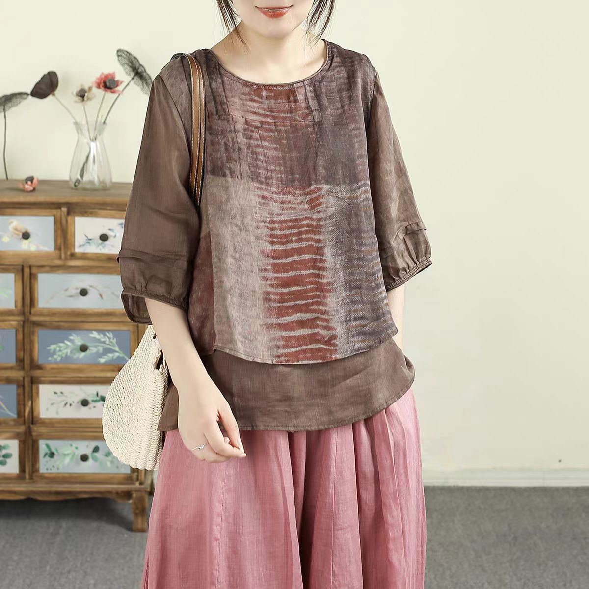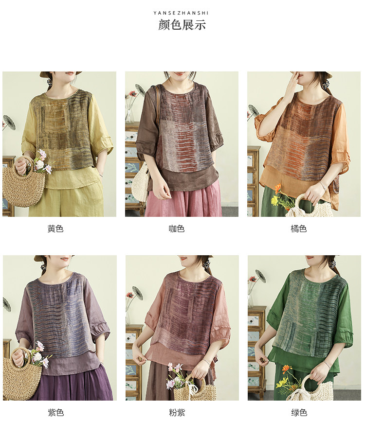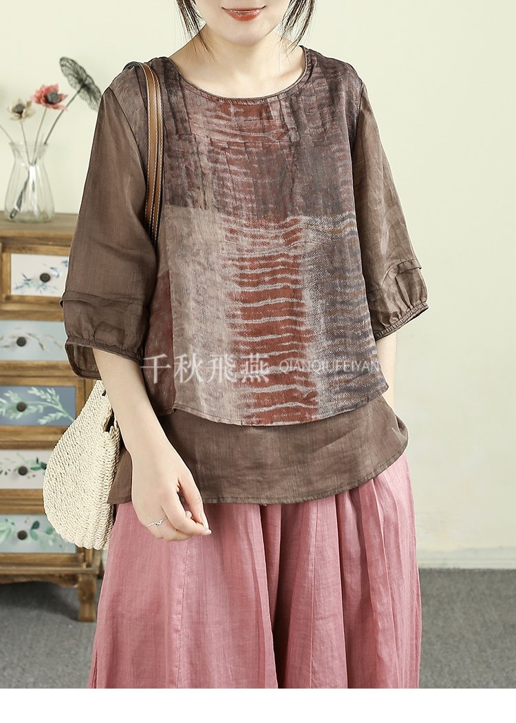 2025 빈티지 라미 레오파드 무늬 가짜 투피스 풀오버 셔츠 여자 여름 새 라운드 넥 루즈 탑