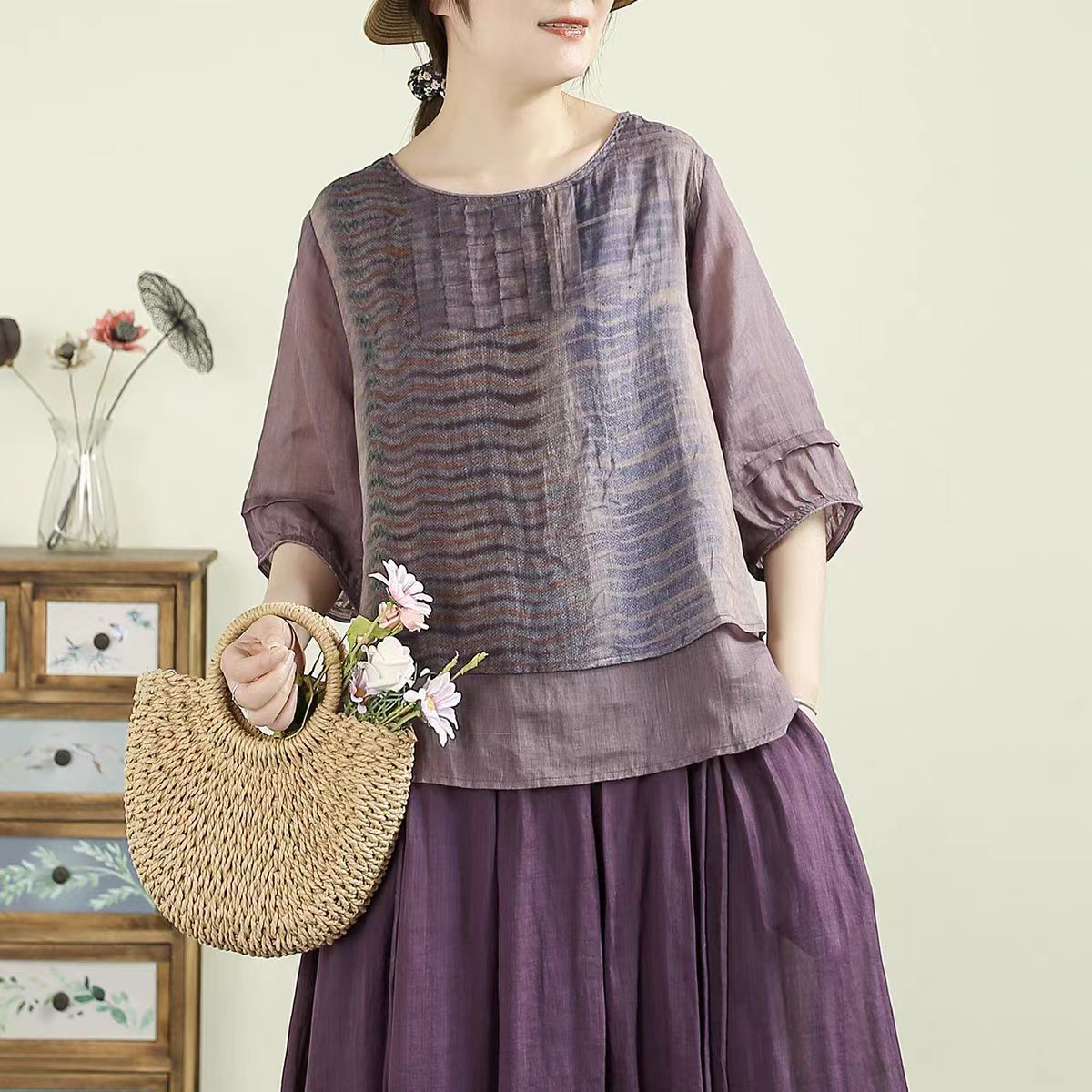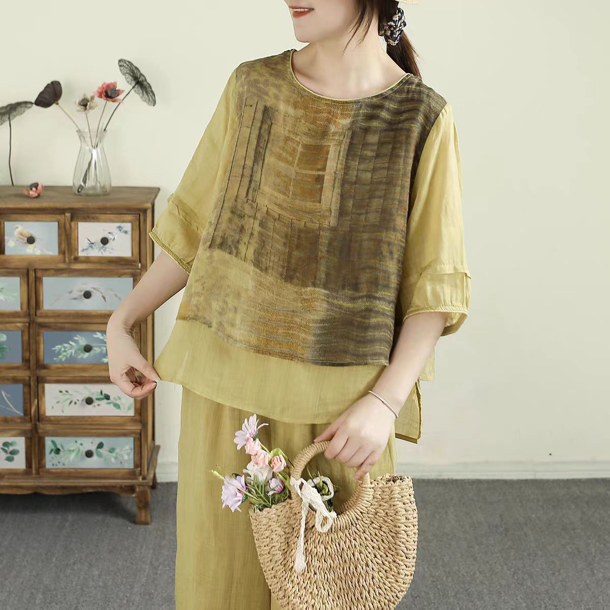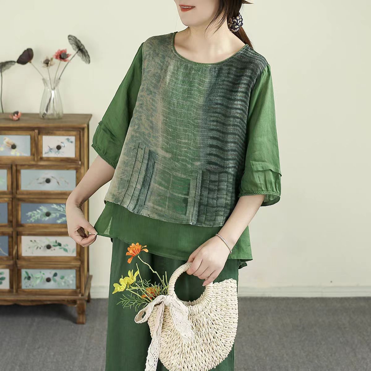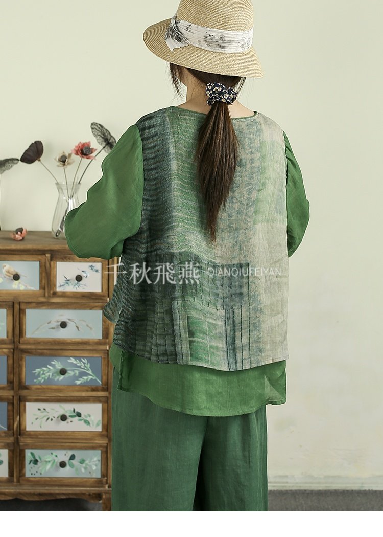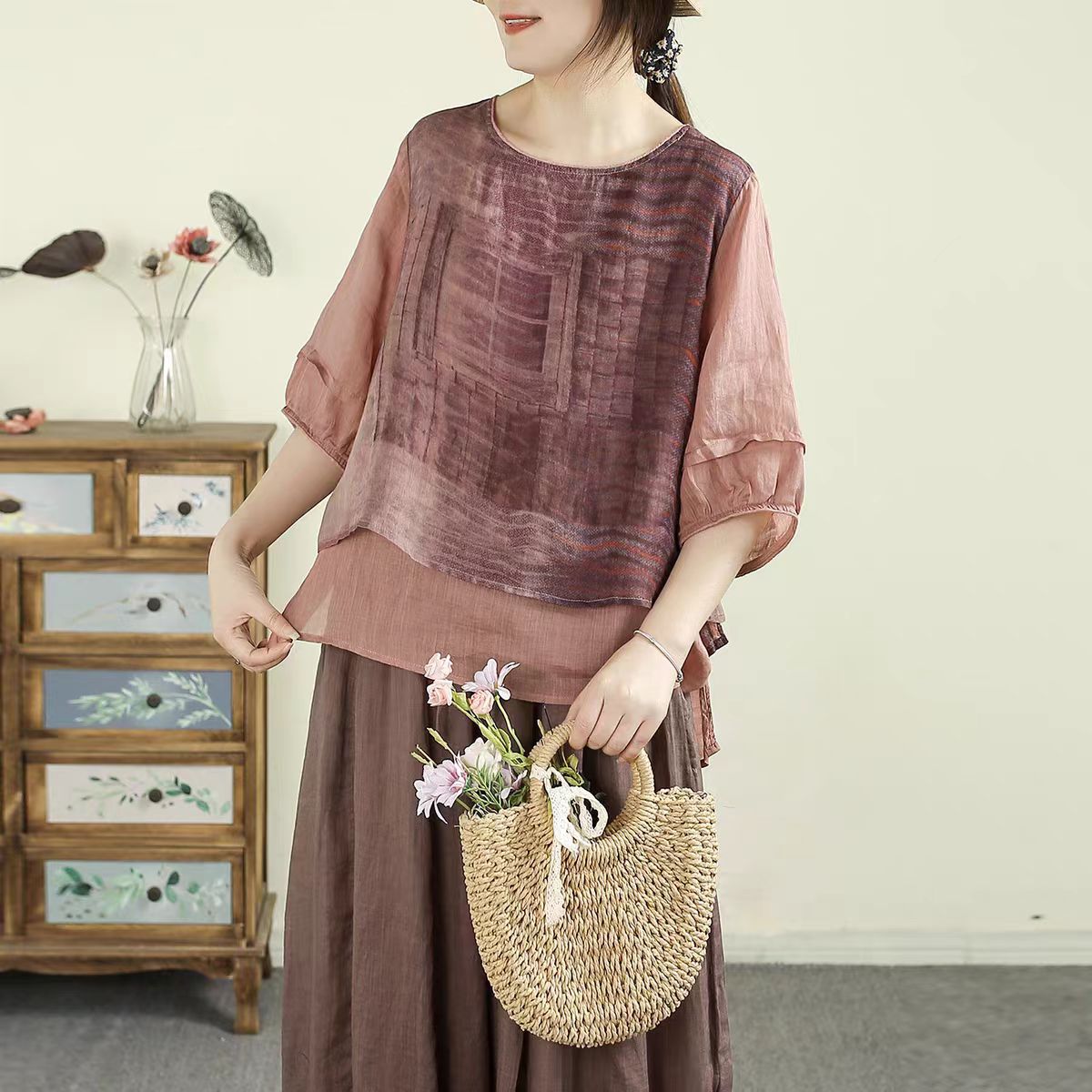 2025 빈티지 라미 레오파드 무늬 가짜 투피스 풀오버 셔츠 여자 여름 새 라운드 넥 루즈 탑
