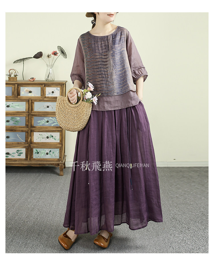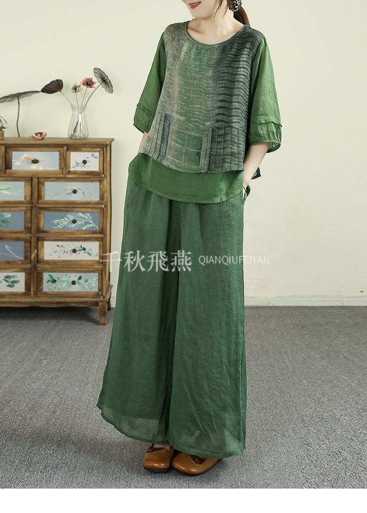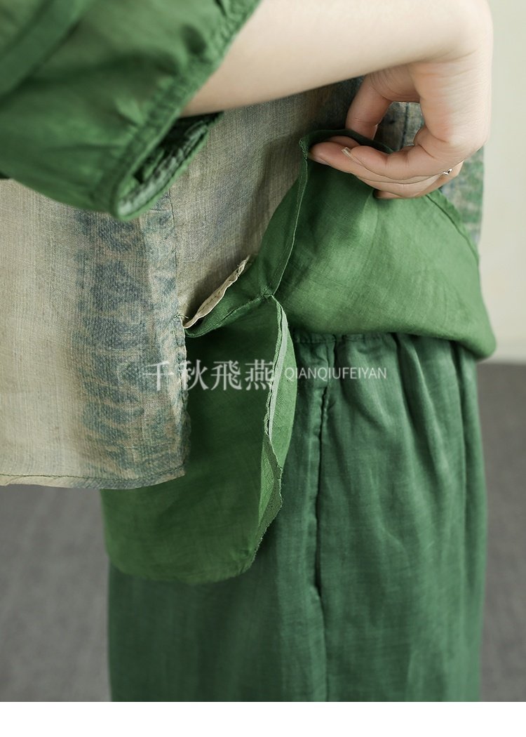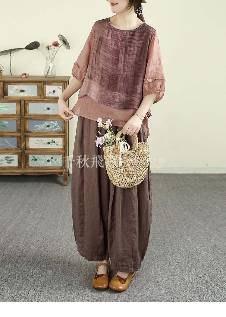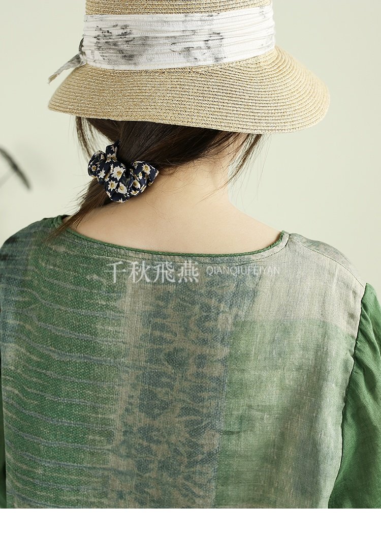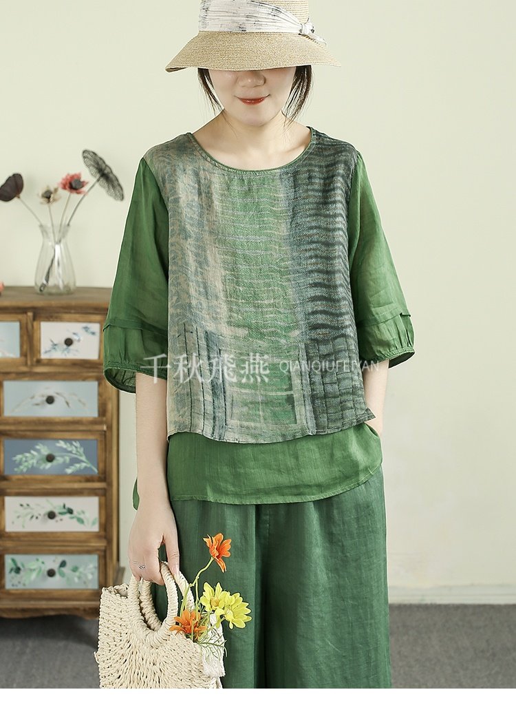 2025 빈티지 라미 레오파드 무늬 가짜 투피스 풀오버 셔츠 여자 여름 새 라운드 넥 루즈 탑