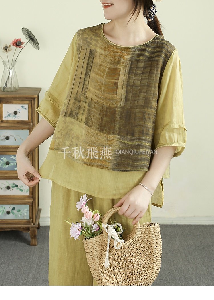 2025 빈티지 라미 레오파드 무늬 가짜 투피스 풀오버 셔츠 여자 여름 새 라운드 넥 루즈 탑스토어 가기