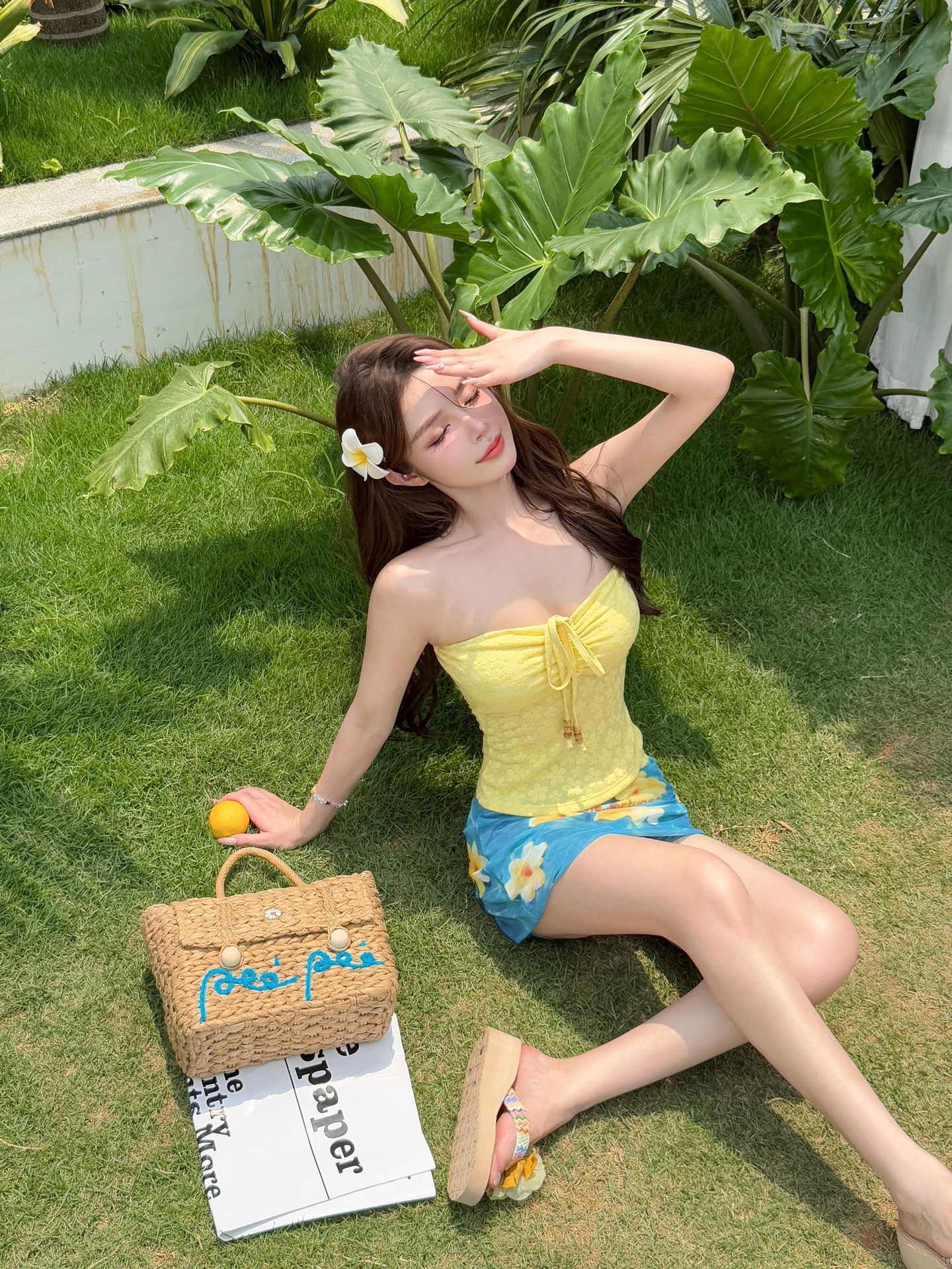 태국 동남아 해변 휴가 핫걸 스타일 비키니 수영복 여성 꽃무늬 홀터넥 튜브탑 스플릿 3피스 세트