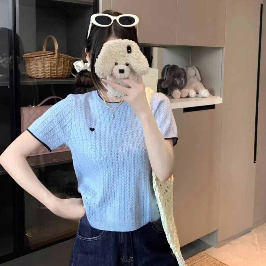 여성을위한 대학 스타일 사랑 자수 니트 반팔 2025 여름 세련된 대비 색상 라운드 넥 티셔츠 바닥 탑스토어 가기