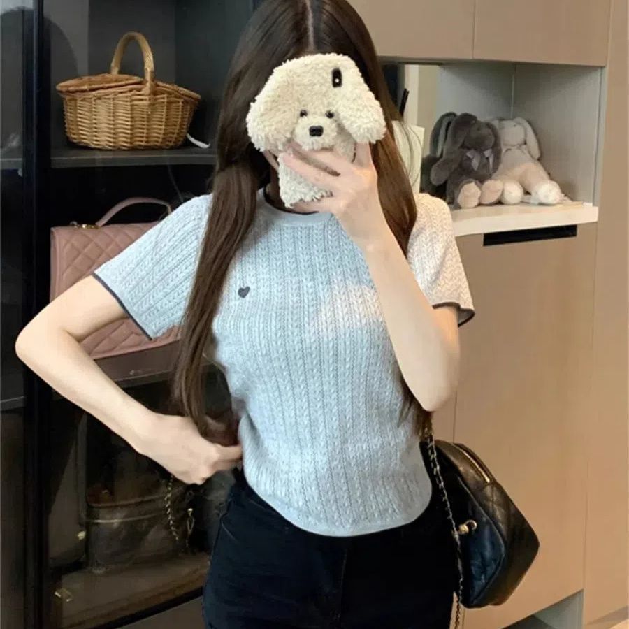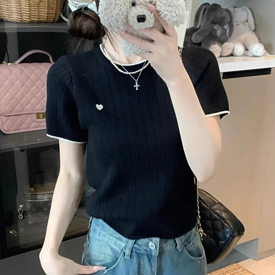 여성을위한 대학 스타일 사랑 자수 니트 반팔 2025 여름 세련된 대비 색상 라운드 넥 티셔츠 바닥 탑
