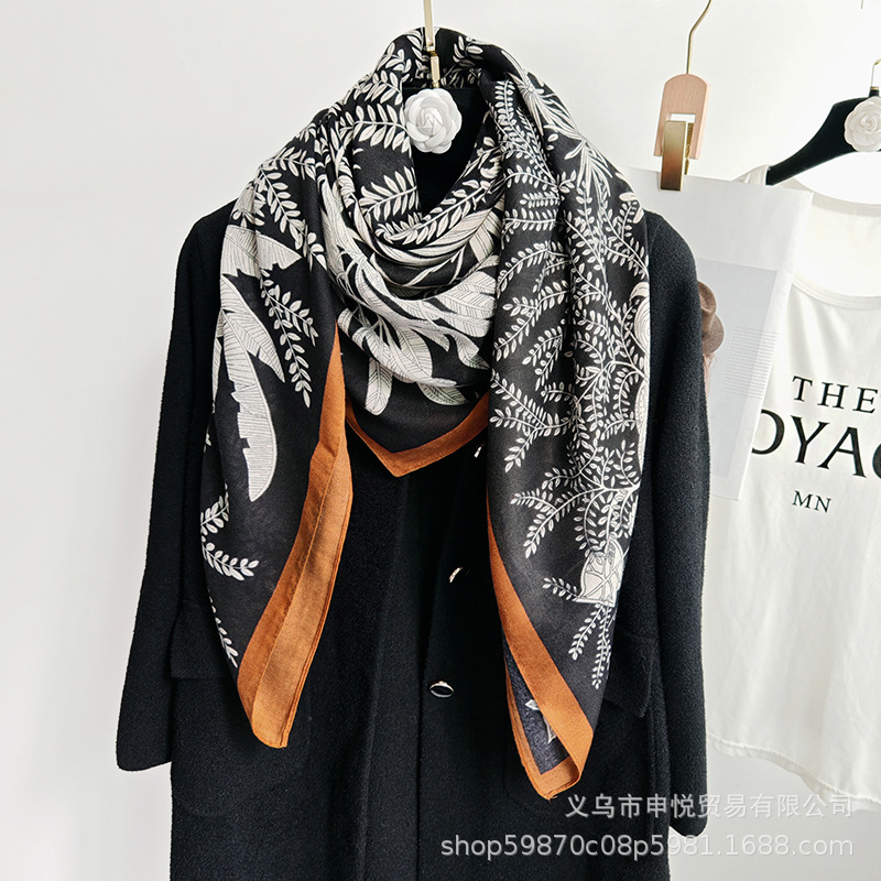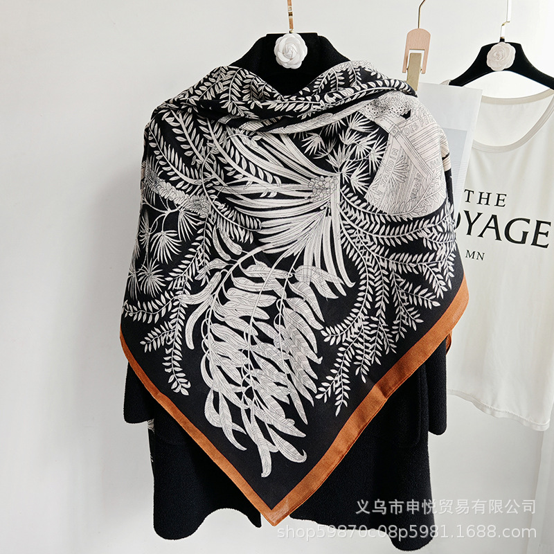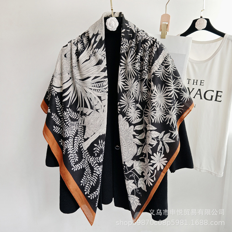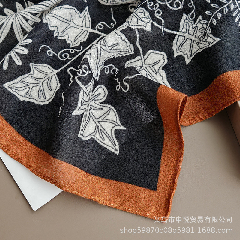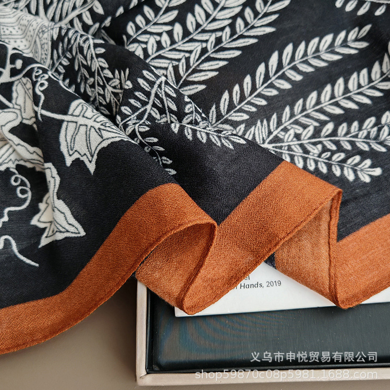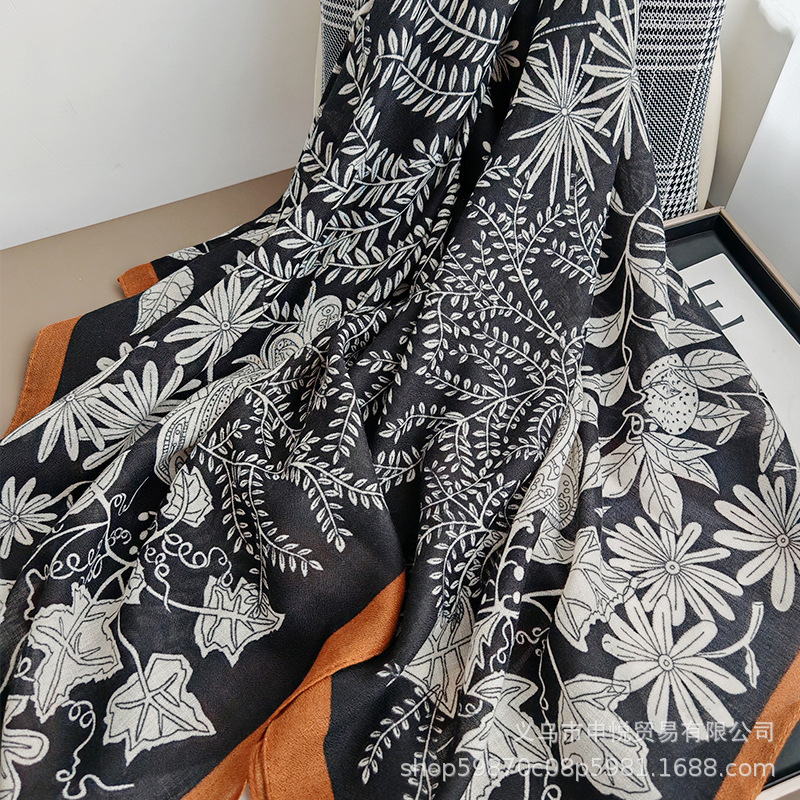 크로스보더 레트로 블랙 플랜트 프린트 130 면 및 린넨 스타일 대형 사각형 스카프 여성용 스카프 다용도 터번 에어컨 숄스토어 가기