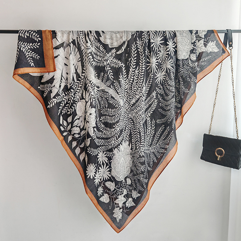 크로스보더 레트로 블랙 플랜트 프린트 130 면 및 린넨 스타일 대형 사각형 스카프 여성용 스카프 다용도 터번 에어컨 숄