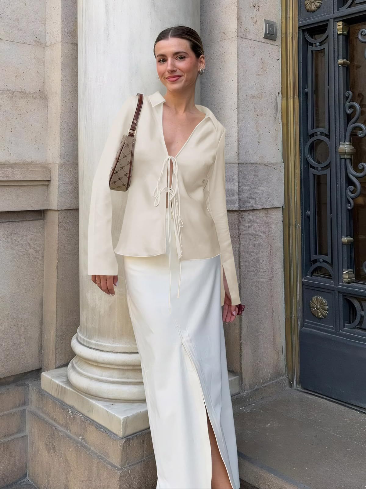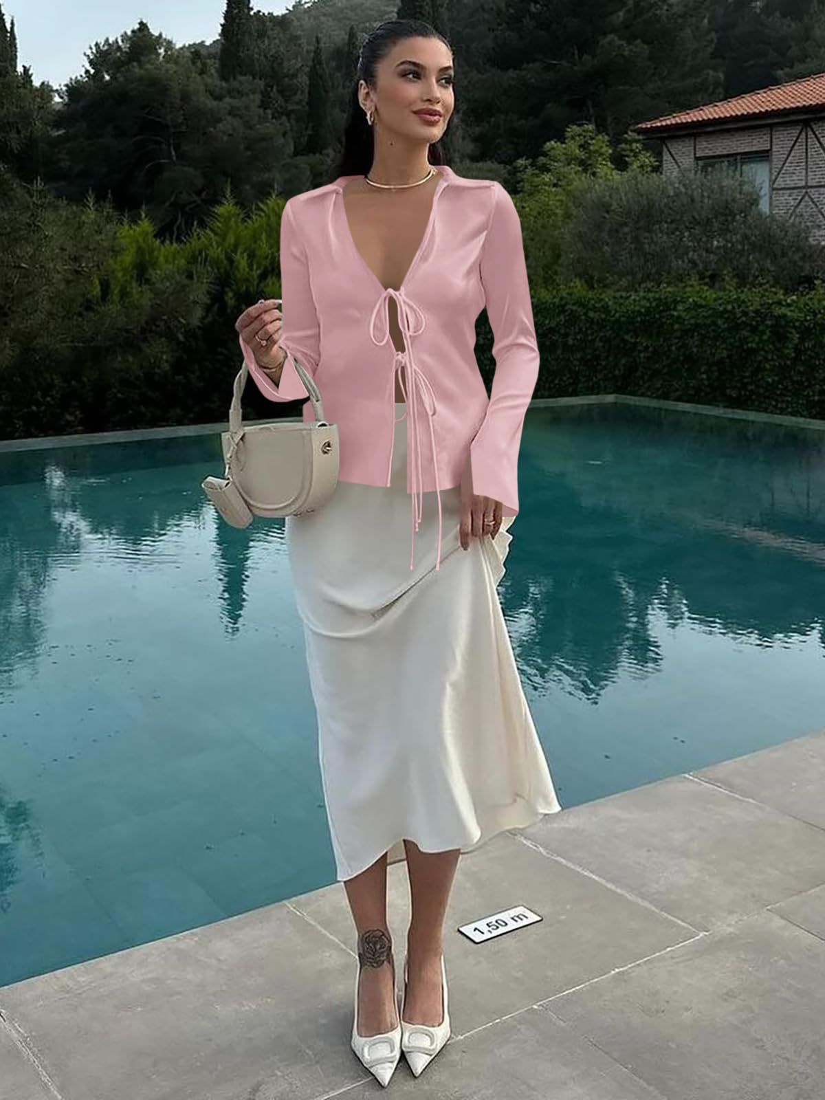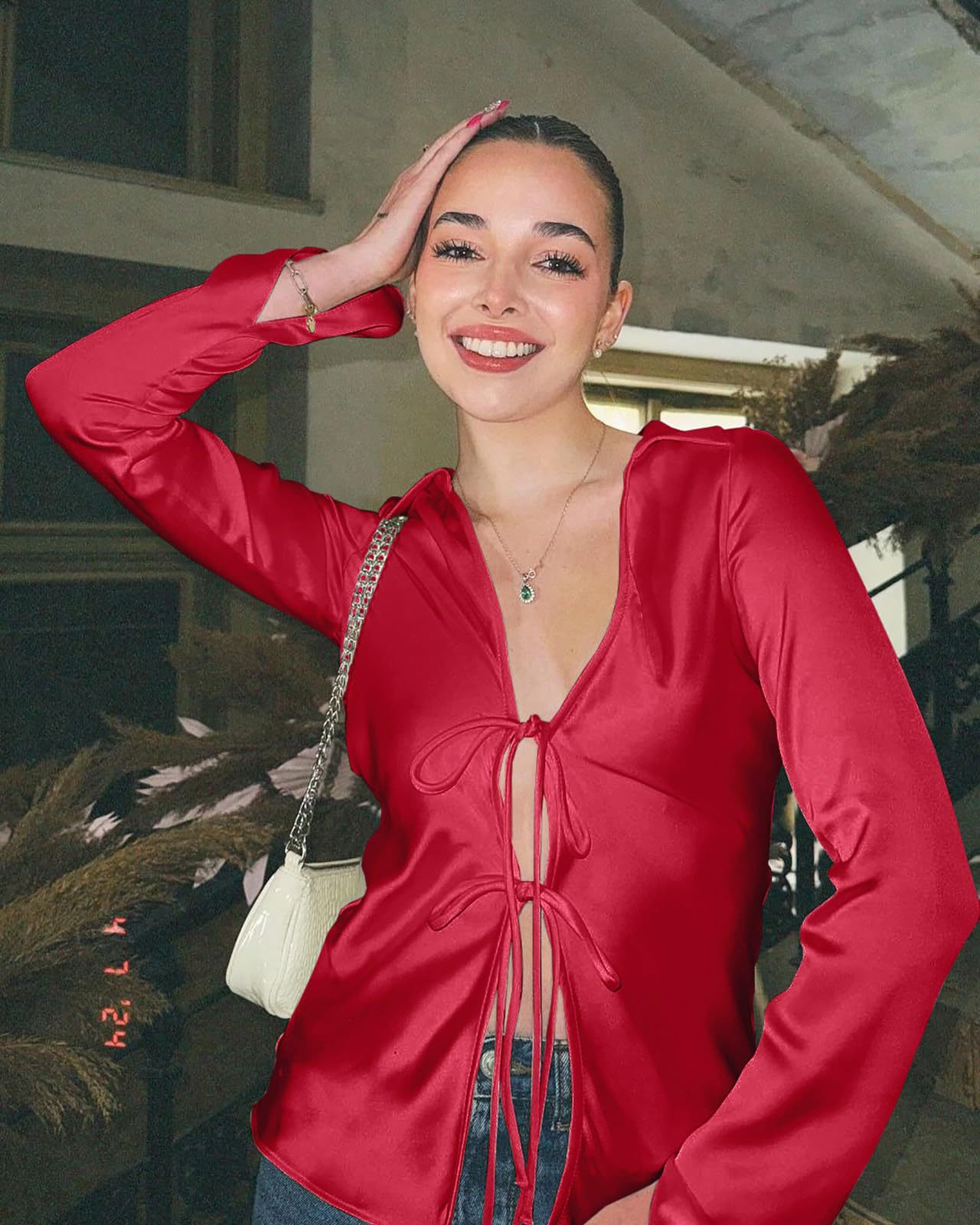국경 2025 봄과 여름 새로운 실크 레이스 업 카디건 긴팔 슬림 핏 슬리밍 리얼 캐주얼 섹시 셔츠