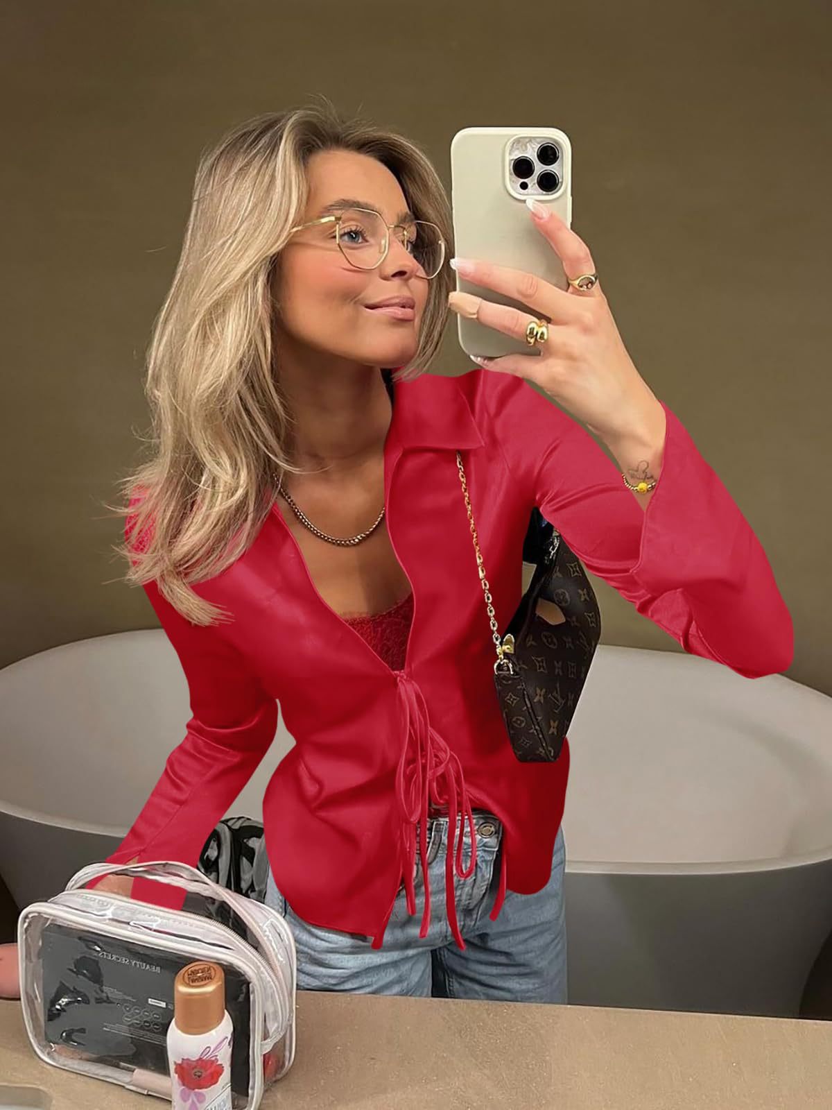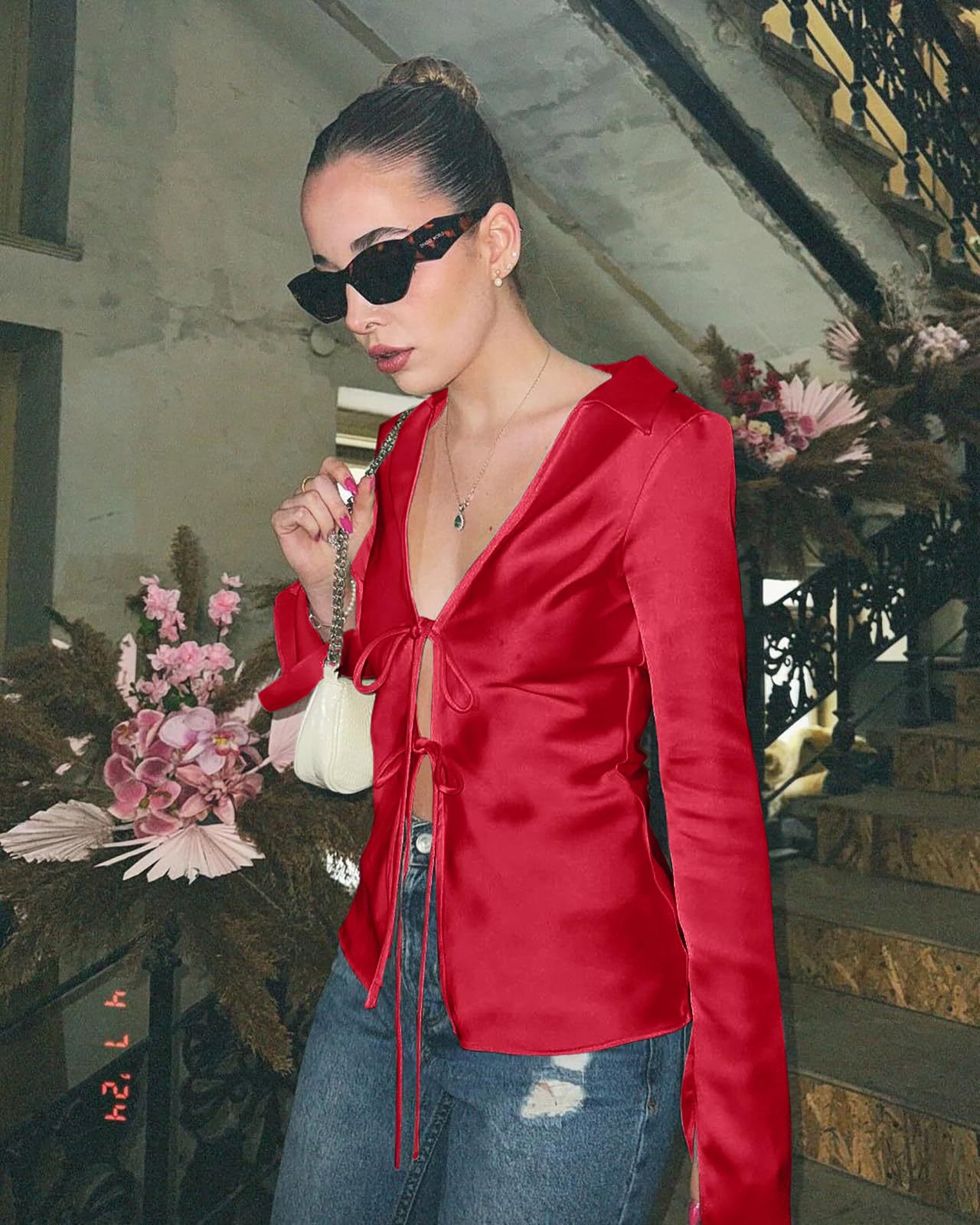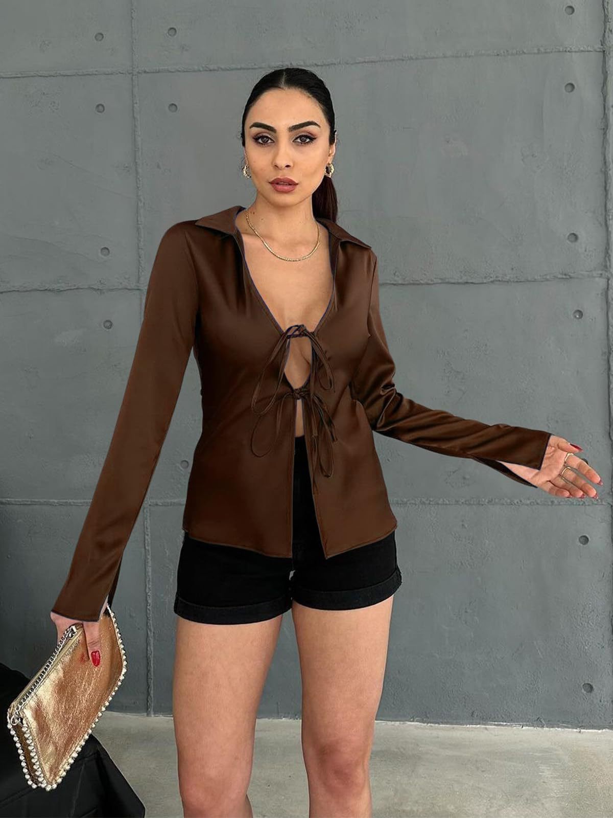 국경 2025 봄과 여름 새로운 실크 레이스 업 카디건 긴팔 슬림 핏 슬리밍 리얼 캐주얼 섹시 셔츠스토어 가기