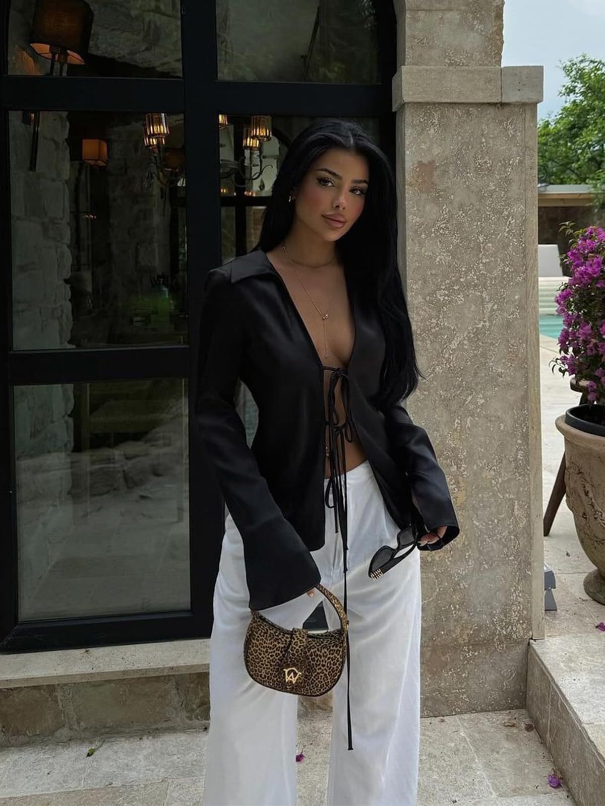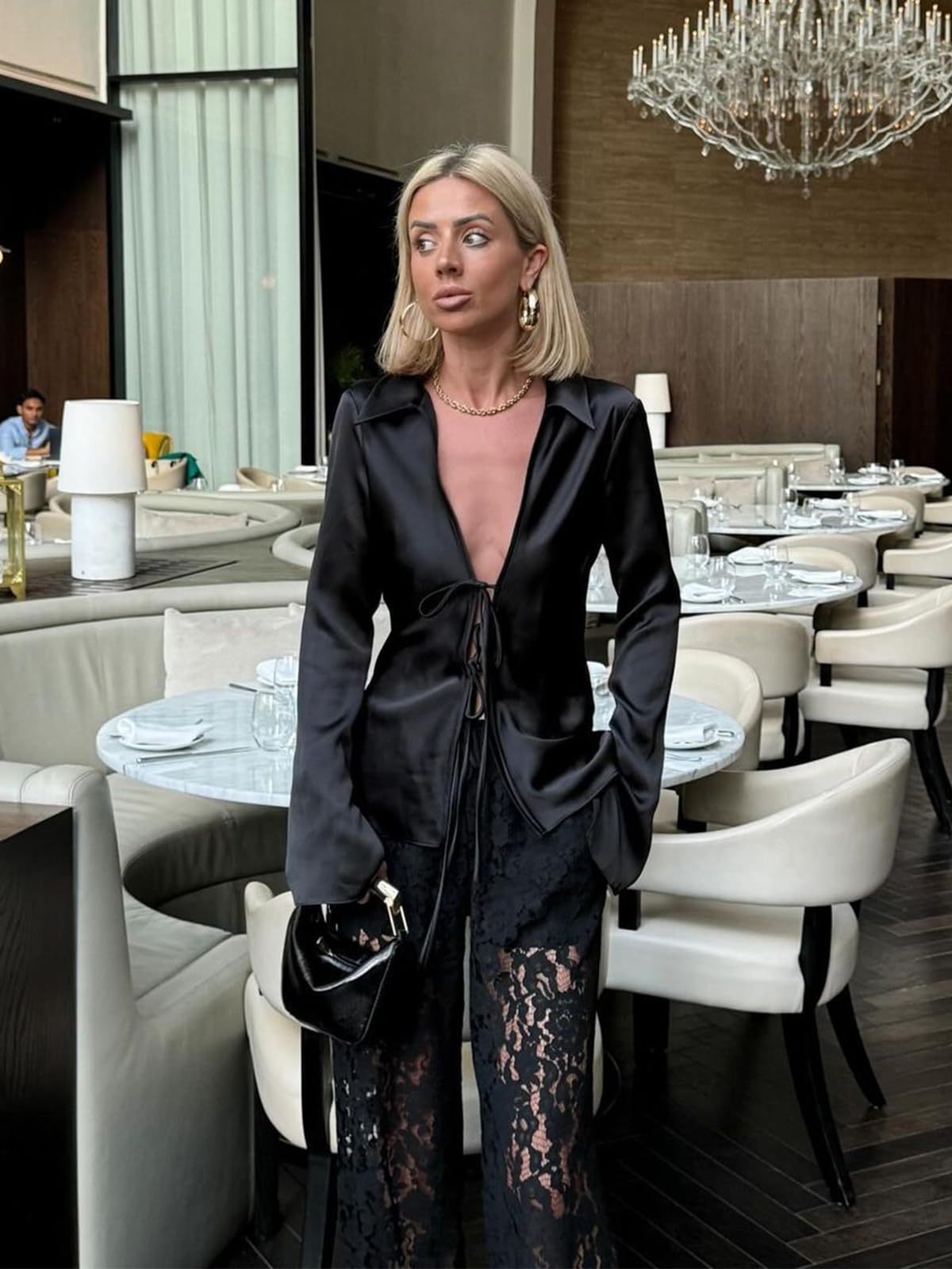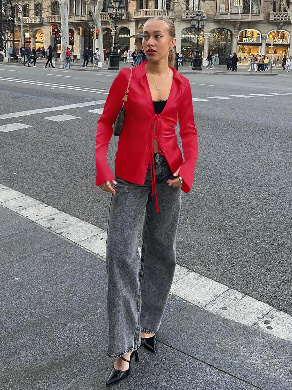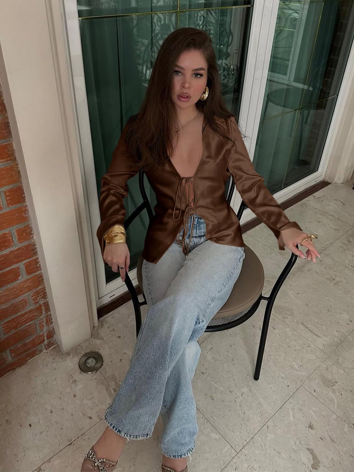 국경 2025 봄과 여름 새로운 실크 레이스 업 카디건 긴팔 슬림 핏 슬리밍 리얼 캐주얼 섹시 셔츠스토어 가기