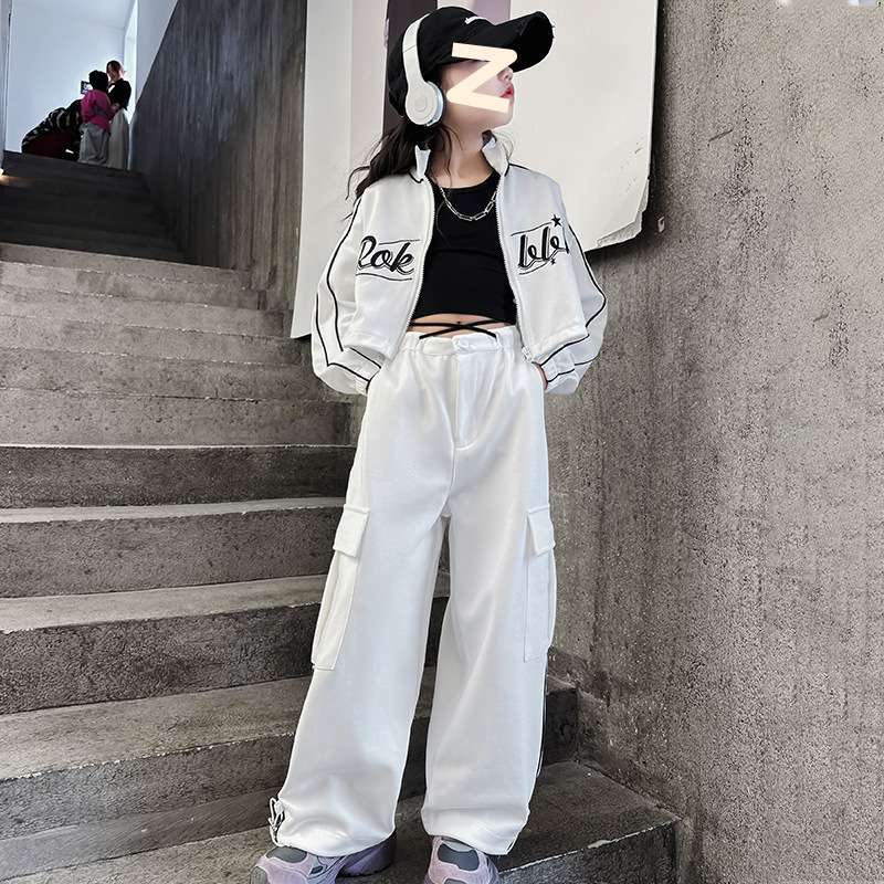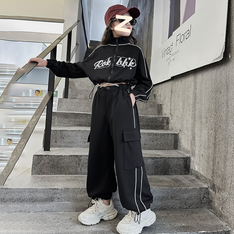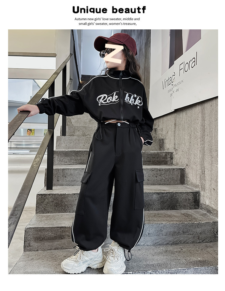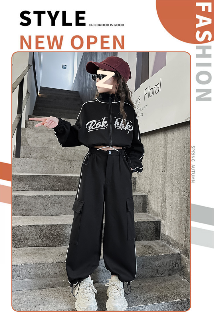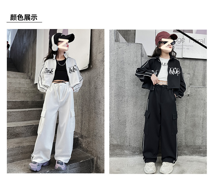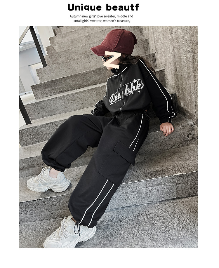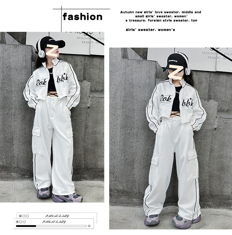 여아 가을 긴팔 자수 재킷과 바지 투피스 세트 2024 새로운 중대형 아동 스플리싱 한국 스포츠 슈트스토어 가기