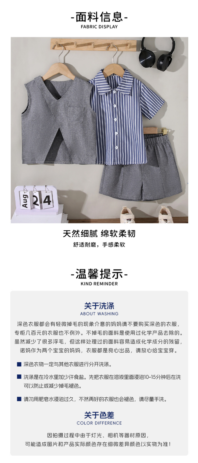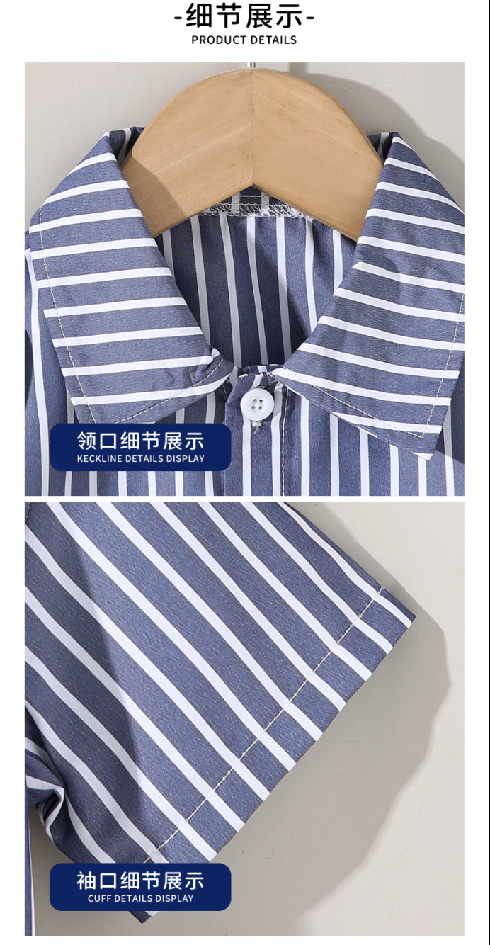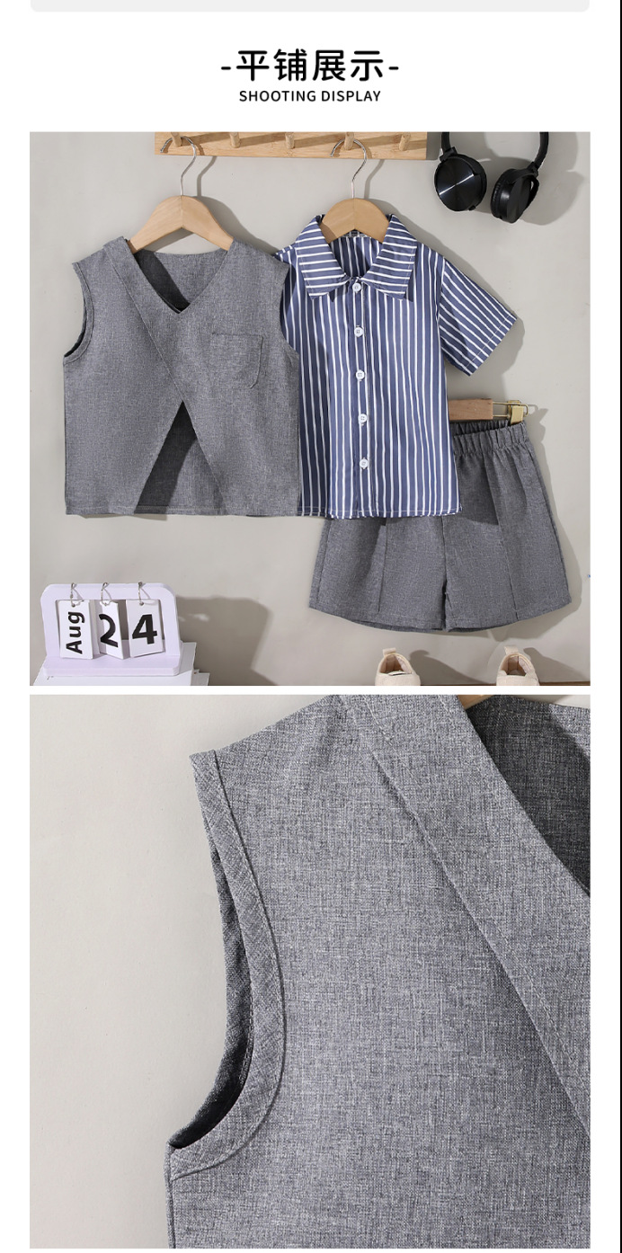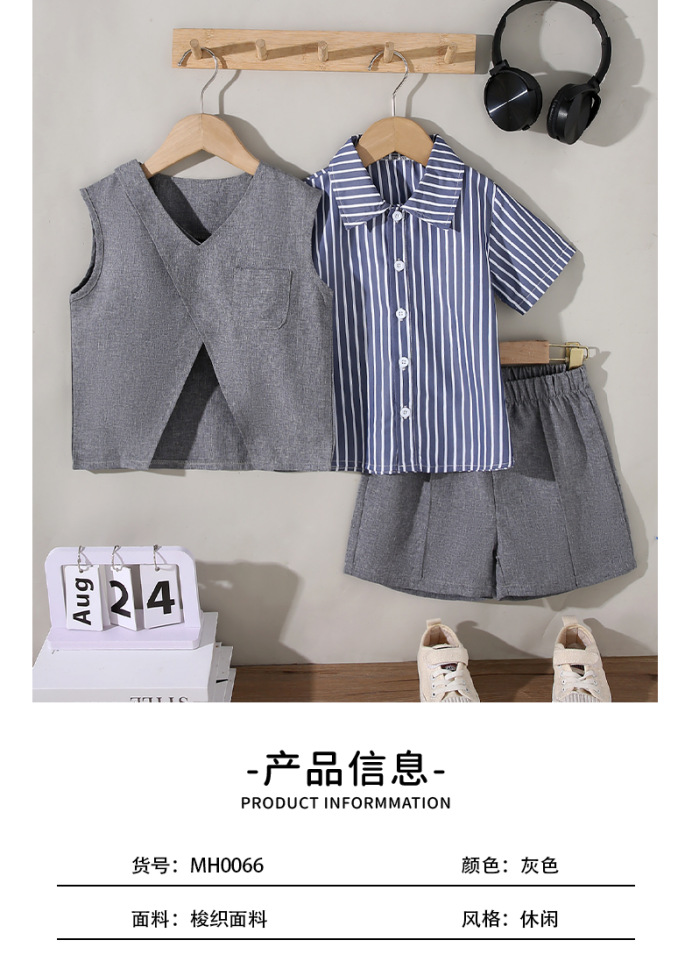 동남 아시아 국경 간 어린이 파란색과 흰색 줄무늬 셔츠 회색 조끼 반바지 3 피스 세트 유행 소년 정장 아동 의류스토어 가기