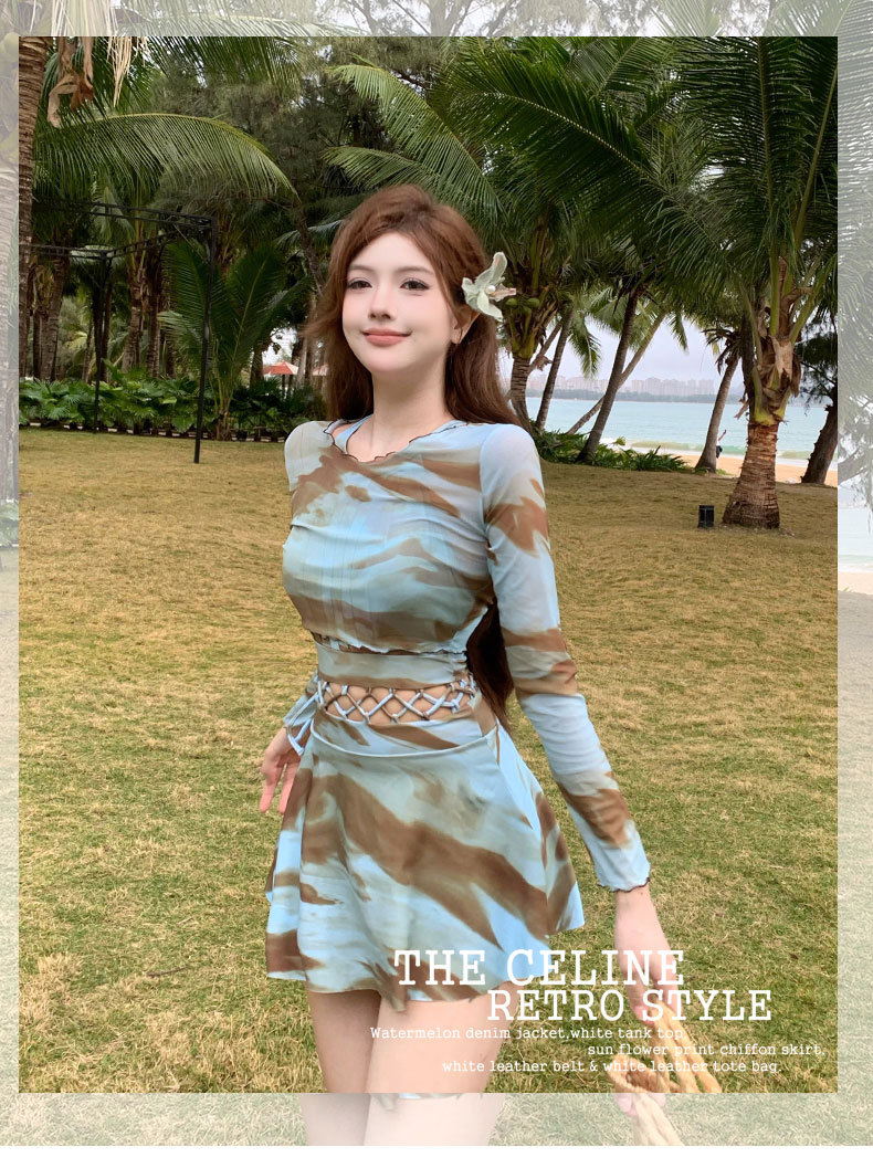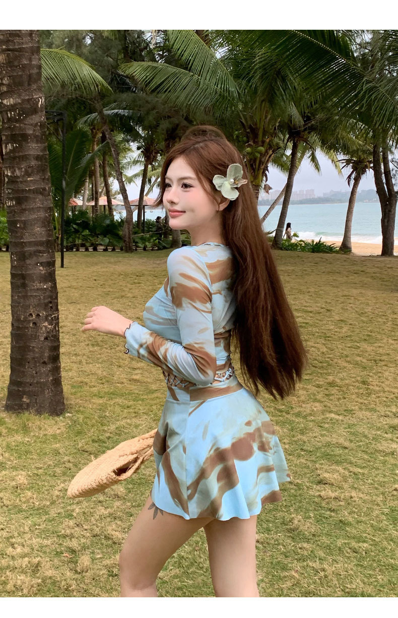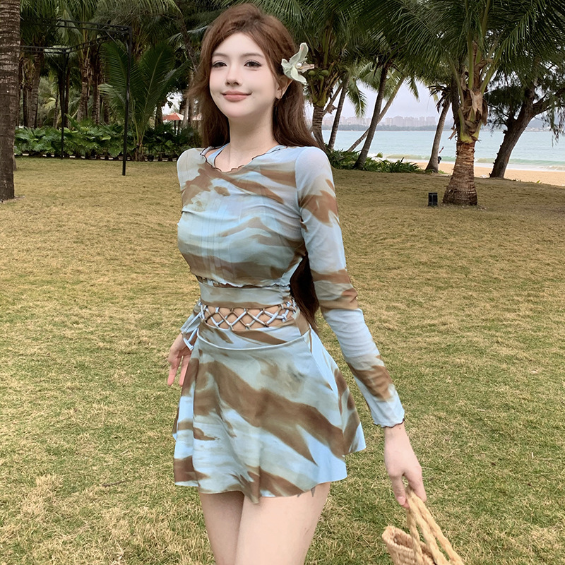 여성용 수영복 2025 새로운 여름 스타일 하이 엔드 중공 원피스 스커트 스타일 배 커버 슬리밍 보수적 인 긴팔 블라우스 투피스 세트