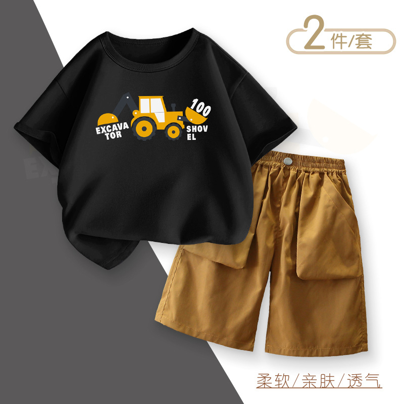 소년 여름 정장 2025 새로운 패션 다목적 반팔 티셔츠 작업복 큰 주머니 반바지 소년 투피스 세트