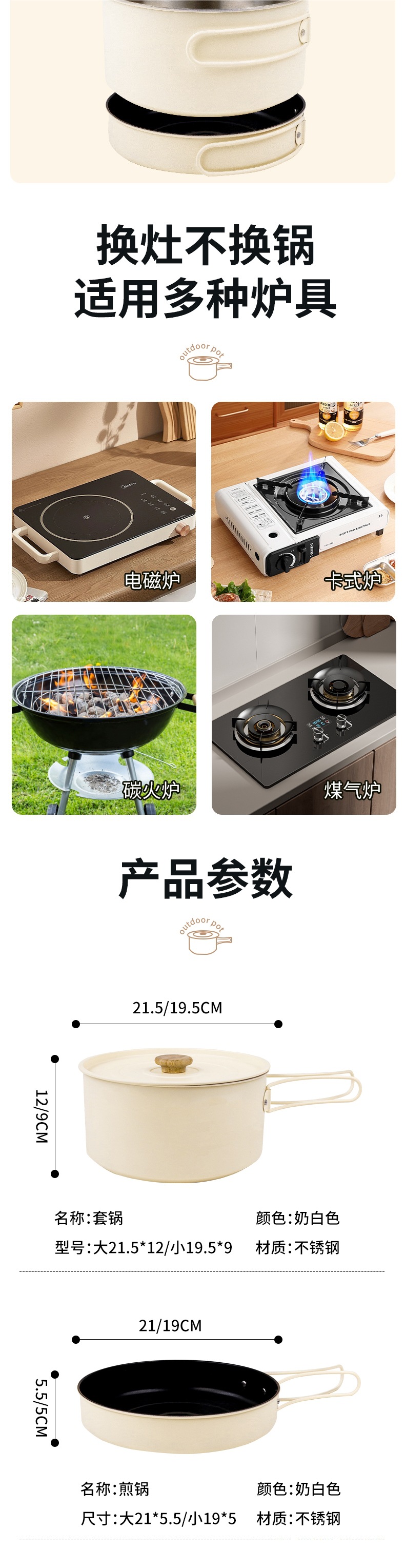 • [캠핑세트 304종] 대형 냄비 + 중형 냄비 + 중형 프라이팬 + 대형 프라이팬 + 1.1L 주전자
