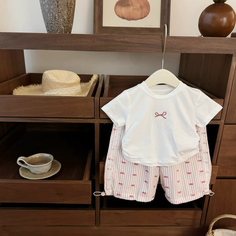 [라임] 슈퍼 스위트 쿨 한국 아동복 소녀 여름 보우 티셔츠 세련된 파우더 오버홀 세련된 세트