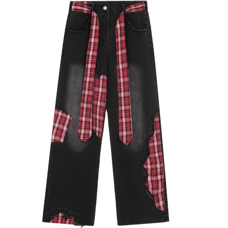 달콤한 쿨 소녀의 격자 무늬 콜라주 넓은 다리 청바지 여성용 블랙 워시 높은 허리 쿨 핸섬 느슨한 복용량 캐주얼 바지스토어 가기