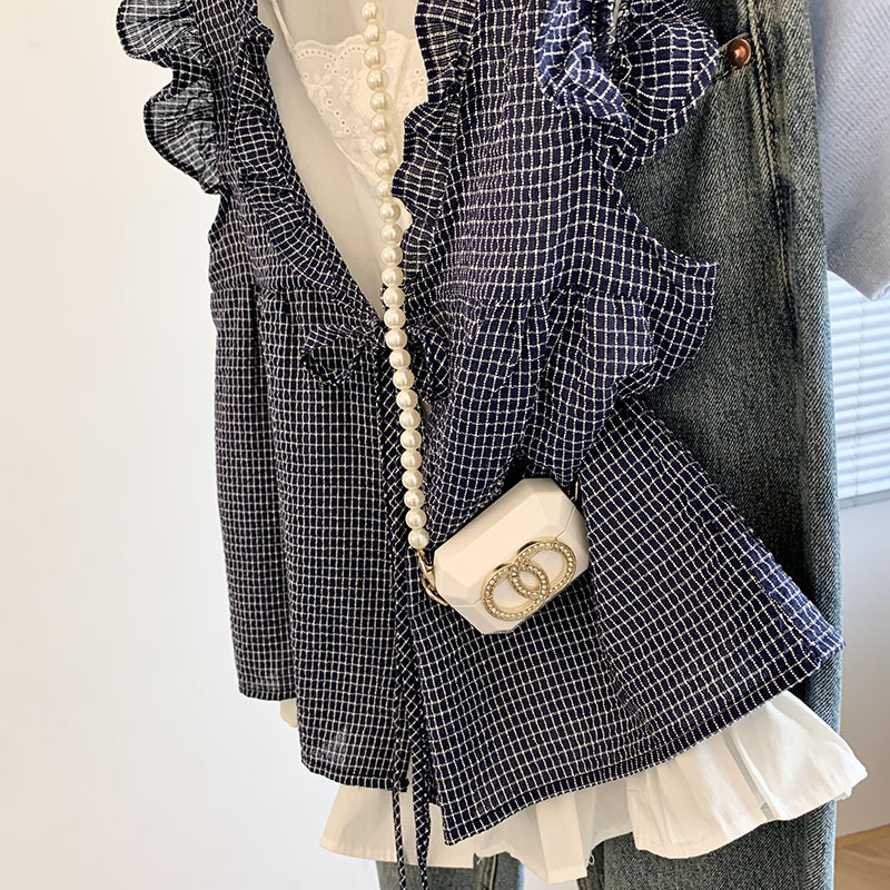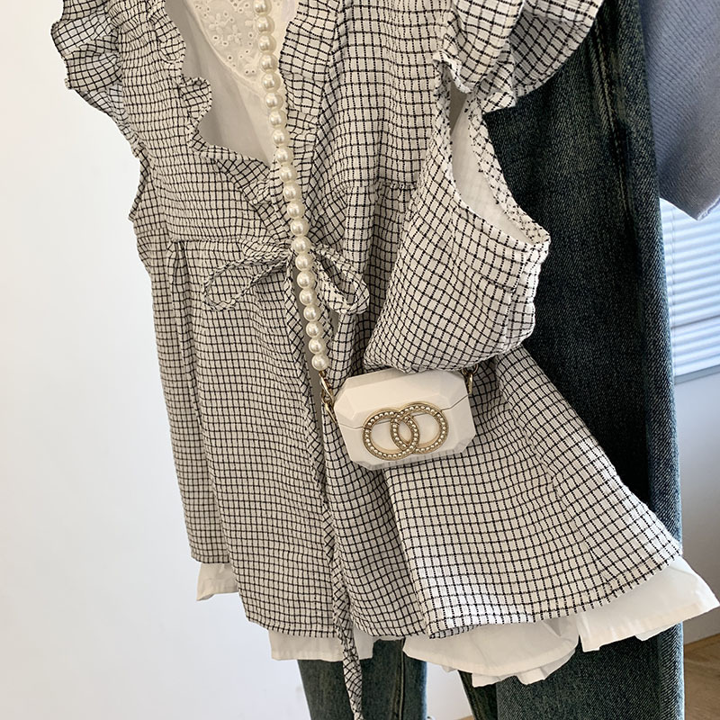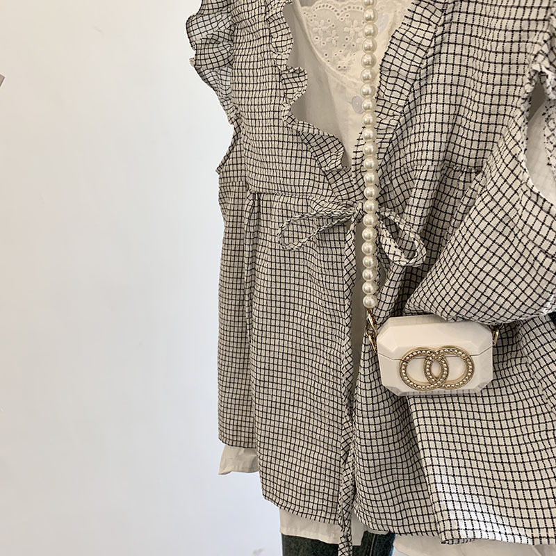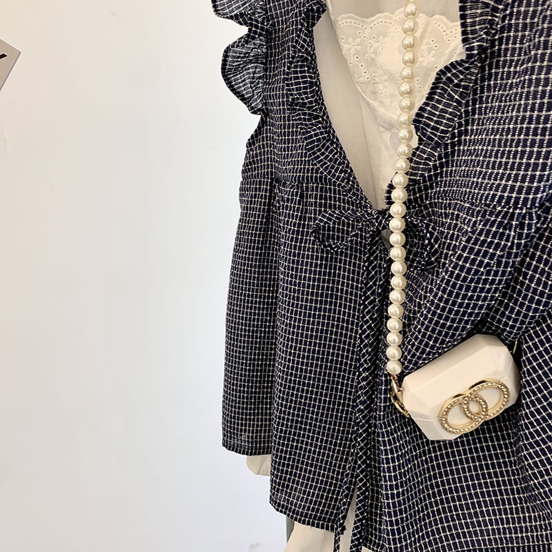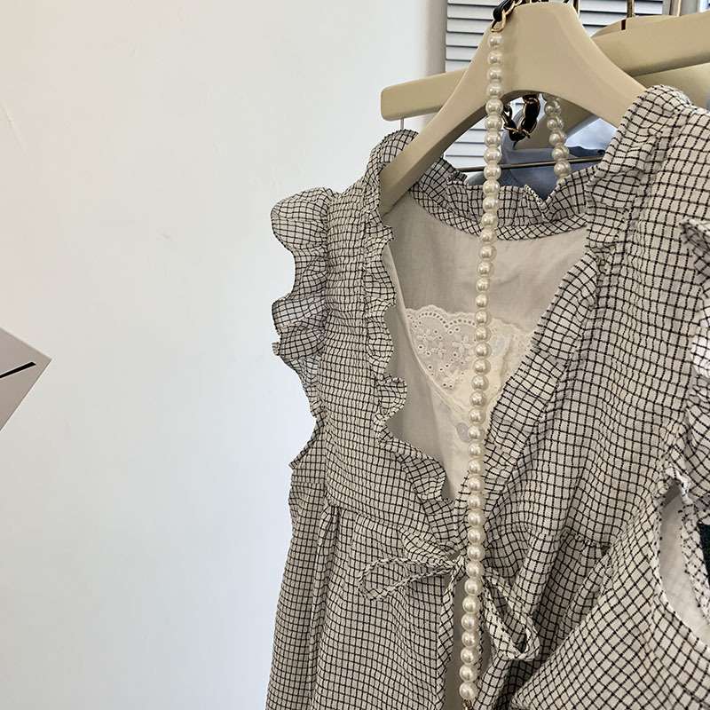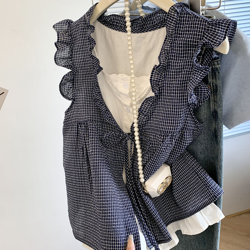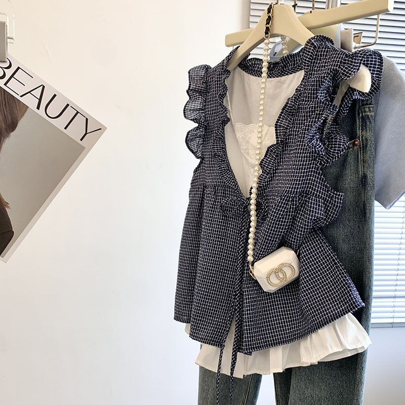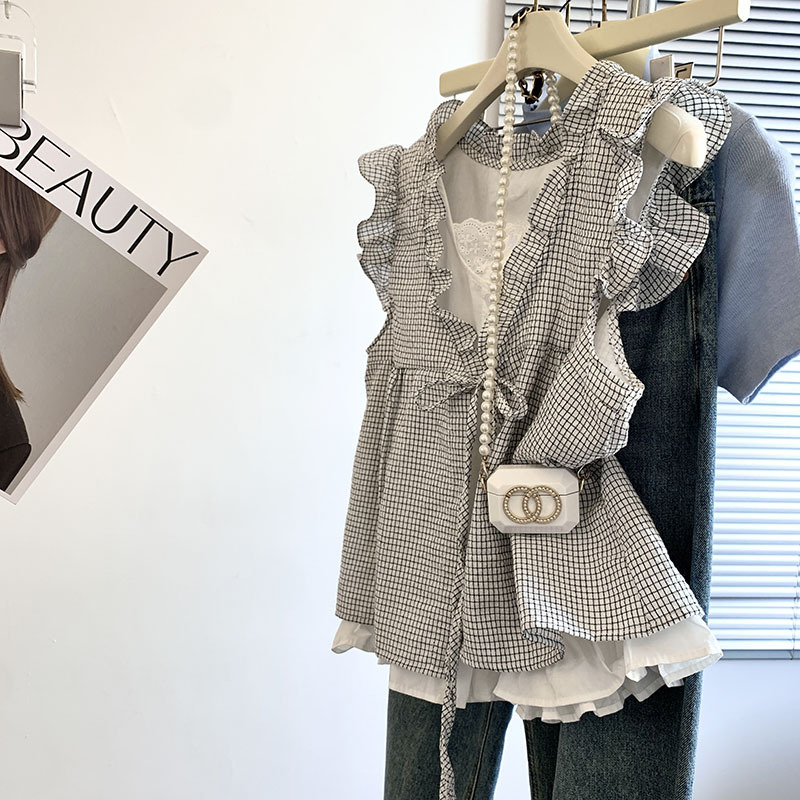 리얼 샷 한국 스타일 격자 무늬 가짜 투피스 셔츠 여성용 여름 귀 가장자리 나이 감소 느슨한 민소매 인형 셔츠 조끼 탑
