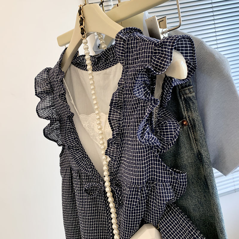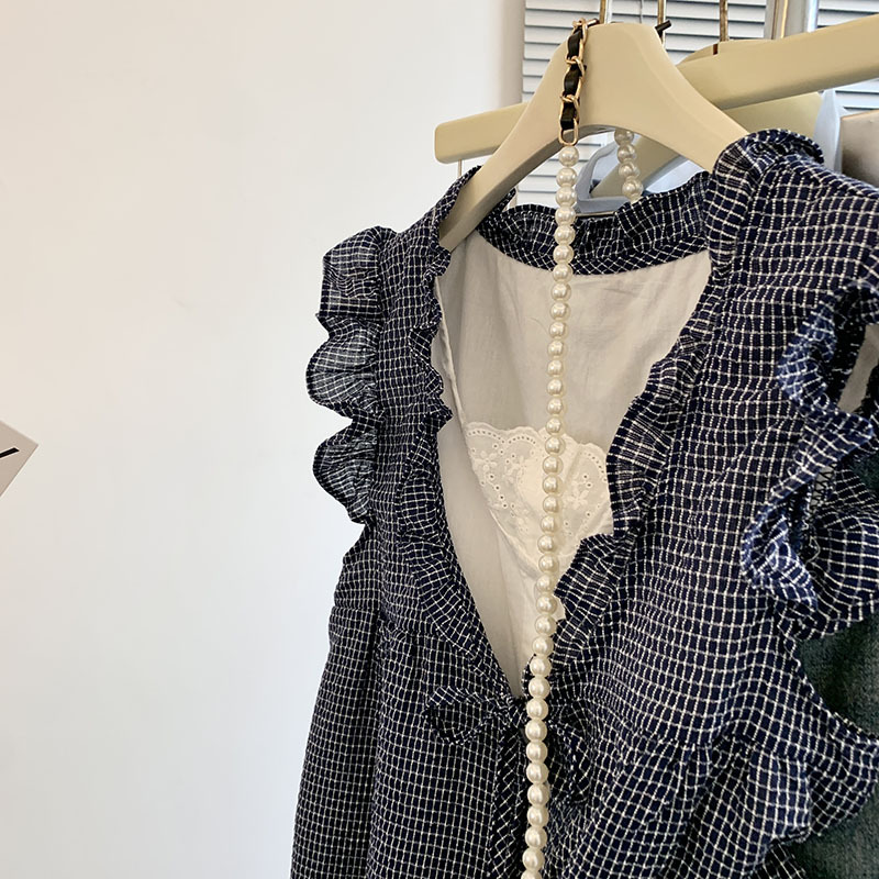 实拍韩系格子假两件衬衫女夏季木耳边减龄宽松无袖娃娃衫背心上衣