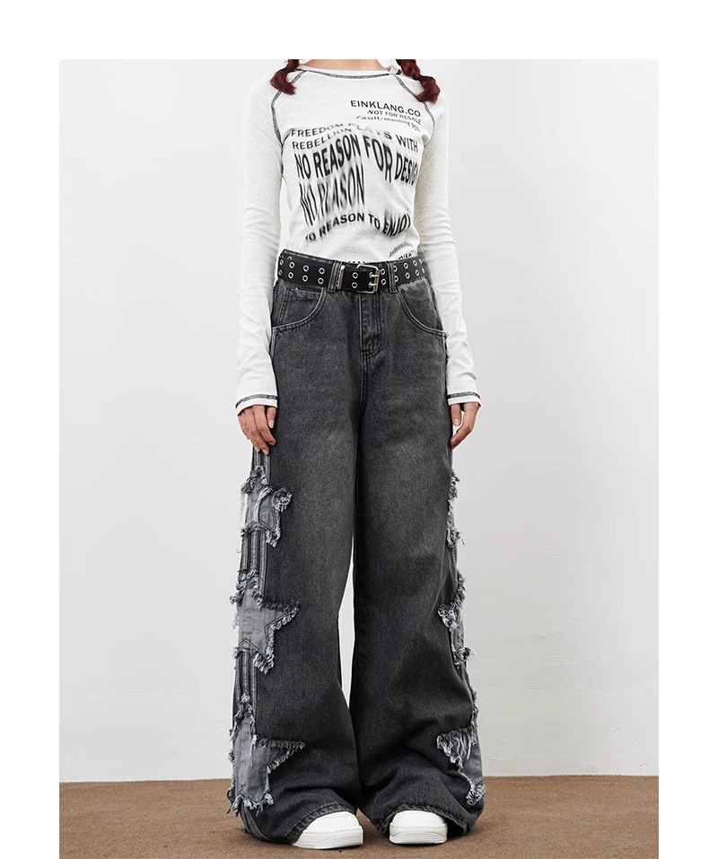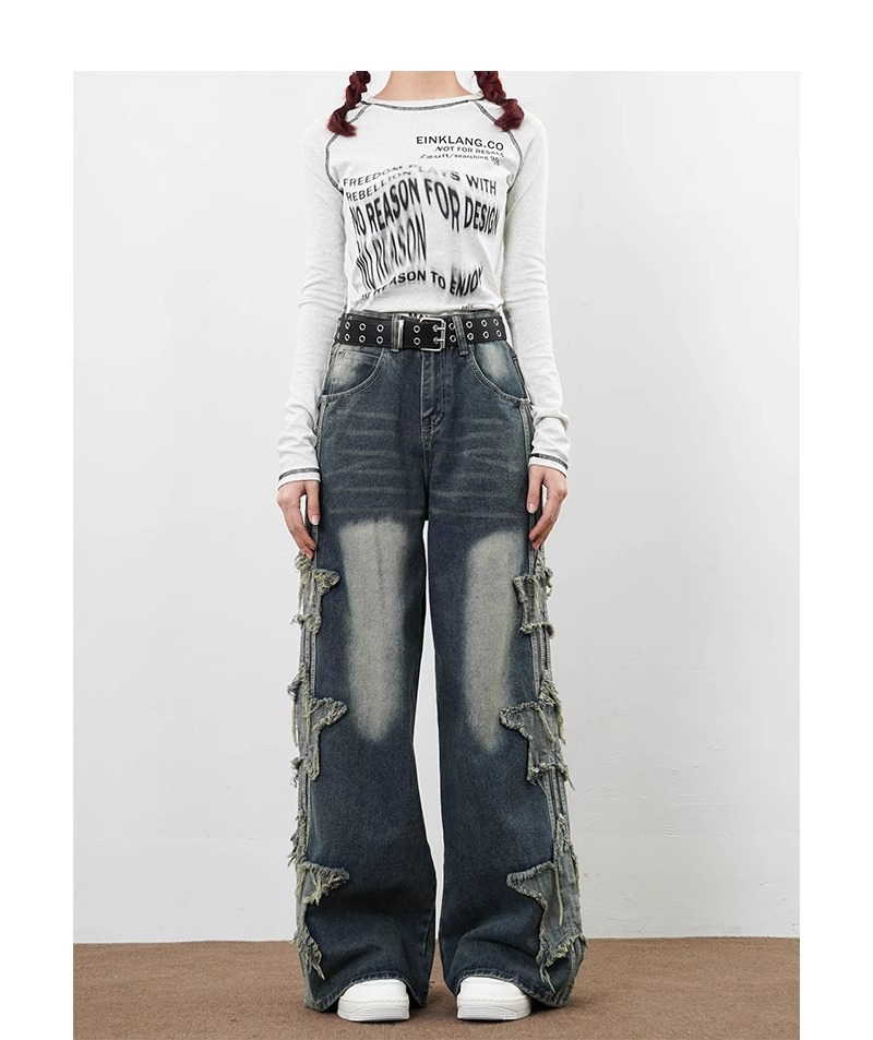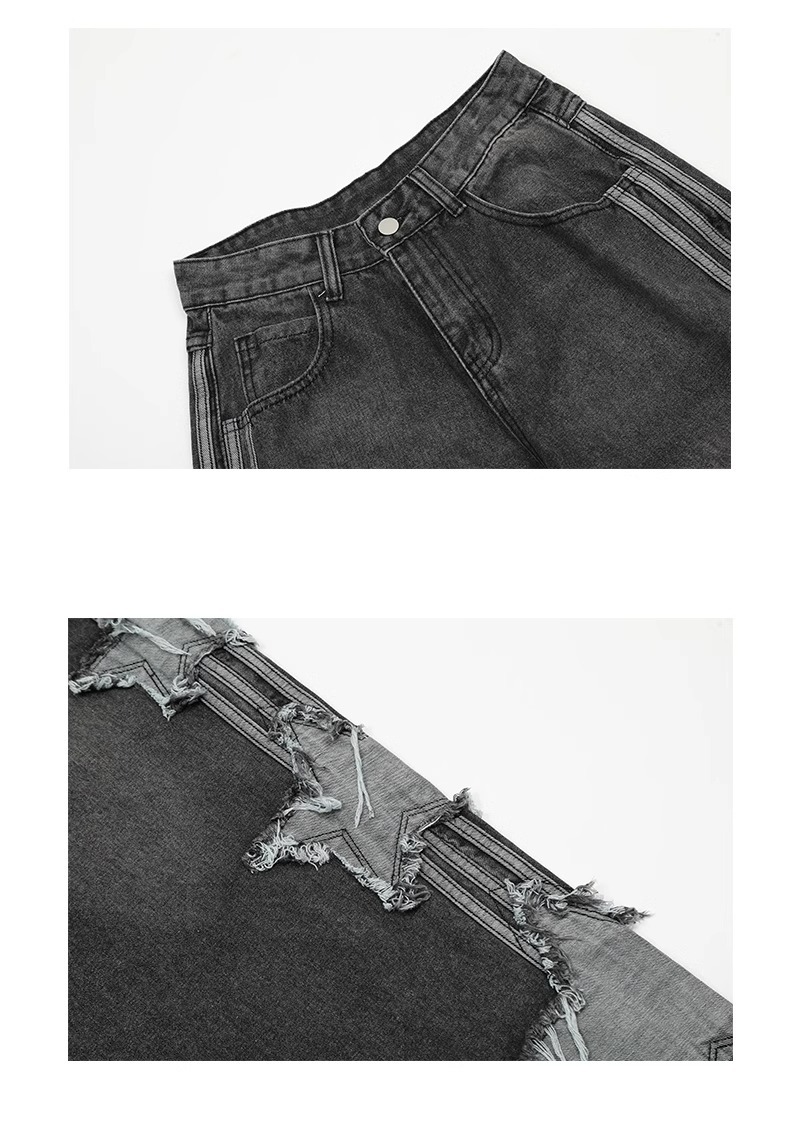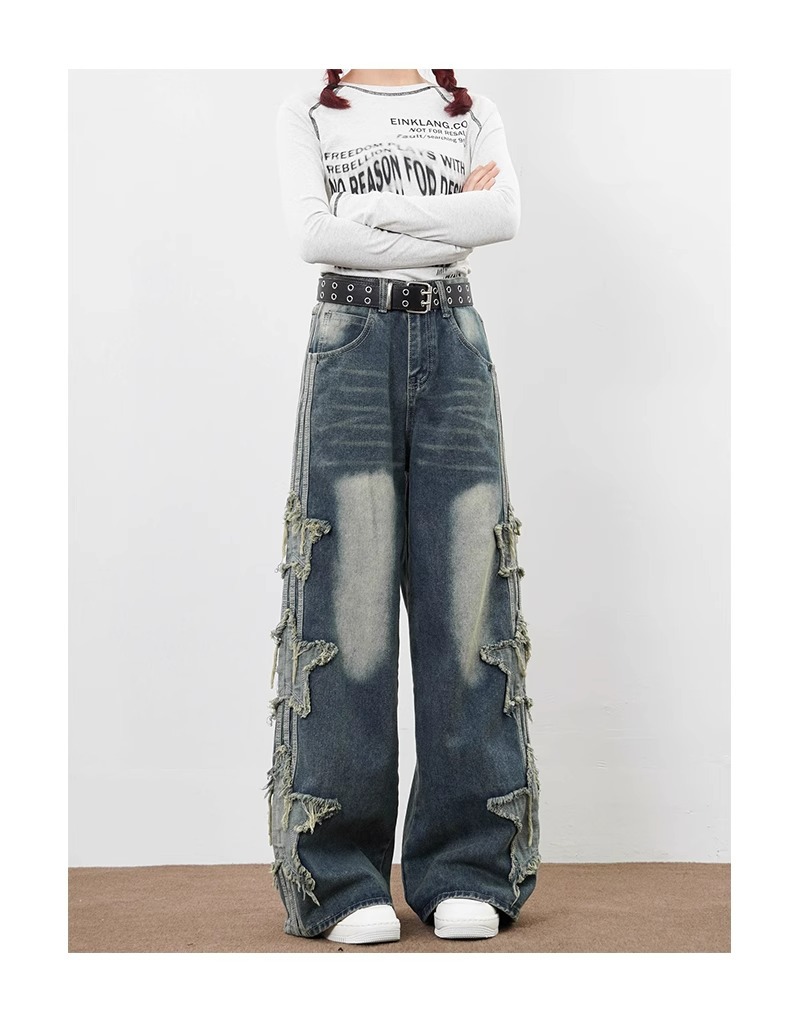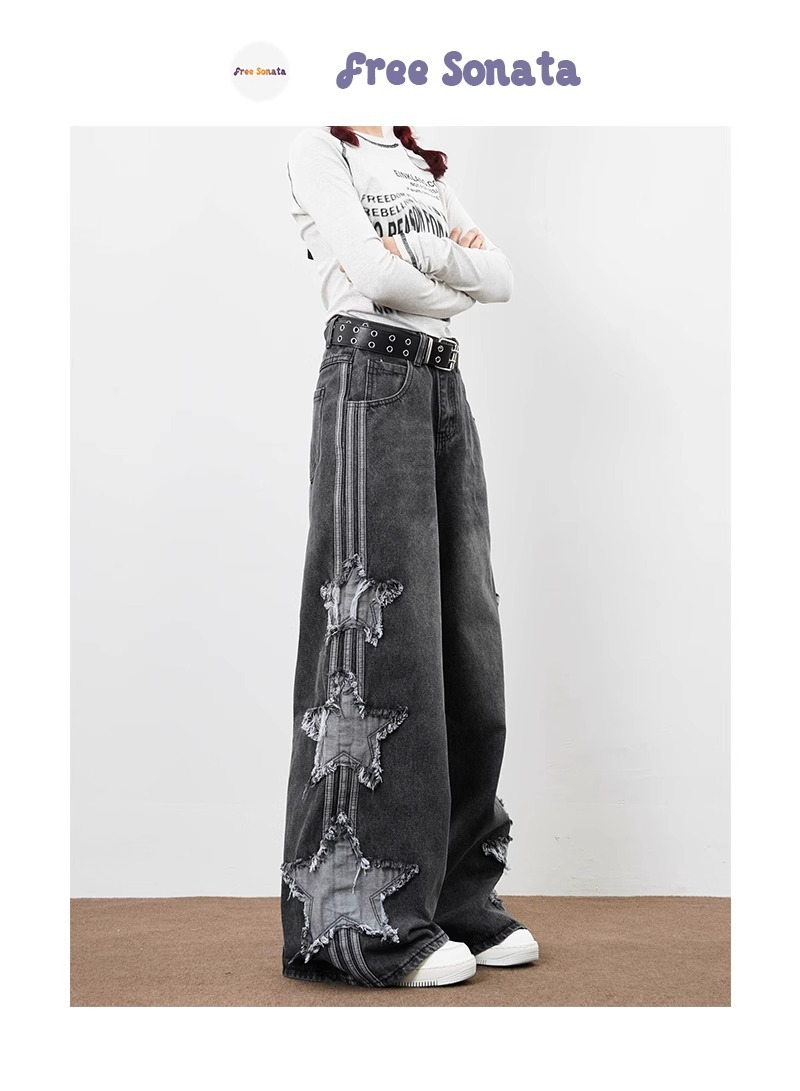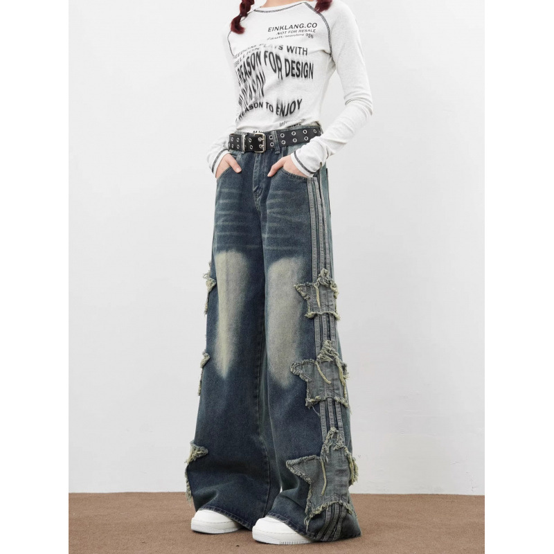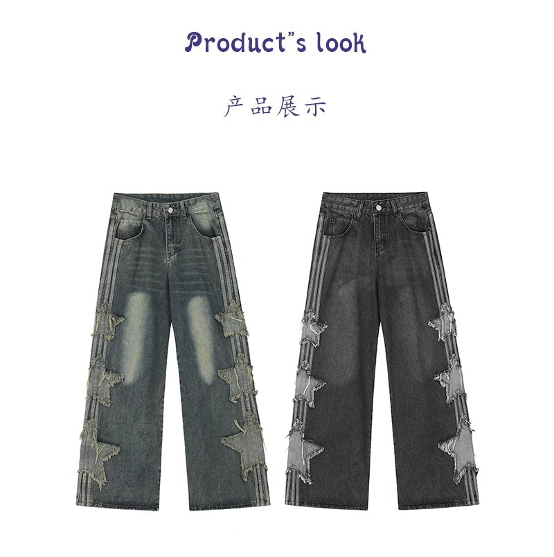 아메리칸 하이 스트리트 스타 패치 청바지 남성 여름 신작 루즈 스트레이트 드레이프 트렌디 브랜드 와이드 레그 바닥 길이 바지스토어 가기