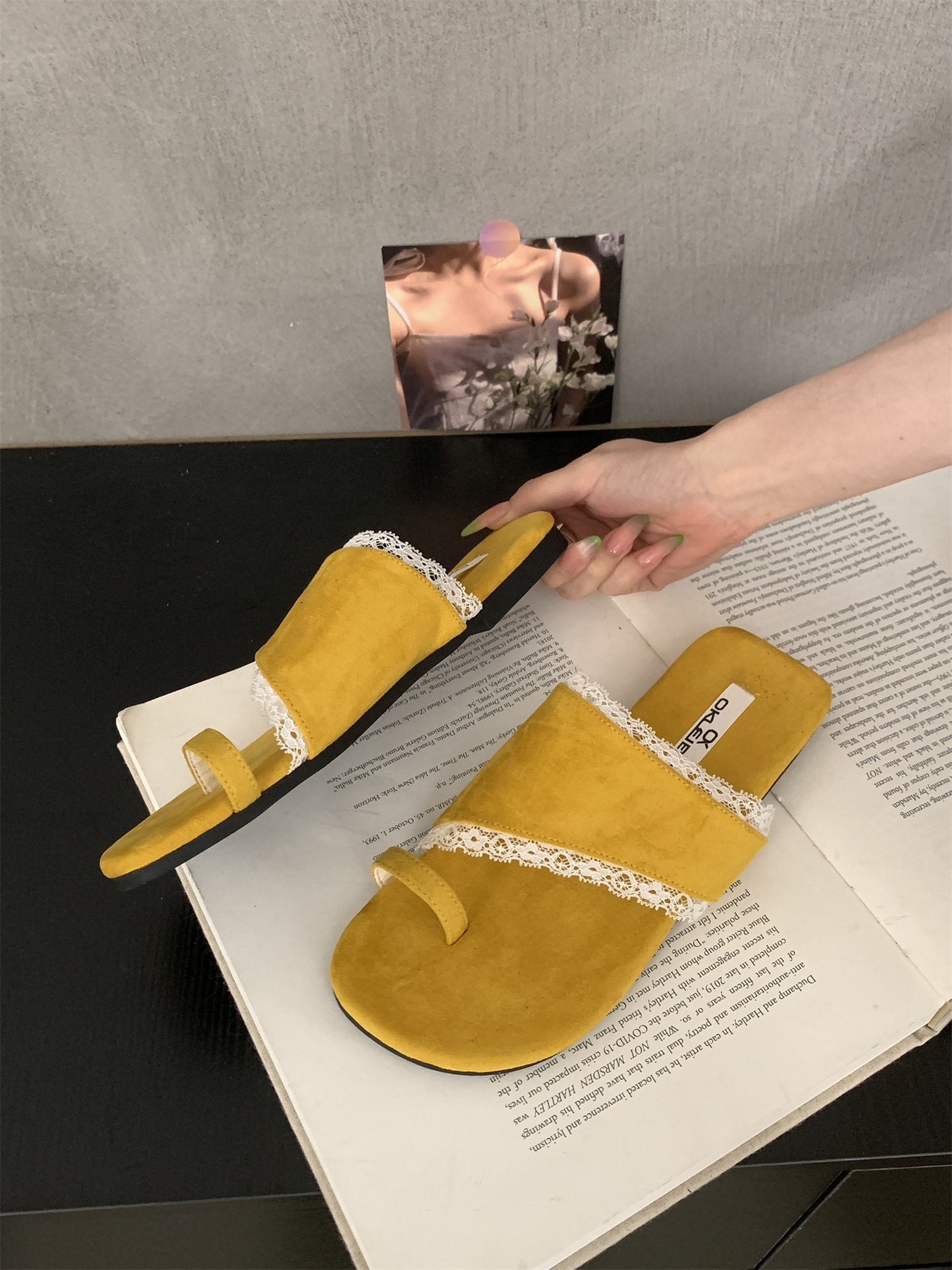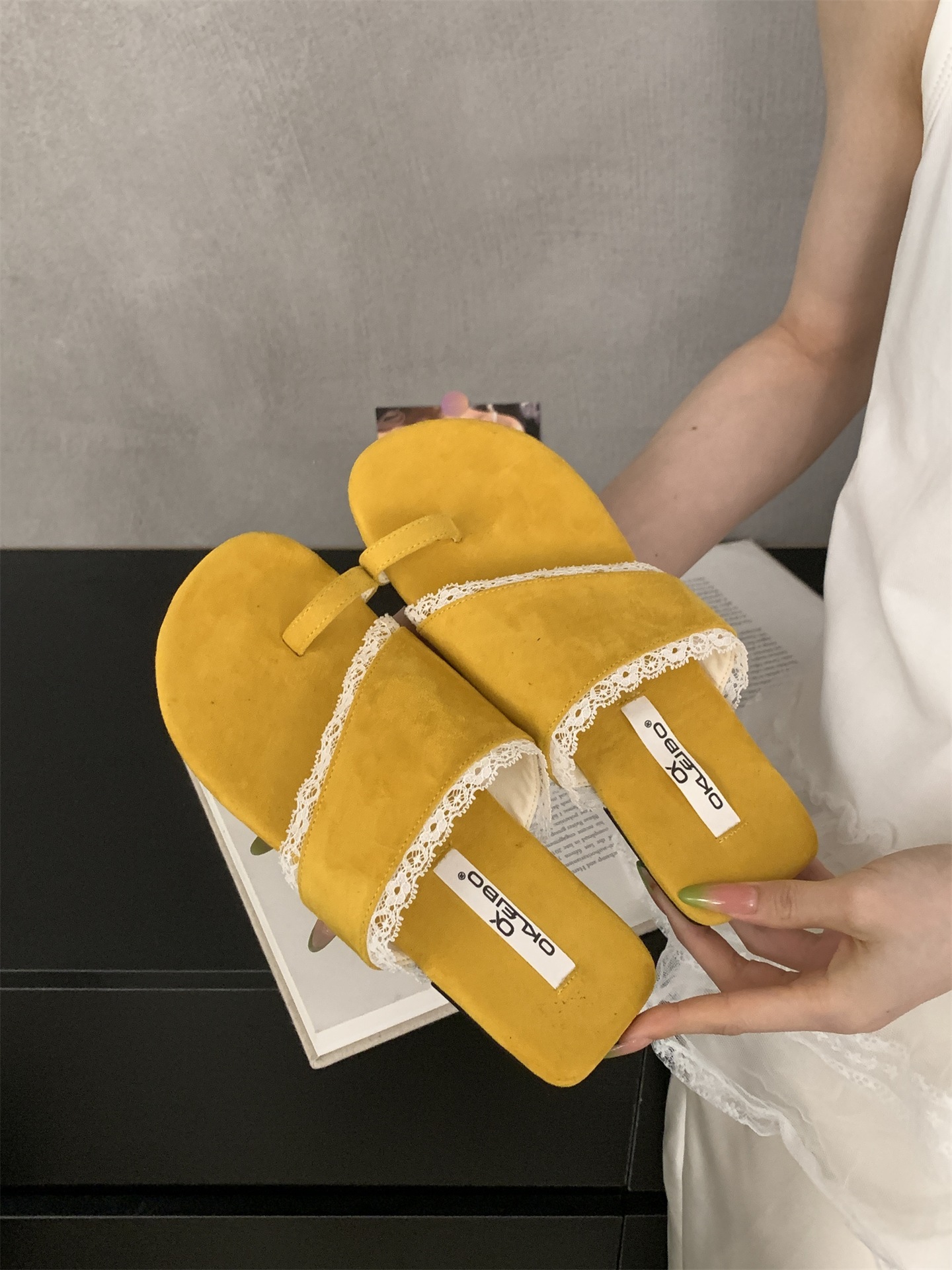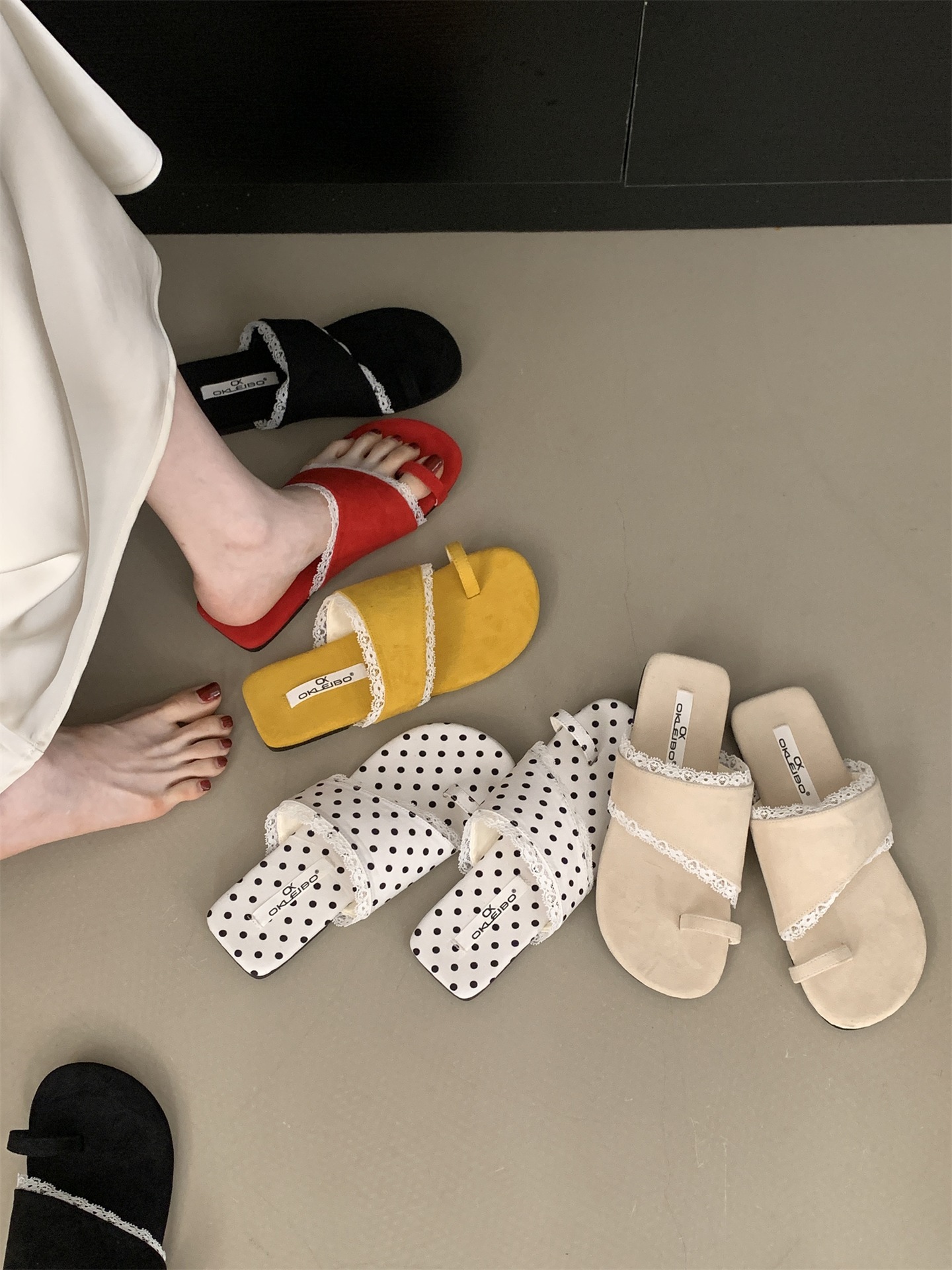 여성용 여름 아우터웨어를위한 플랫 폴카 도트 레이스 슬리퍼 2025 여성용 새로운 비치 슈즈 홀리데이 스타일 스웨이드 샌들스토어 가기