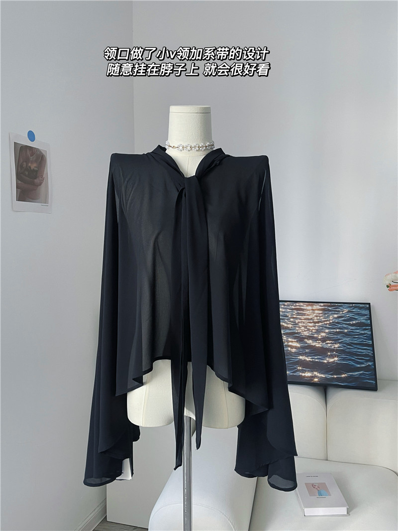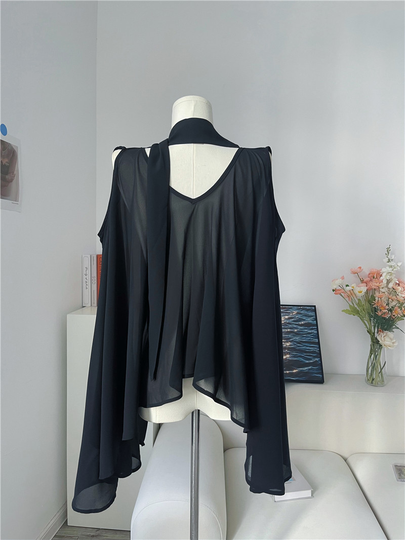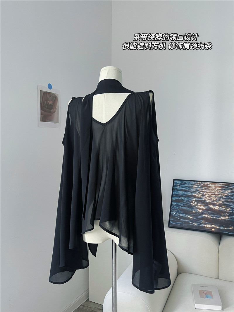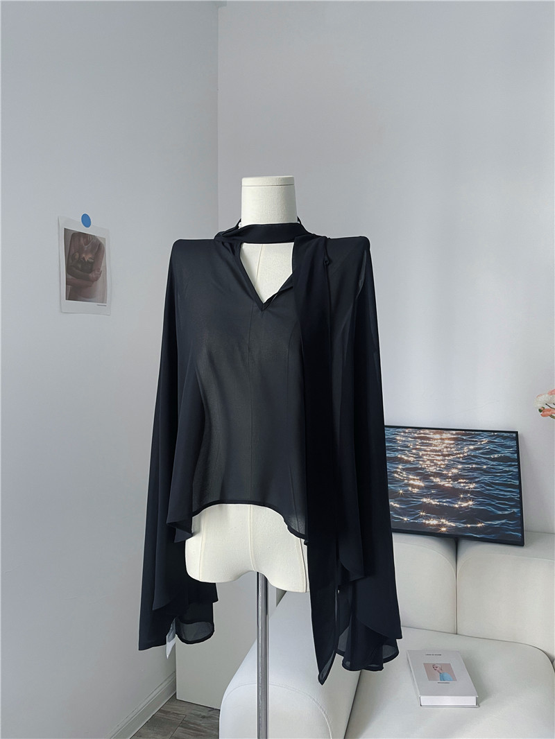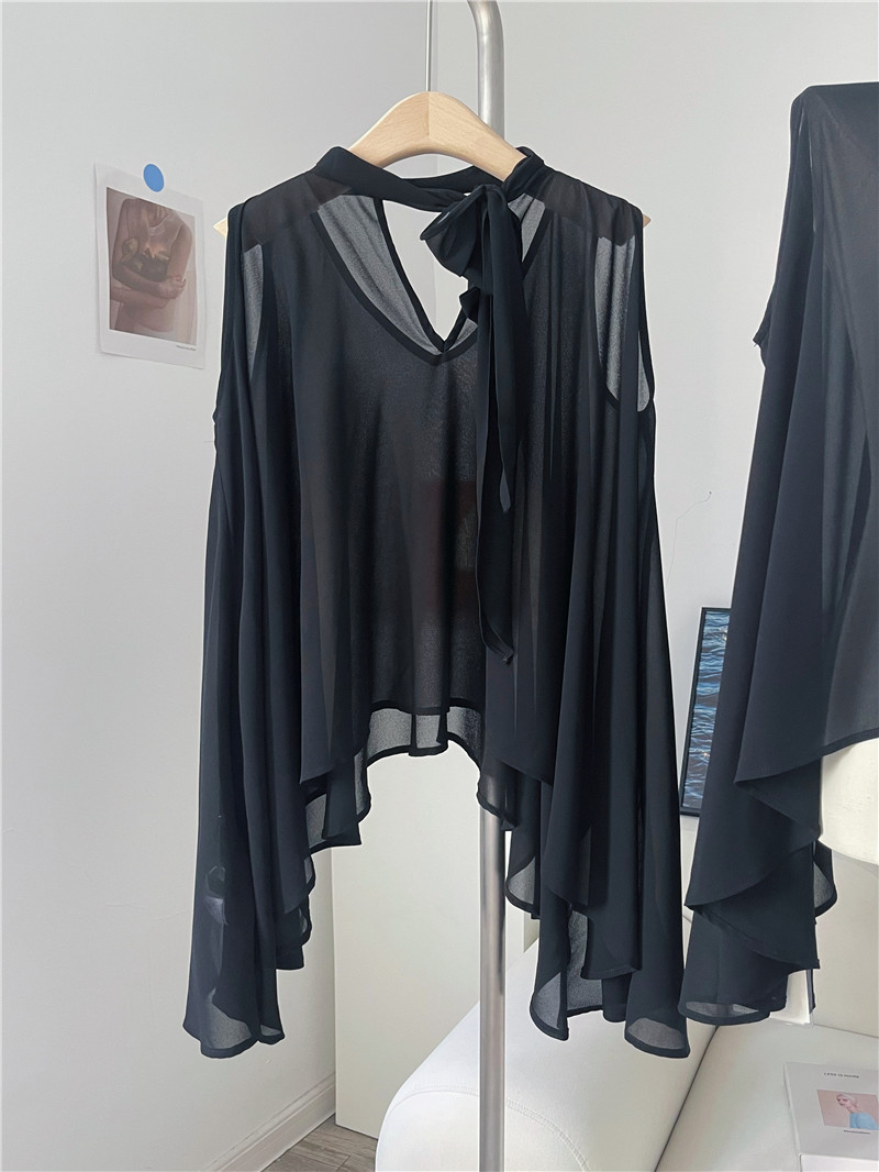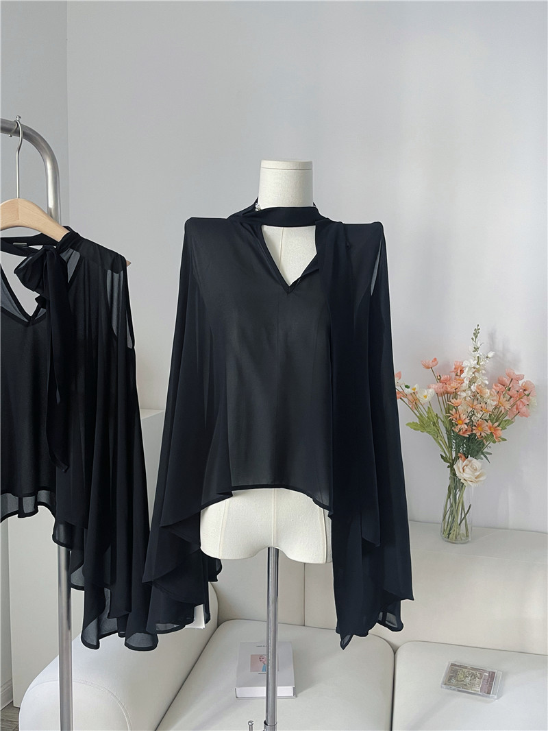 시폰 셔츠 여성 여름 2023 새로운 프랑스 스타일 순수한 욕망 달콤한 스파이스 소녀 느슨한 빈 빈 목 민소매 탑