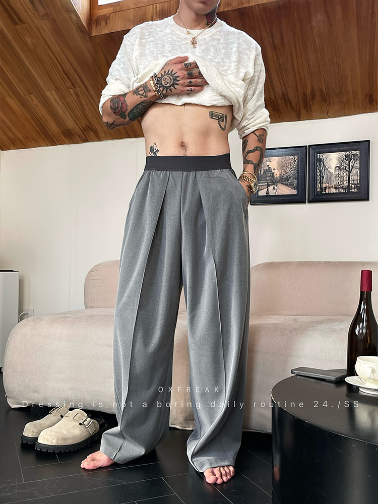 공장 직접 공급 "새우 라인 싱글 주름 넓은 처짐 느낌" 대비 컬러 탄성 허리 캐주얼 바지 남성용 두꺼운 느슨한 바지