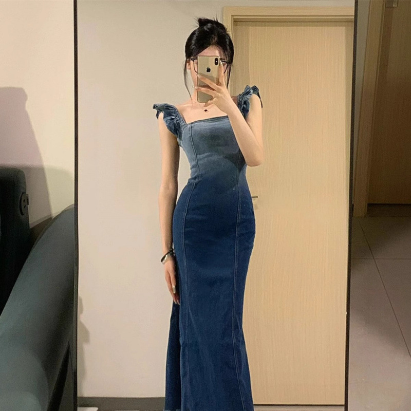 2025夏季新款辣妹渐变小飞袖牛仔连衣裙女设计感收腰显瘦气质长裙스토어 가기