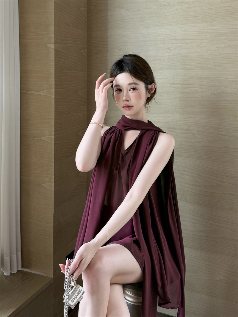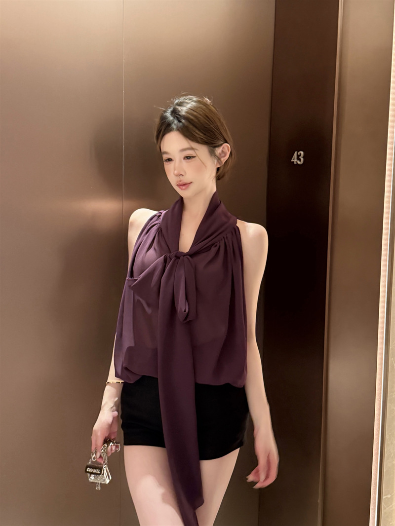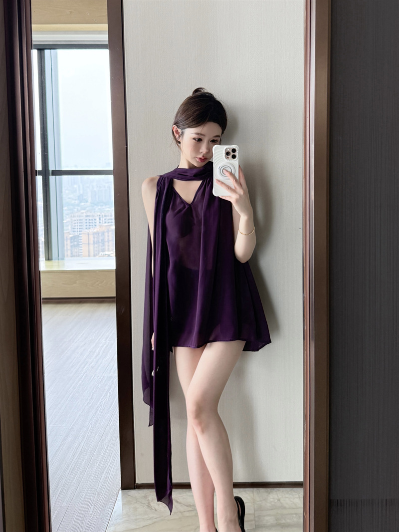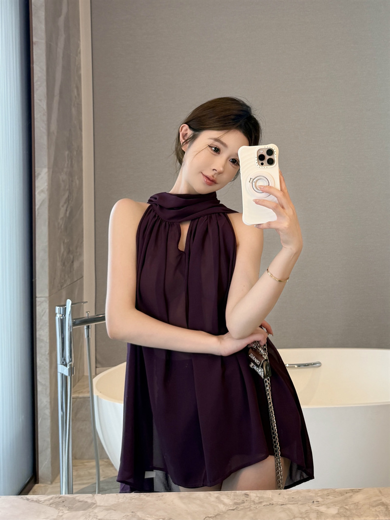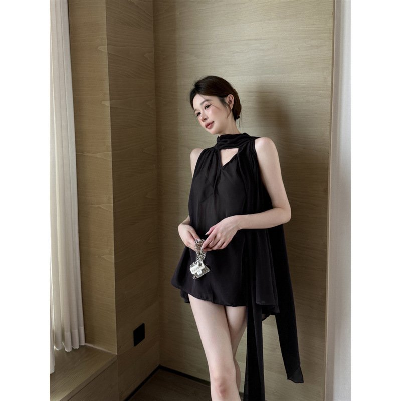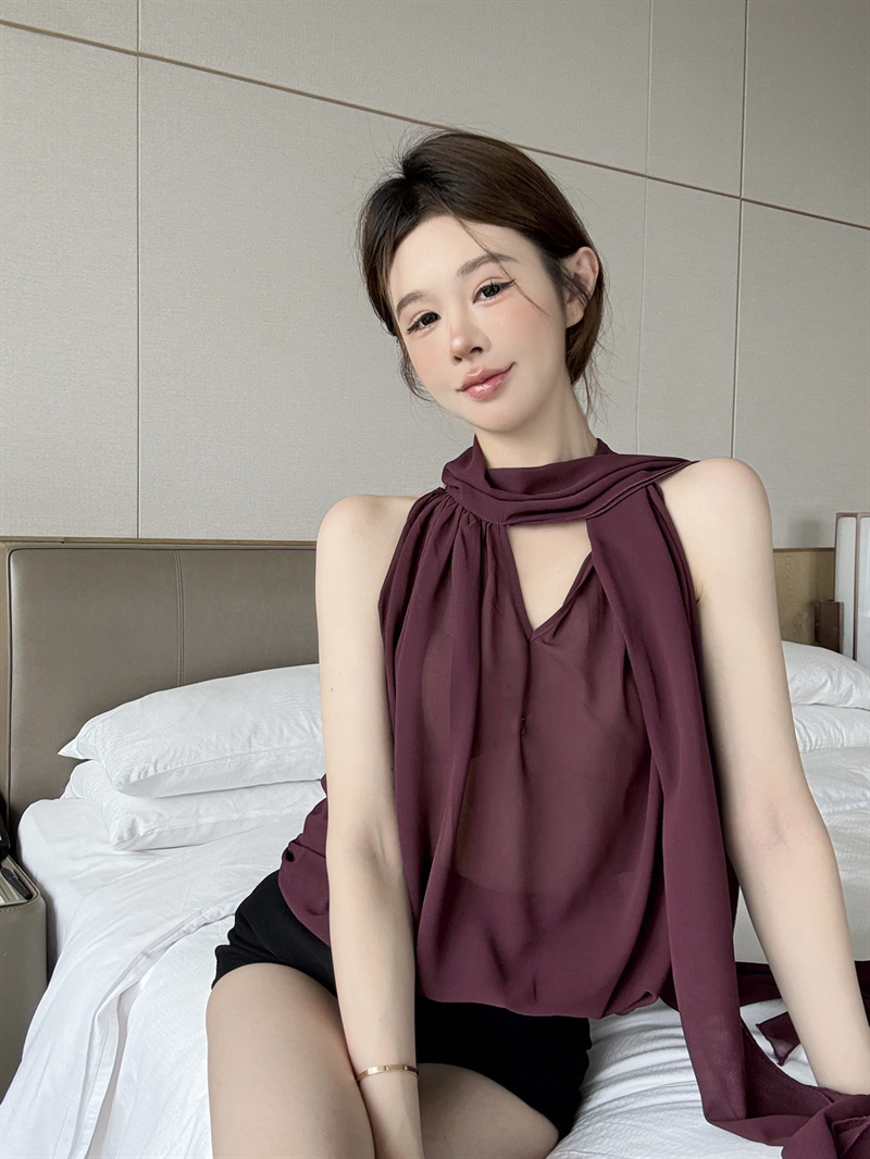리얼 샷 여름 순수한 욕망 크루 넥 바느질 느슨한 중간 길이 웨스턴 스타일 민소매 양면 풀오버 시폰 셔츠스토어 가기